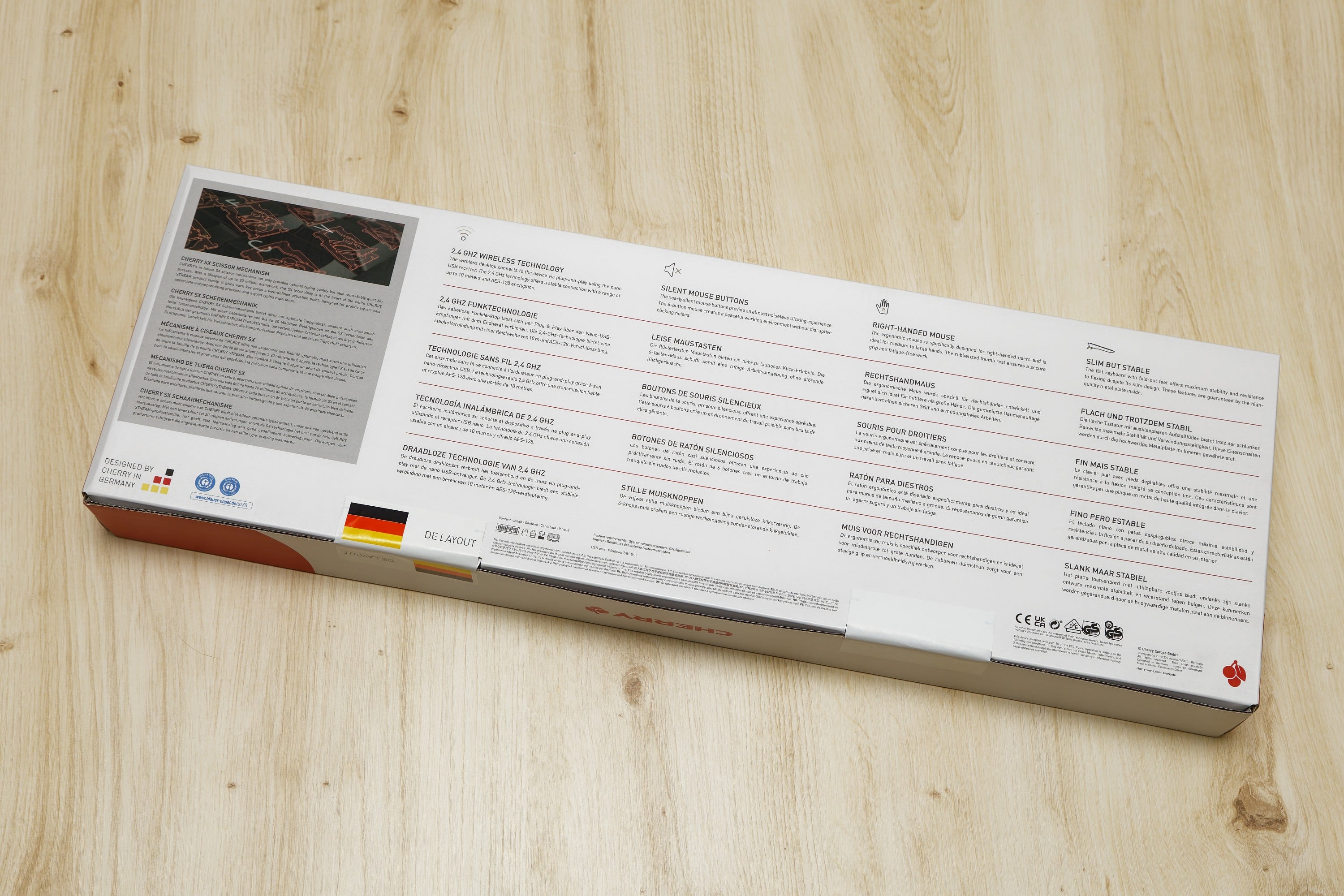 I really like the packaging of the Cherry Stream Desktop Comfort Set in this test. At first glance, the packaging is nothing special, but you can tell that there is a certain weight behind it. The box is secured with a few strips glued over the flaps, one of which has the German flag to visualize the German layout. These are a little difficult to cut to get to the flaps, but with a knife it’s no problem.