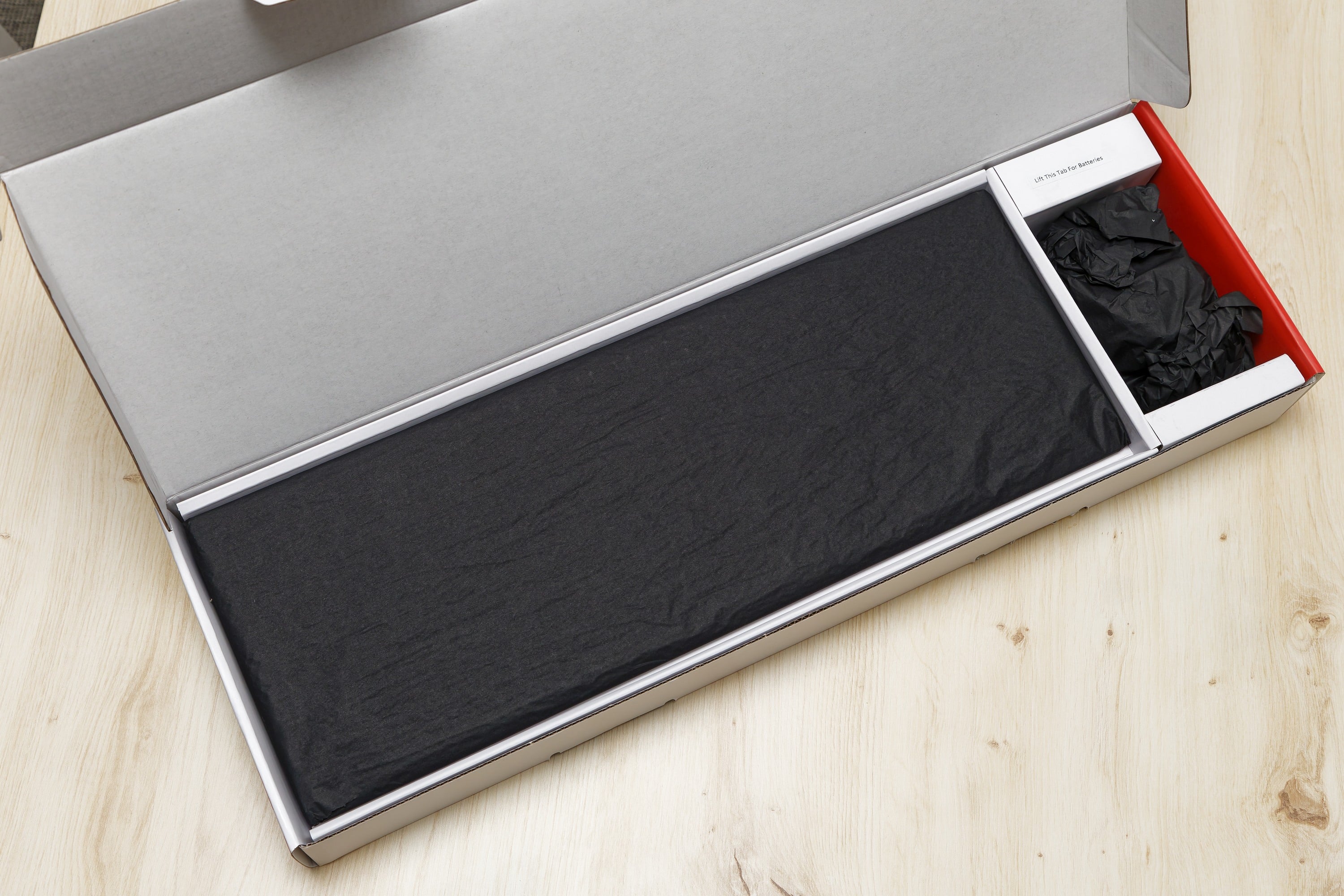 The nice thing about the packaging is that there is no plastic at all. The keyboard, mouse and supplied batteries are wrapped in black paper, where most other manufacturers use foil. This not only makes a special impression, but is also better from a recycling point of view.