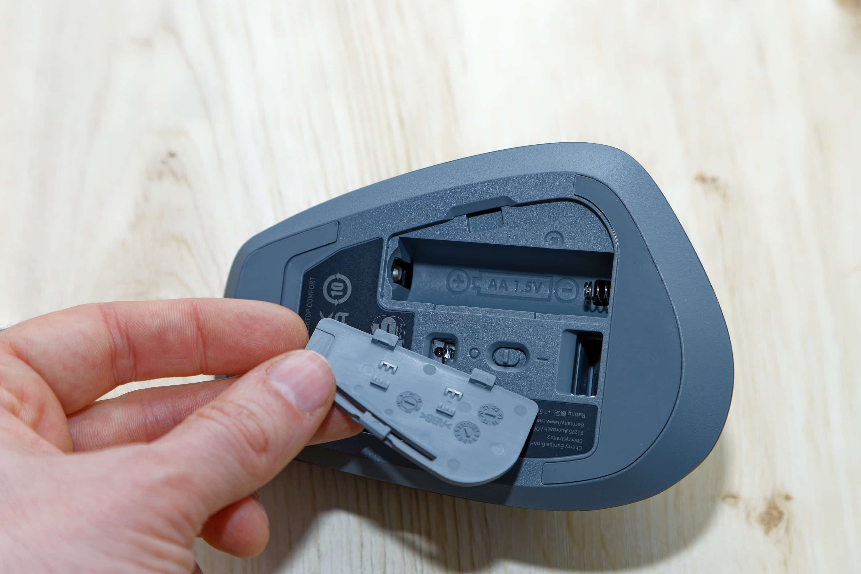 As far as the batteries are concerned, standard AA batteries are used. This means you don’t have to worry that a defective integrated rechargeable battery will render the Cherry Stream Desktop Comfort Set useless at some point: you can simply replace the batteries. Non-rechargeable 1.5 V batteries are supplied. It is therefore not surprising that the keyboard itself has no charging function and no (USB) cable connection. When the batteries are empty, they have to be removed and replaced.