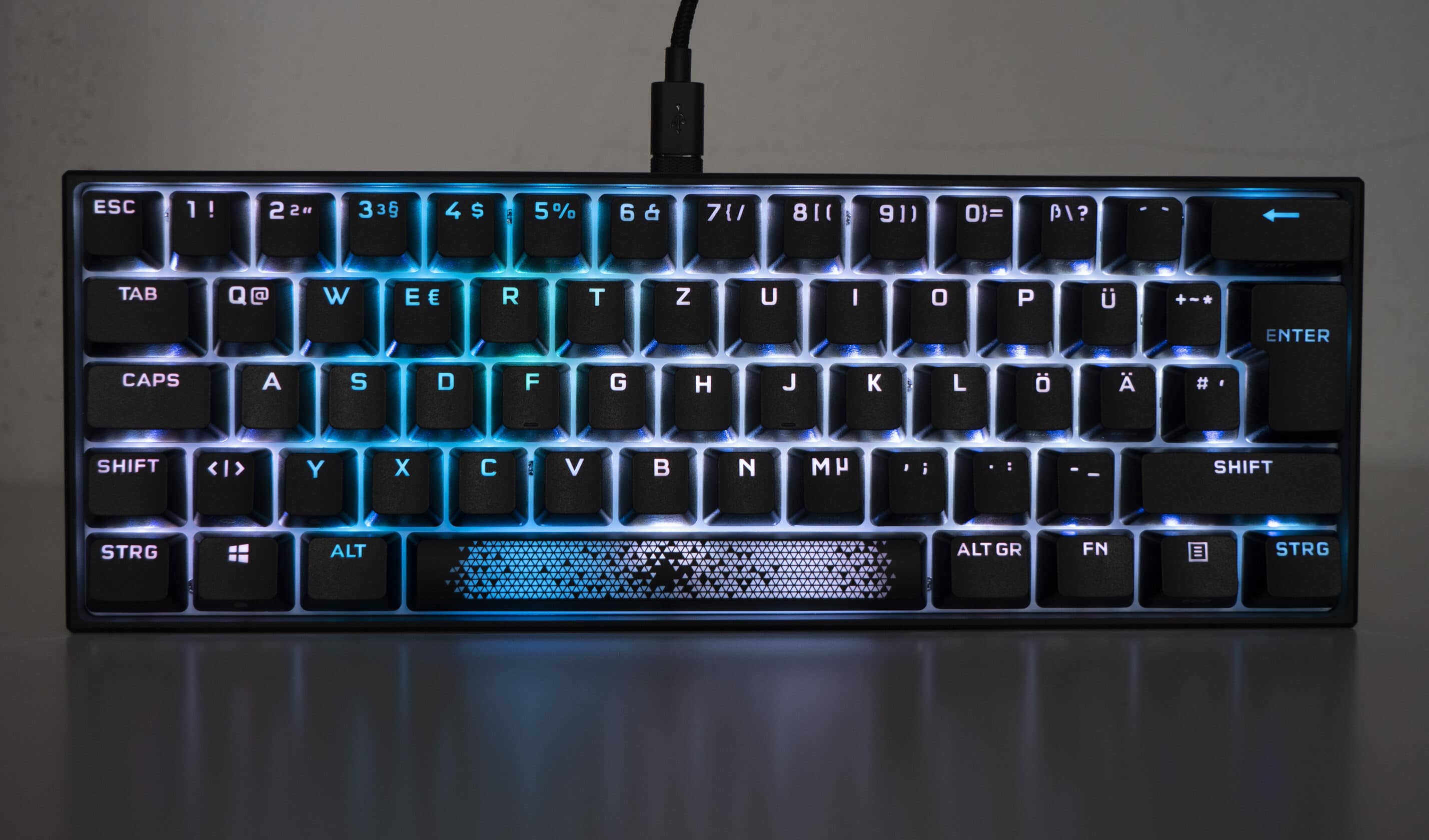 From the outside, the Corsair K65 RGB Mini looks neat and despite its size, it’s an eye-catcher on any desk and any gaming setup, no matter how shiny. We especially liked the look with the included cap for the spacebar, which features a pattern consisting of many small triangles.