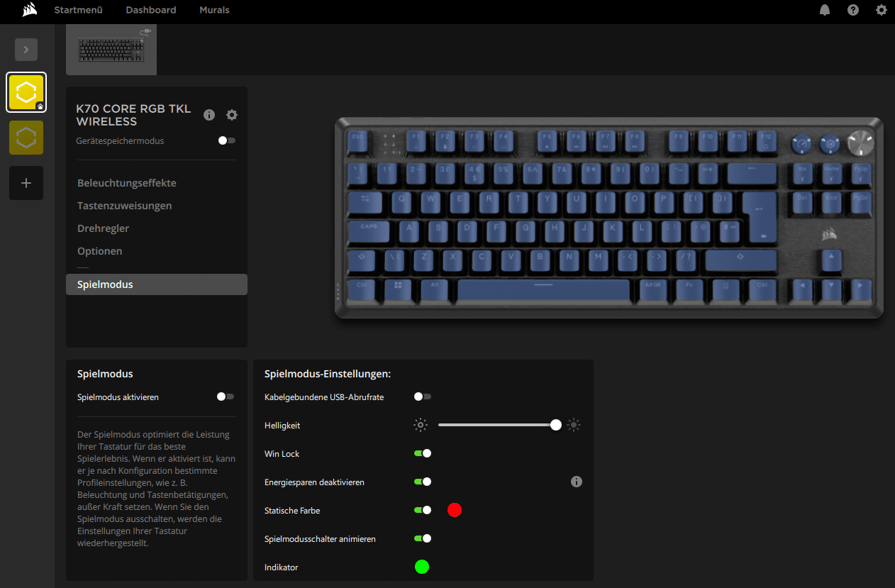 We can also switch on a gaming mode for the gaming session with the Corsair K70 Core TKL Wireless RGB. You can decide which functions are switched off. If you use the keyboard with a cable despite the wireless function, you can also use different polling rates.