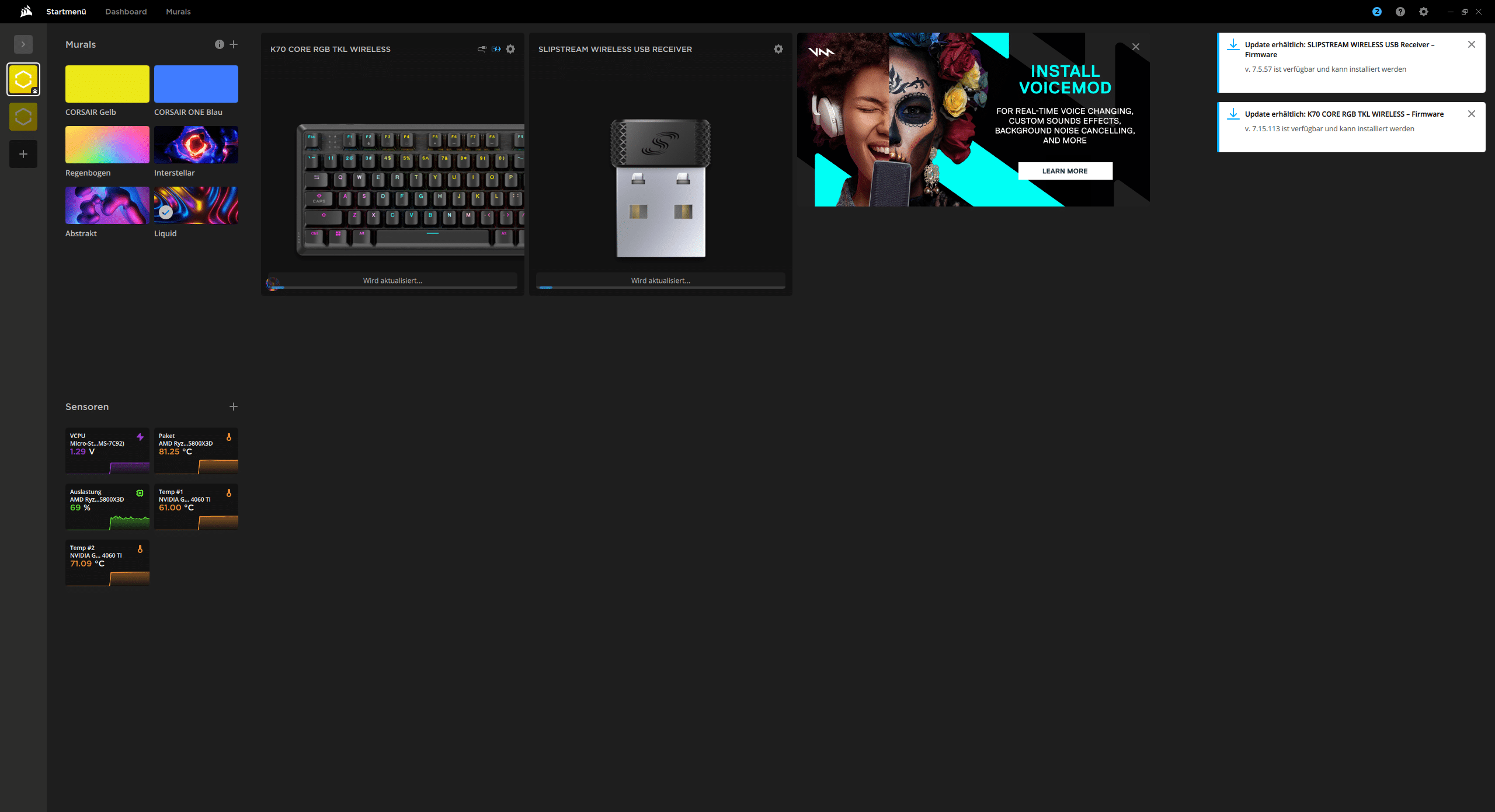 All current Corsair products use the iCUE software. Of course, you can make your own settings here, such as customizing the lighting. However, an important component nowadays is also carrying out updates. If updates are available, you will be notified immediately after opening them. These can be carried out with a single click.