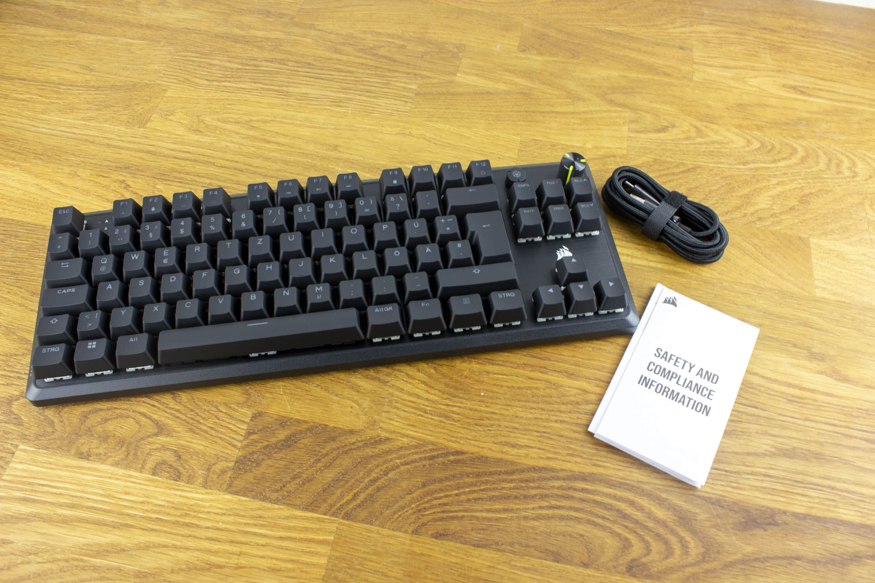 There are only minor differences between the boxes of the two keyboards. As the “Core” suffix suggests, the Corsair K70 Core TKL is limited to the functions and offers many extras. We can tell the size of the TKL version from the box and the size of the image on it. We don’t find more than the keyboard and the obligatory writing utensils in the box.