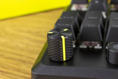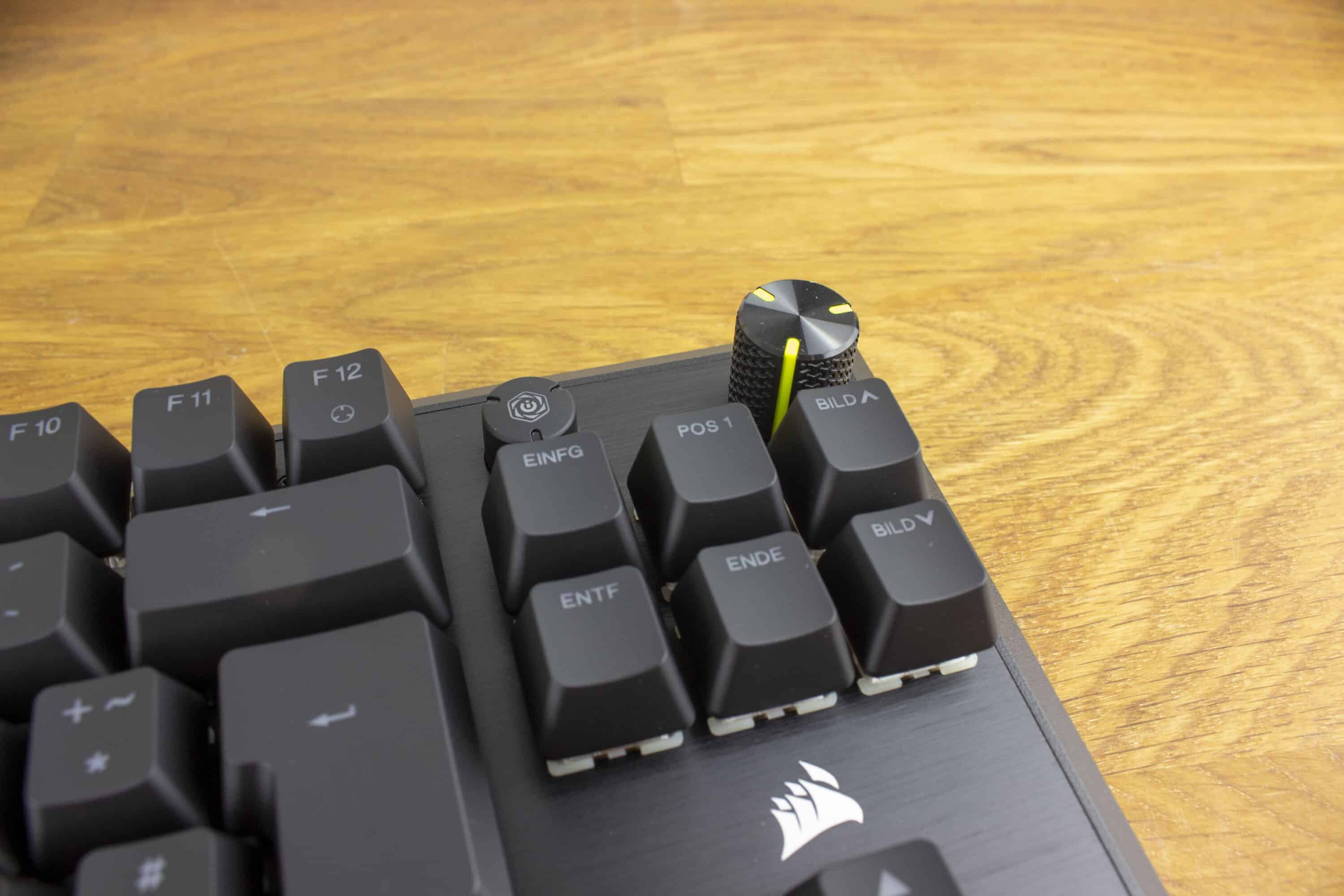 Both keyboards have a rotary control at the top right, which is used to adjust the volume in the standard setting. Only the wired model is slightly different in color. The accents there are yellow. Other than that, the K70 Core TKL Wireless only has a button for the game mode that Corsair calls Game Mode.