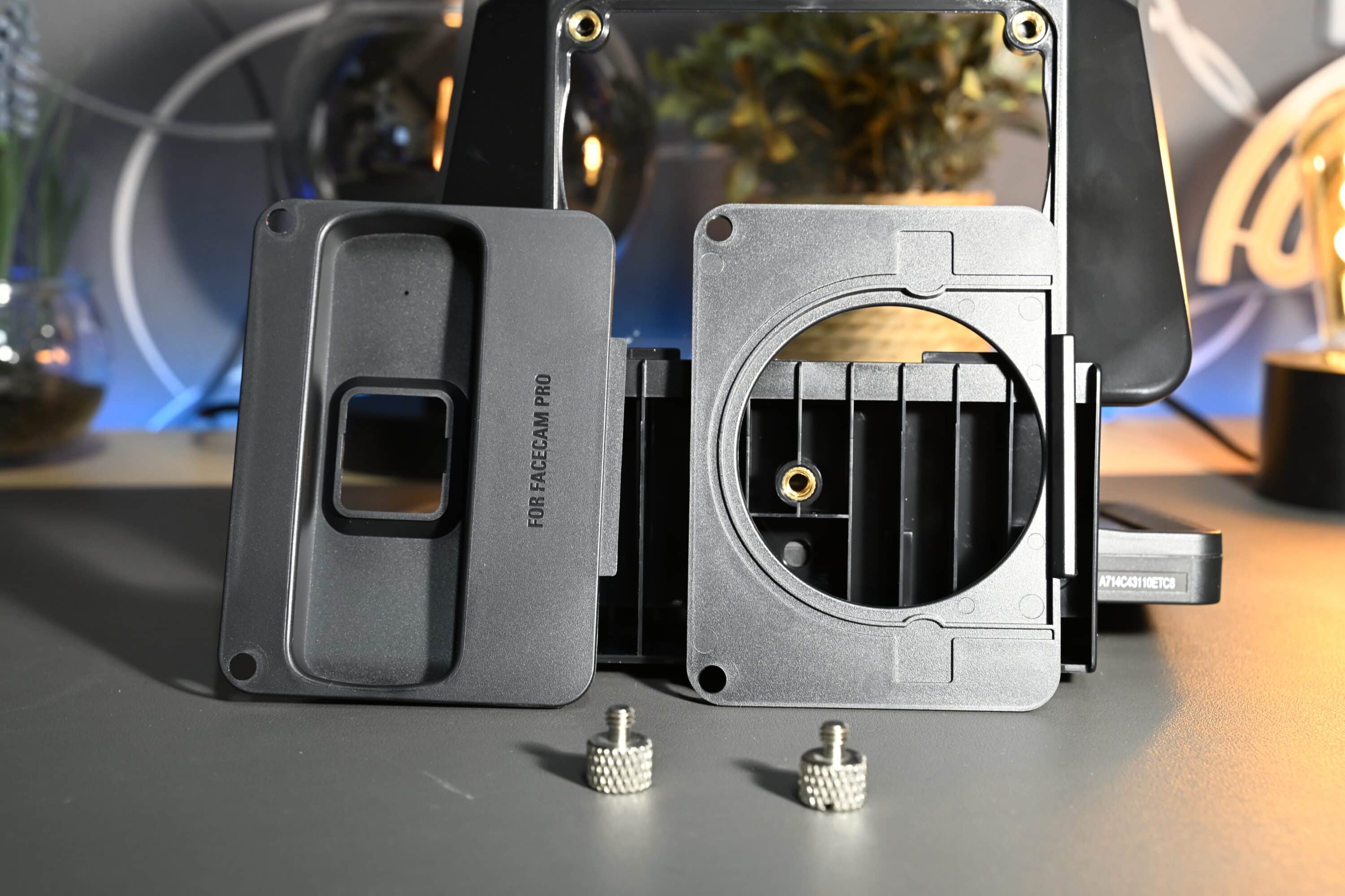 To ensure that this works, the manufacturer includes a whole range of accessories. The most important of these are the apertures for the rear. In addition to a Facecam Pro mount, there is a universal mount with a black cover cloth for various cameras, as well as a clip-on mount for system cameras.