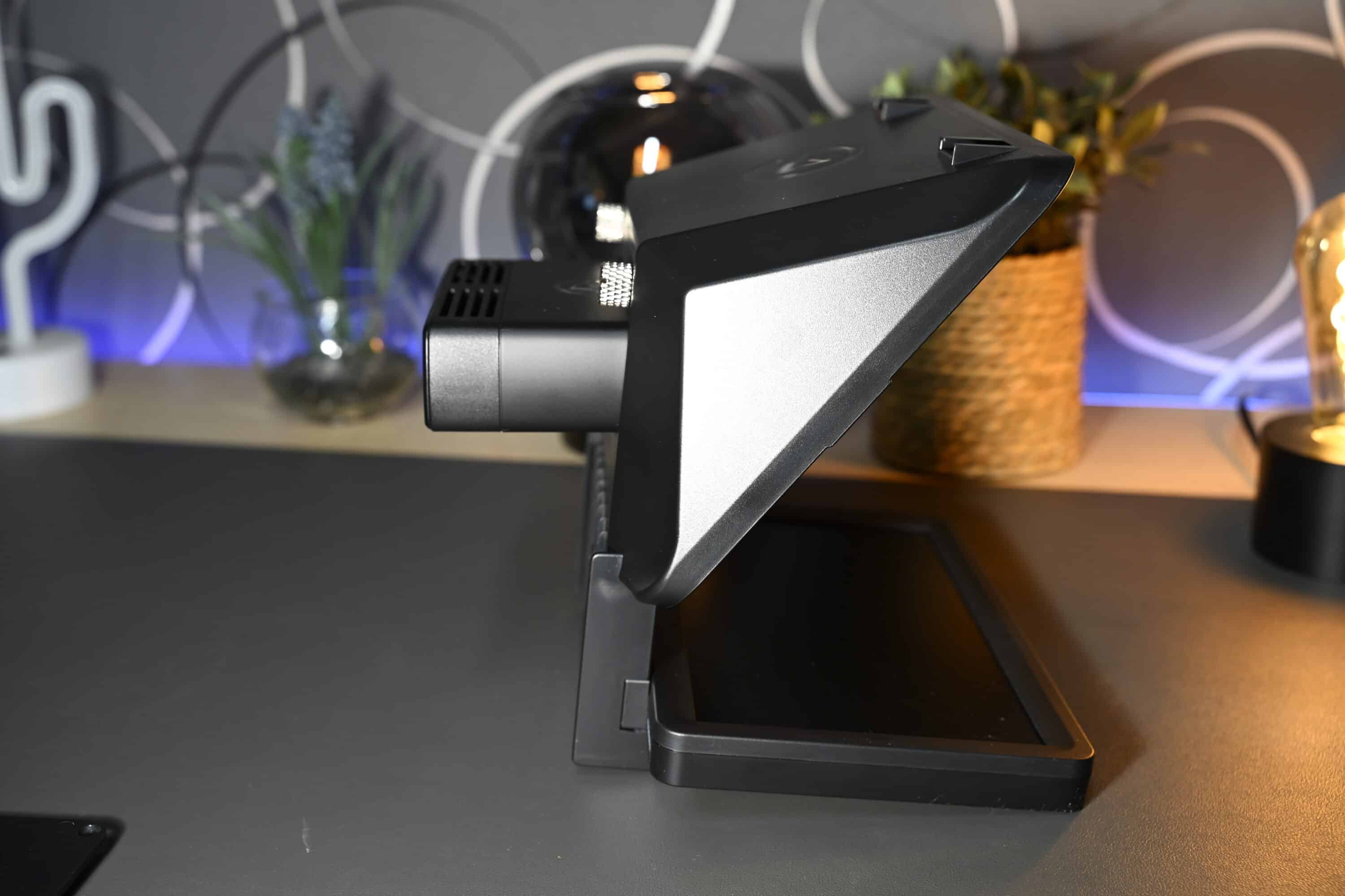 The Elgato Prompter is completely different – the first of its kind with an integrated display. There is a 9-inch screen on the underside with a resolution of 1,024 x 600 pixels. The content displayed there is reflected by the angled beamsplitter glass above and is then perfectly readable from the front or the side.