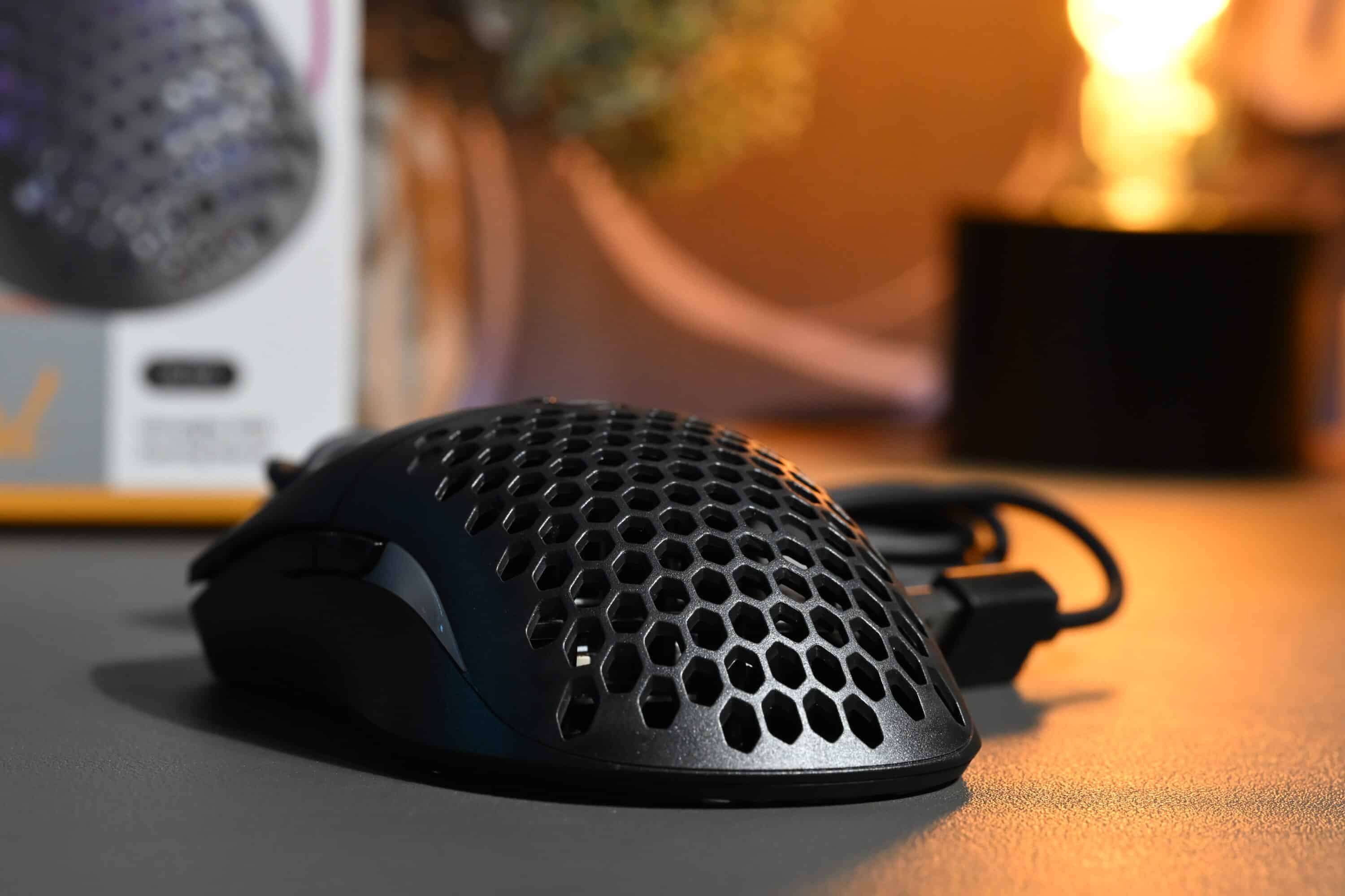 The honeycomb pattern on the new model extends across the lower back and underside of the mouse. Compared to the original, the two primary buttons now come without a perforated look. Instead, there is extremely appealing RGB lighting, which extends over one strip on each side of the rodent. Thanks to the airy look, the light shines through the interior and shines slightly onto the mouse pad.