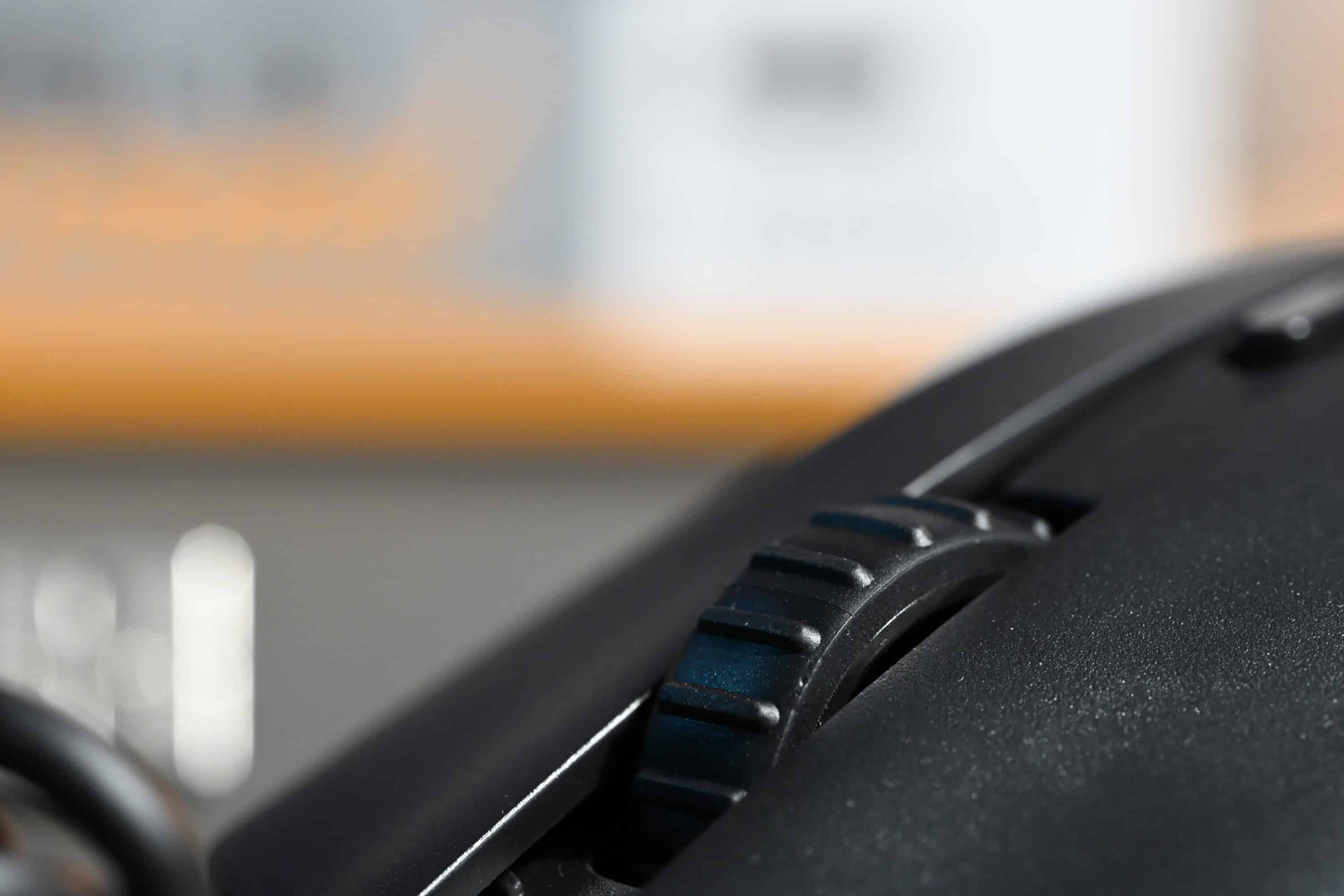 This is combined with two additional wedge-shaped side buttons and a pleasantly grippy, but somewhat too smooth-running clickable mouse wheel. Below this, you will find another button that allows you to set the resolution in DPI in a total of four levels.