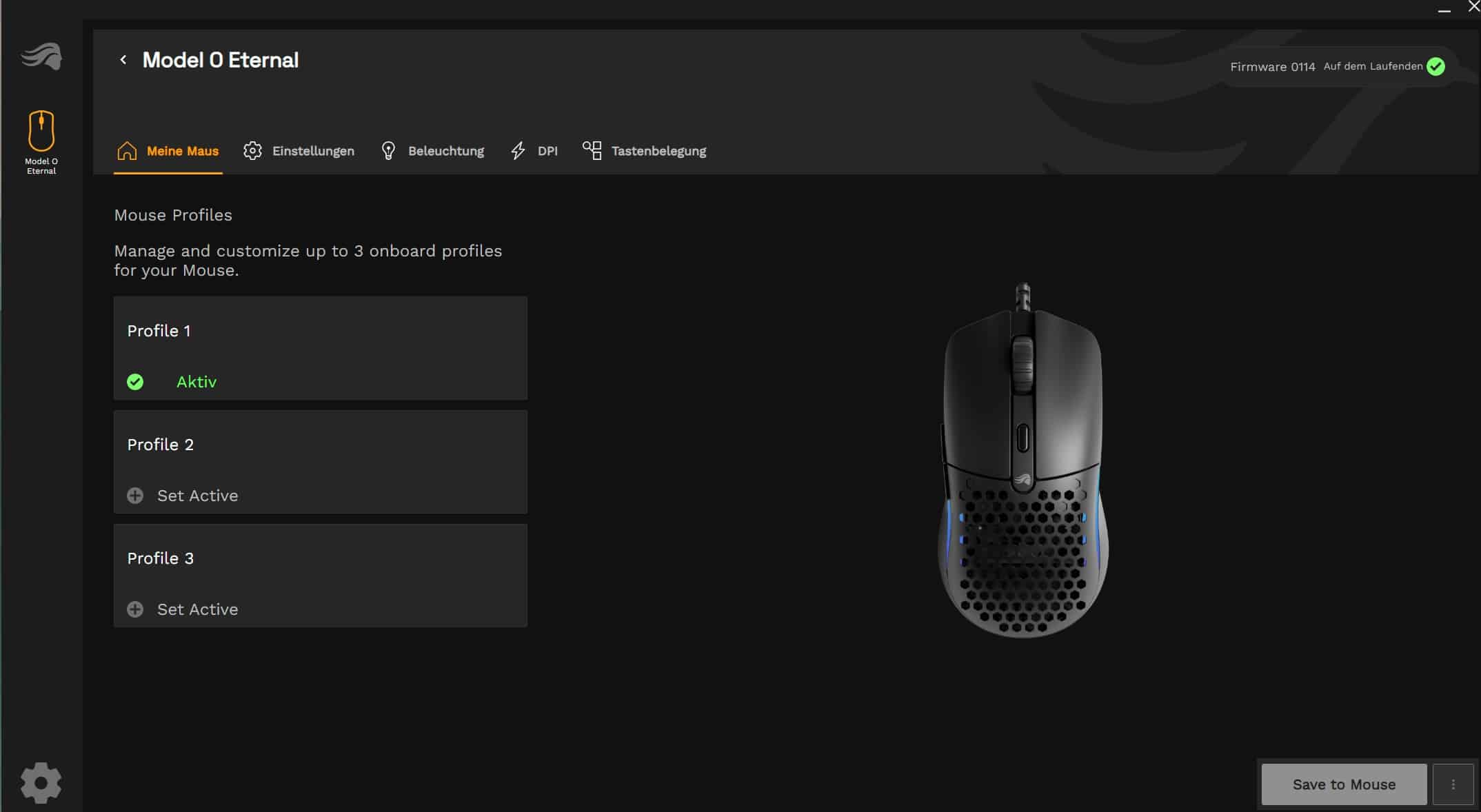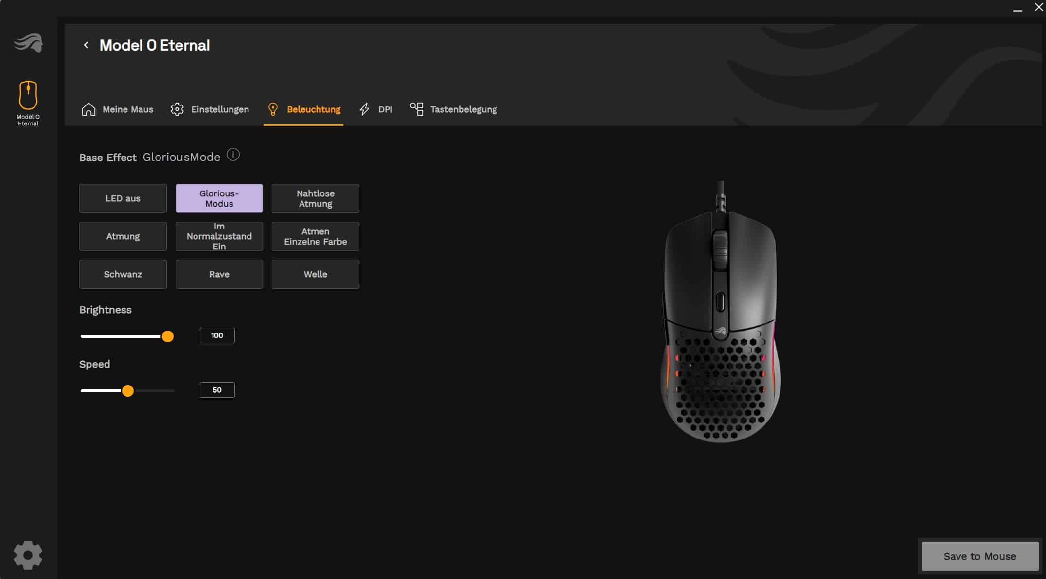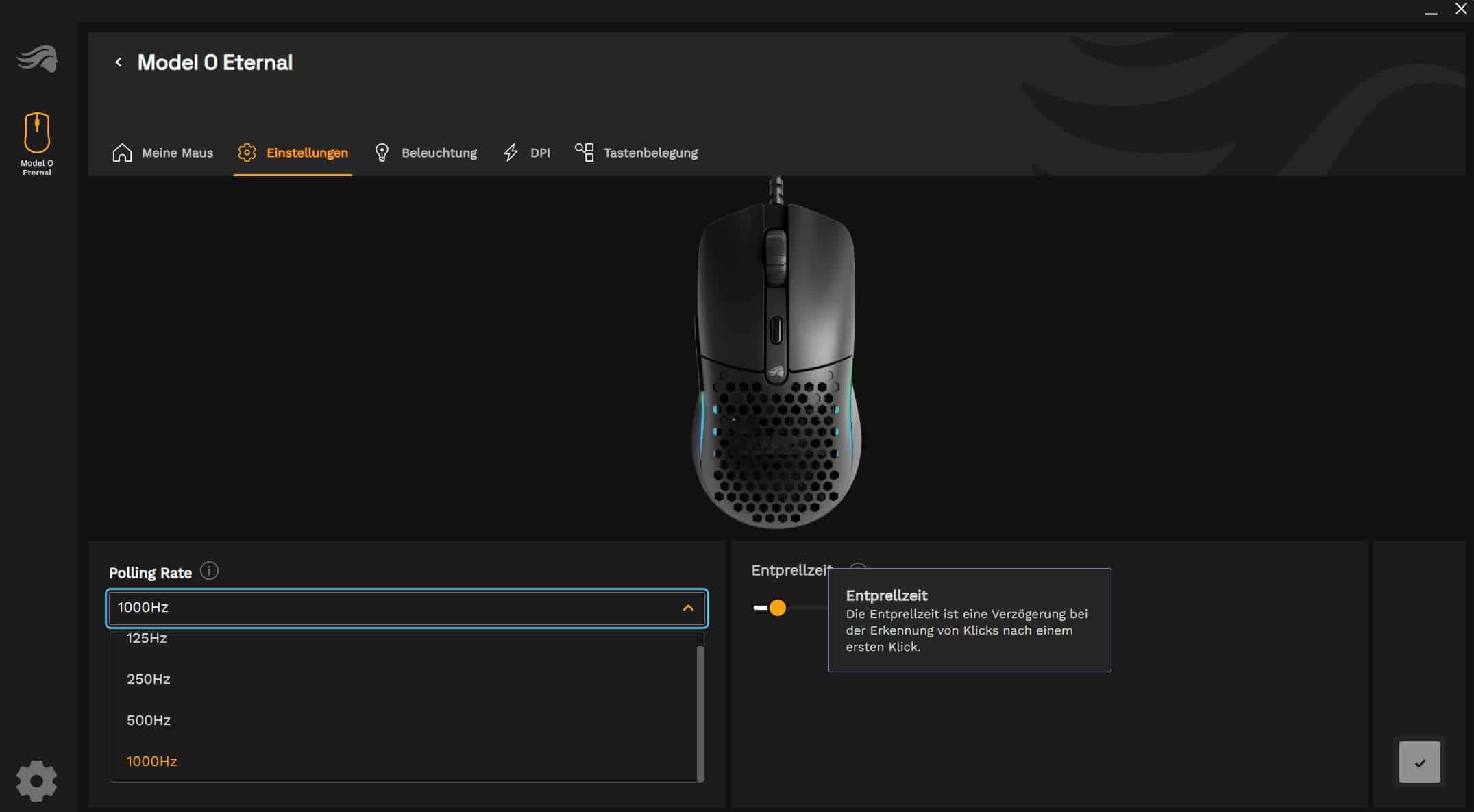 You can create three different profiles within the app, which can then also be stored on the mouse’s internal memory. In the “Settings” section, you can adjust the polling rate and debounce time. You can also customize the RGB lighting and adjust not only the brightness but also the speed of the effects.