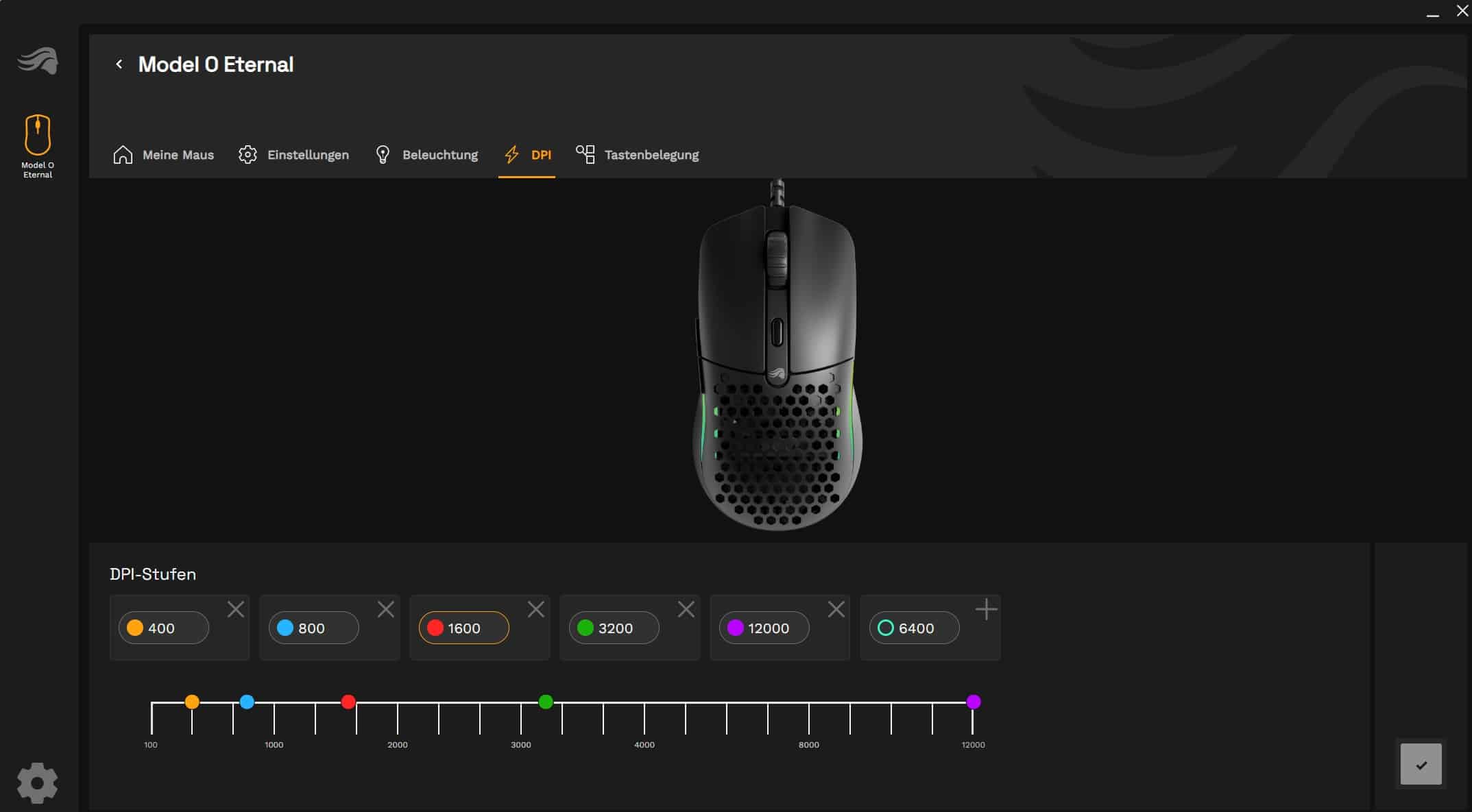 There have also been improvements to the sensor. Glorious has opted for the PixArt 3311 optical sensor. The maximum resolution of 12,000 DPI is absolutely sufficient for the price range. Adjustments are possible from a minimum value of 50 DPI in steps of 100.
