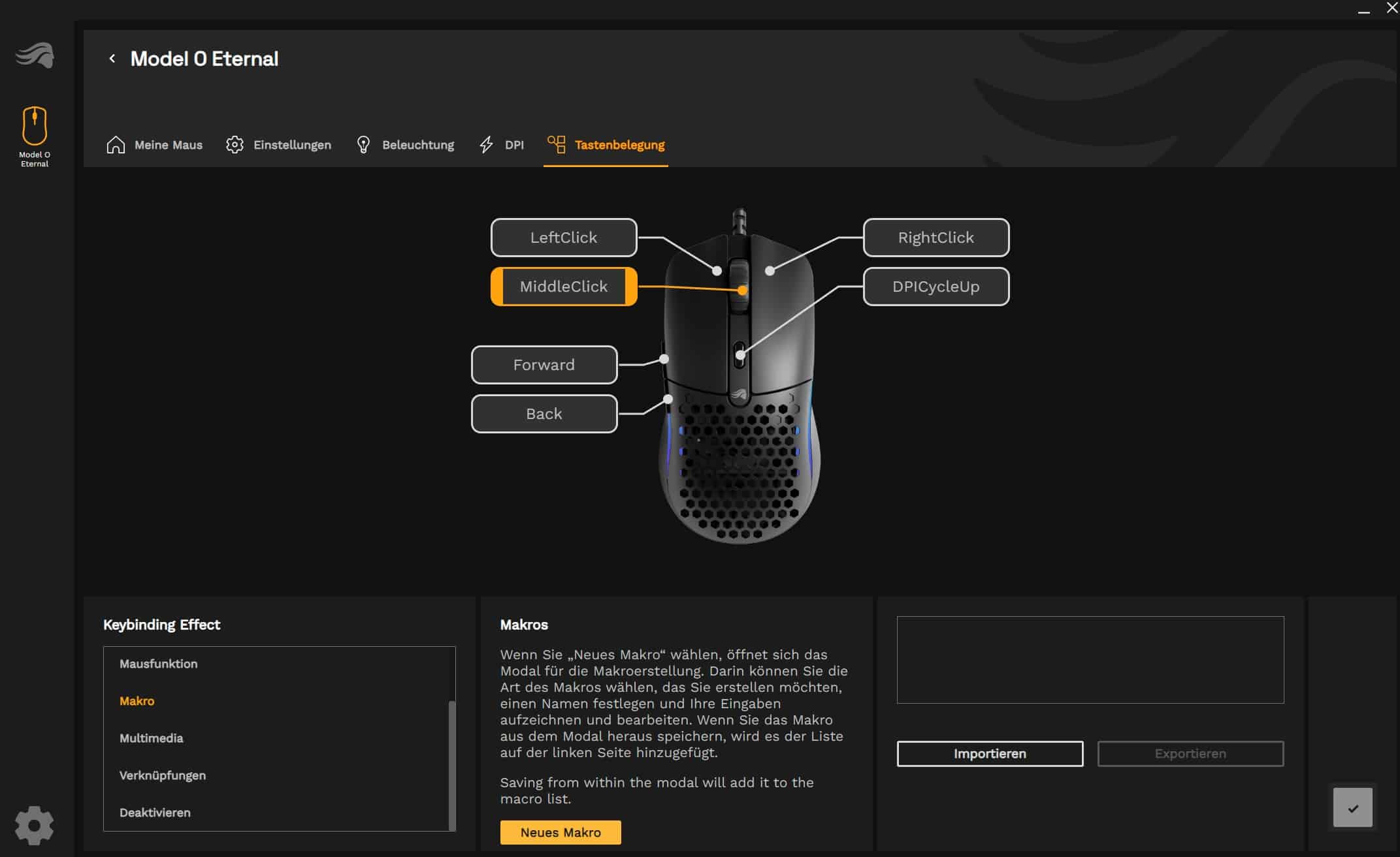 Under the “DPI” tab, you can also adjust the DPI levels individually and – very commendably – create your own additional levels and assign colors to them, which can then be activated by pressing a button on the mouse. In the “Key mapping” section, you can then freely reconfigure all the mouse buttons and, for example, play macros, execute keyboard commands, open shortcuts and much more.