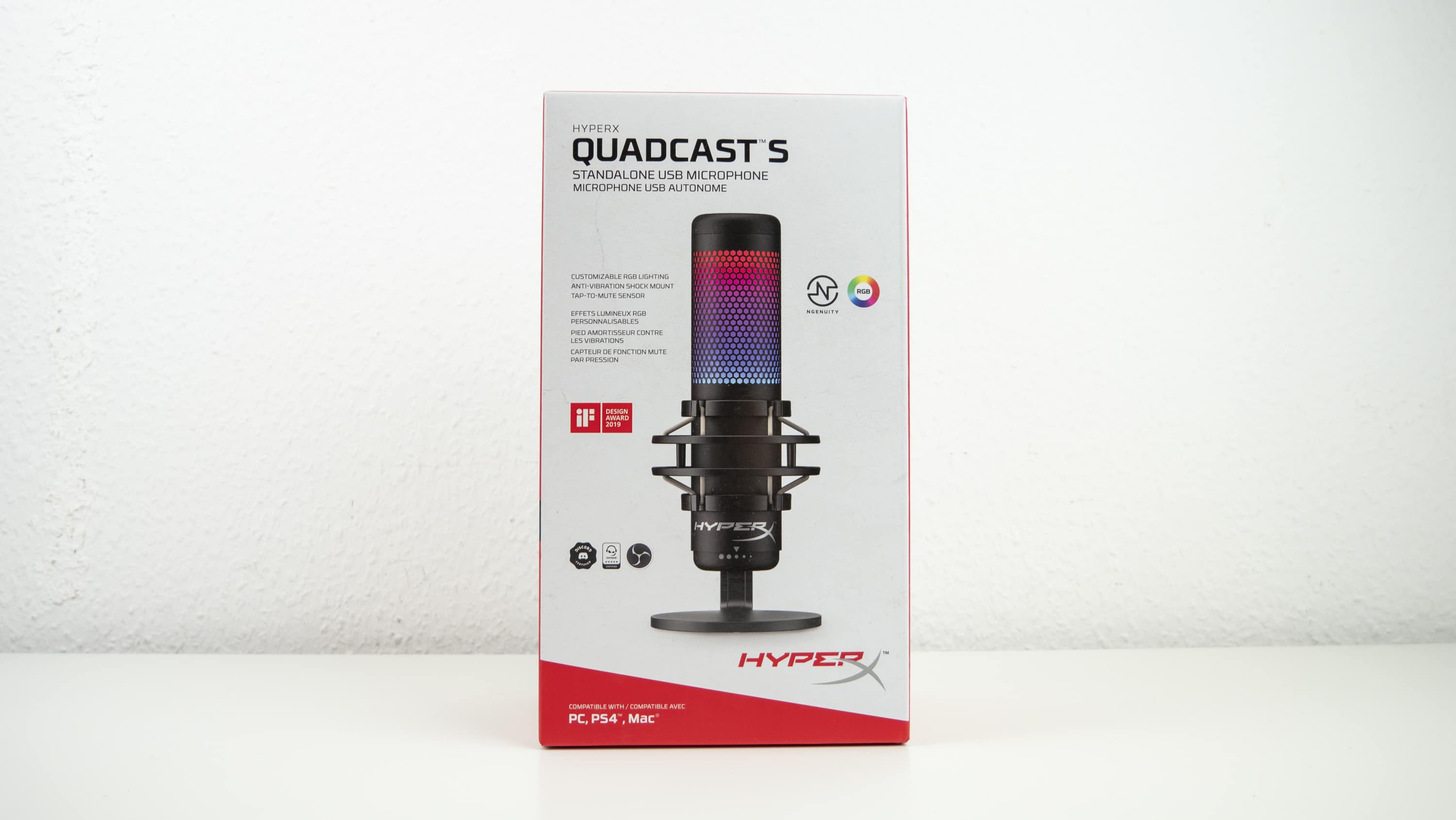 As soon as the parcel arrives, it is of course opened immediately. A red-and-white cardboard box with a picture of the microphone is displayed. Inside, the QuadCast S is unspectacularly packaged – from our point of view a plus point, since elaborately designed packaging is usually intended to distract from the contents. In this case, however, this is already a highlight, so the robust plastic packaging, which allowed the microphone to travel safely, is absolutely sufficient.