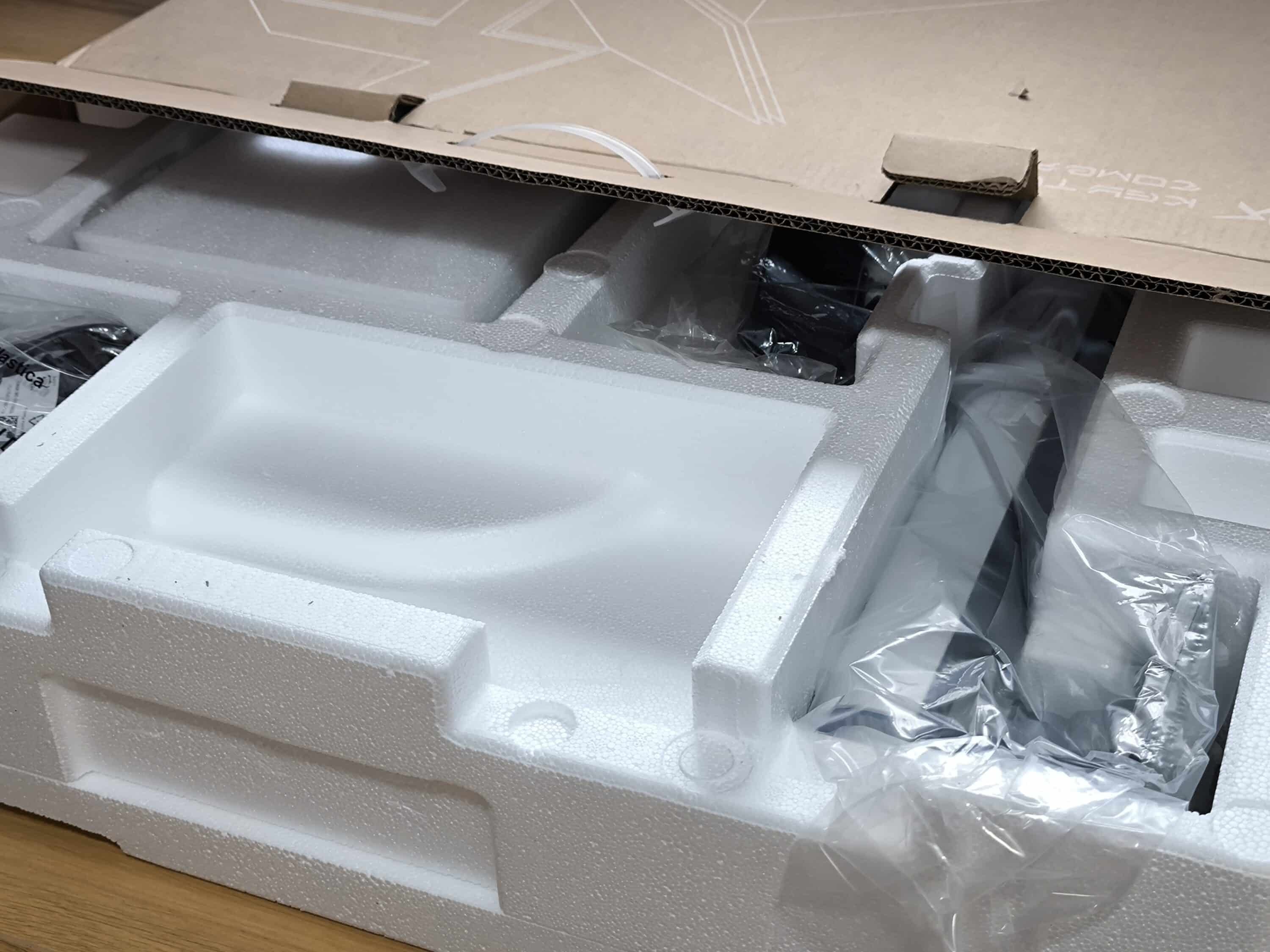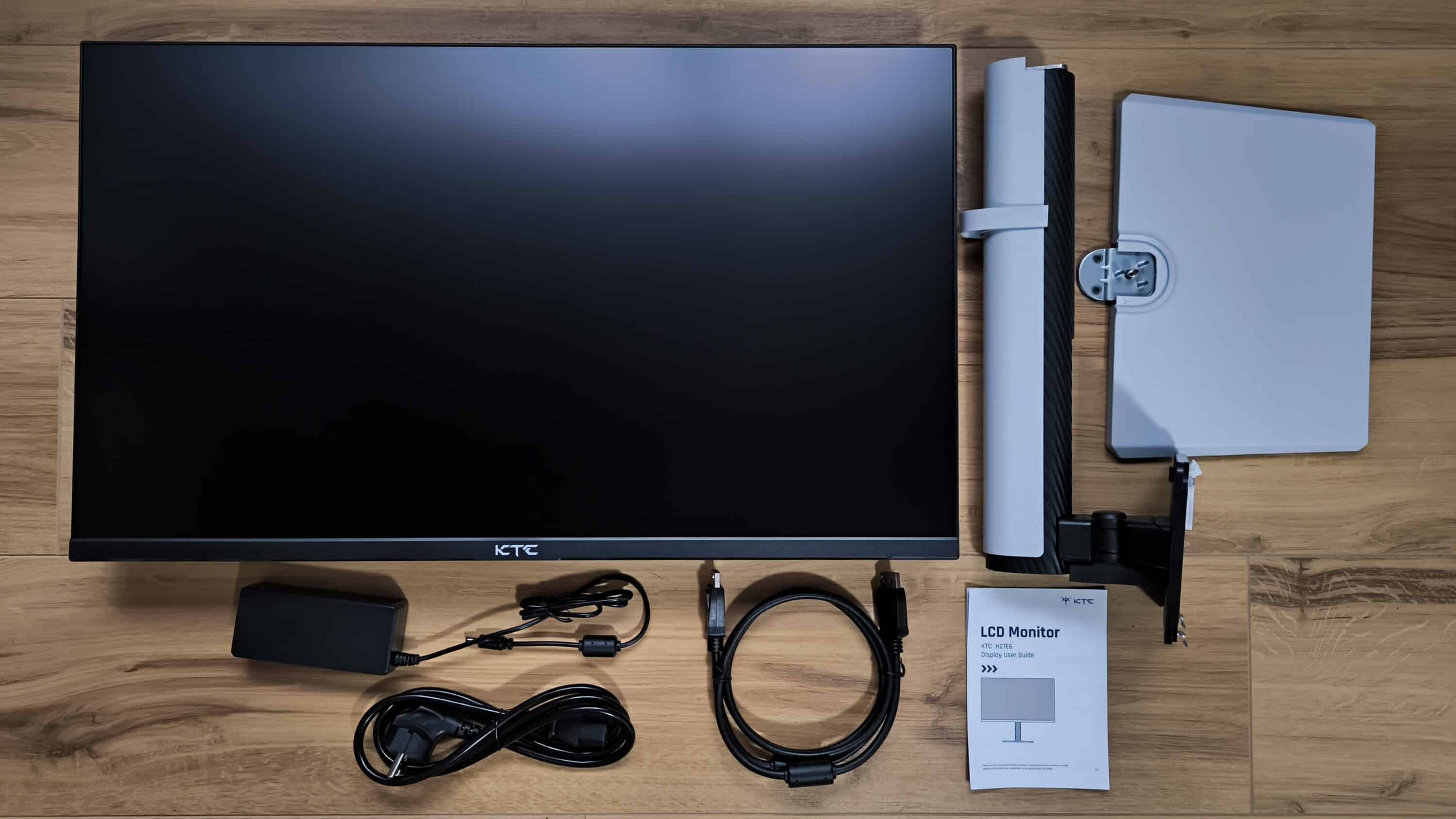The KTC H27E6 reached us in an oblong cardboard box, well protected by plenty of polystyrene filling material. In addition to the 27-inch monitor, the scope of delivery also includes the monitor stand consisting of two individual parts, i.e. the stand and base. There is also a set of cables such as the mains cable with power supply unit and the Displayport cable. Last but not least, the package is rounded off with the operating instructions and warranty card.