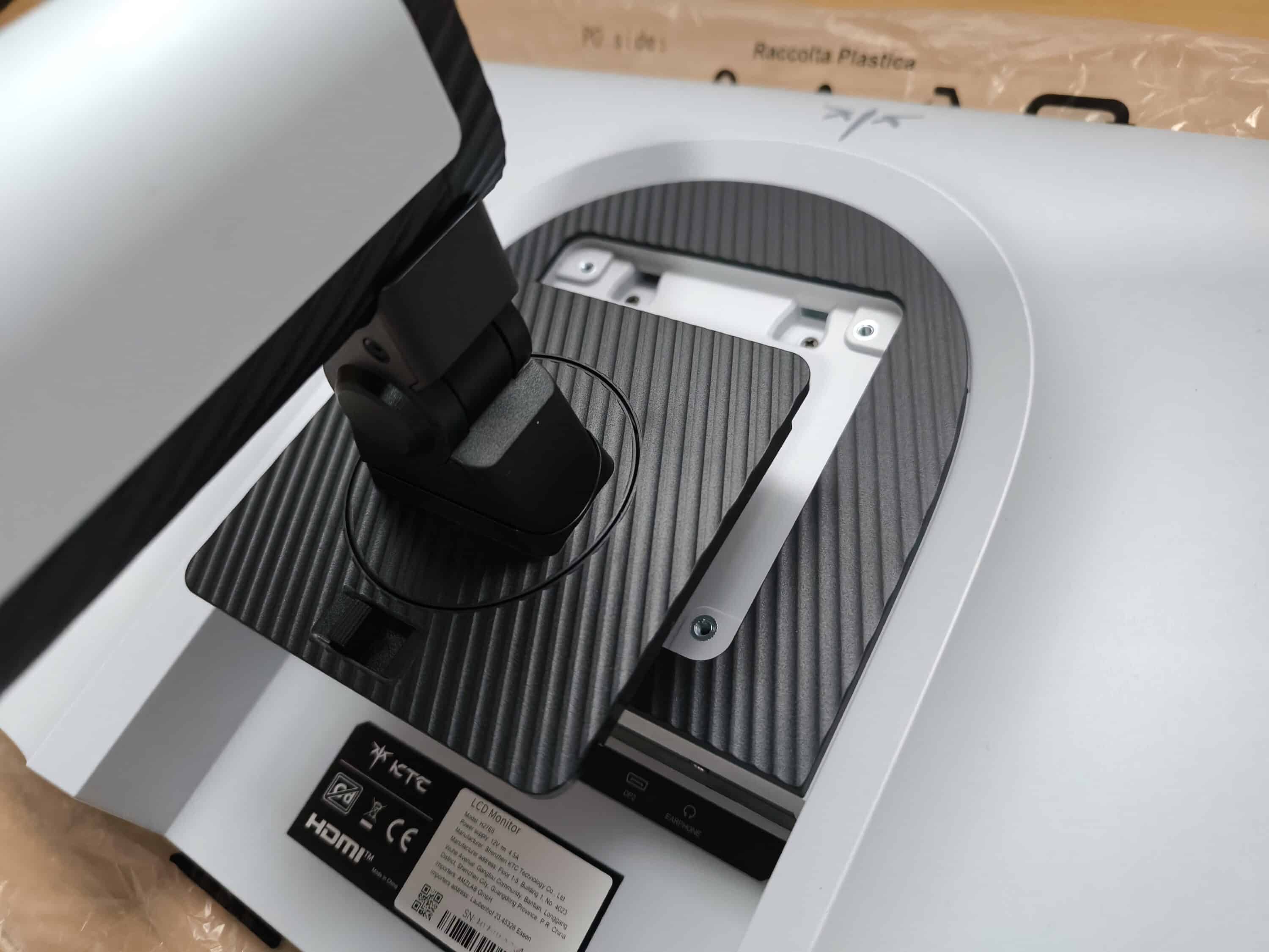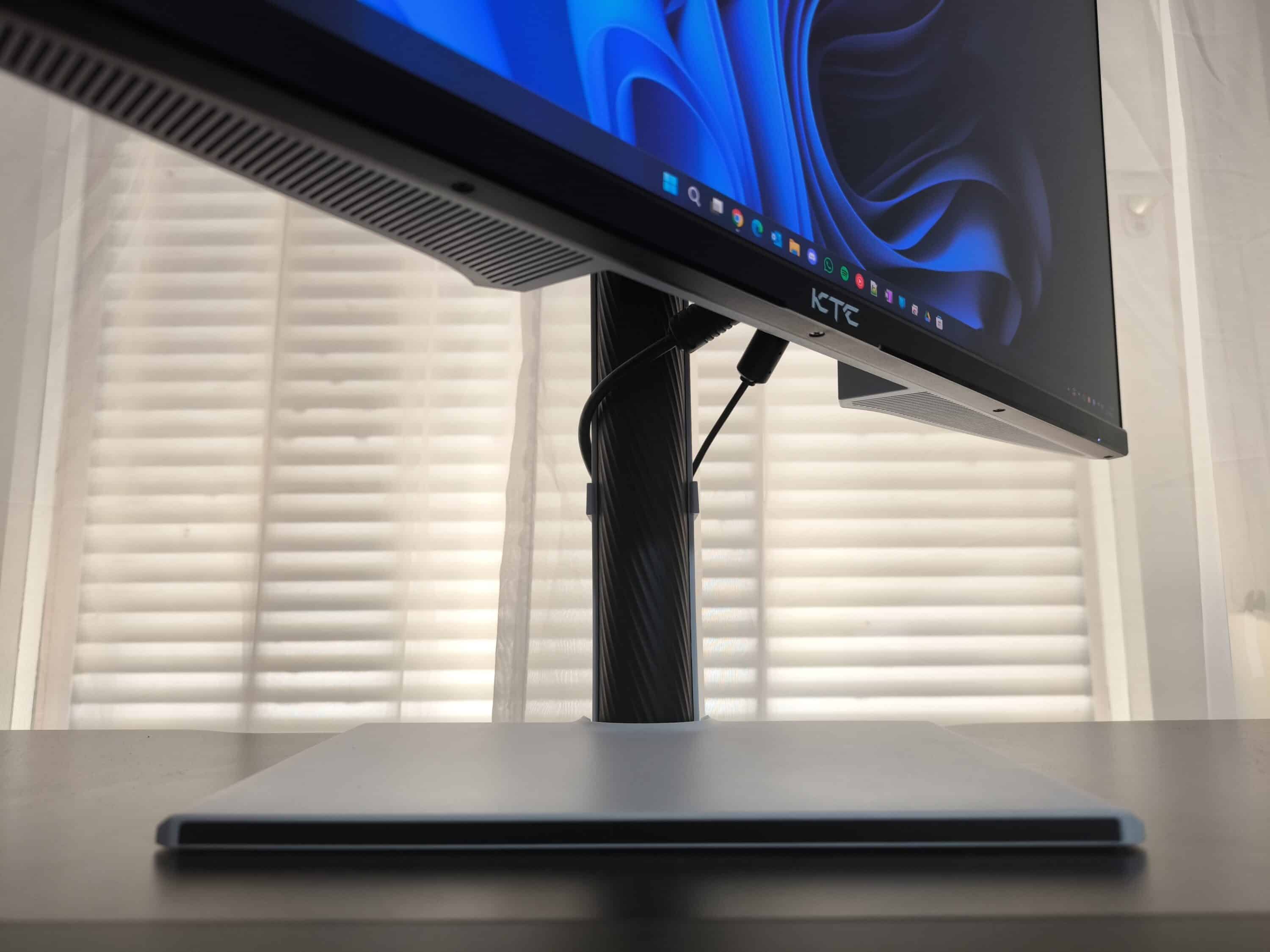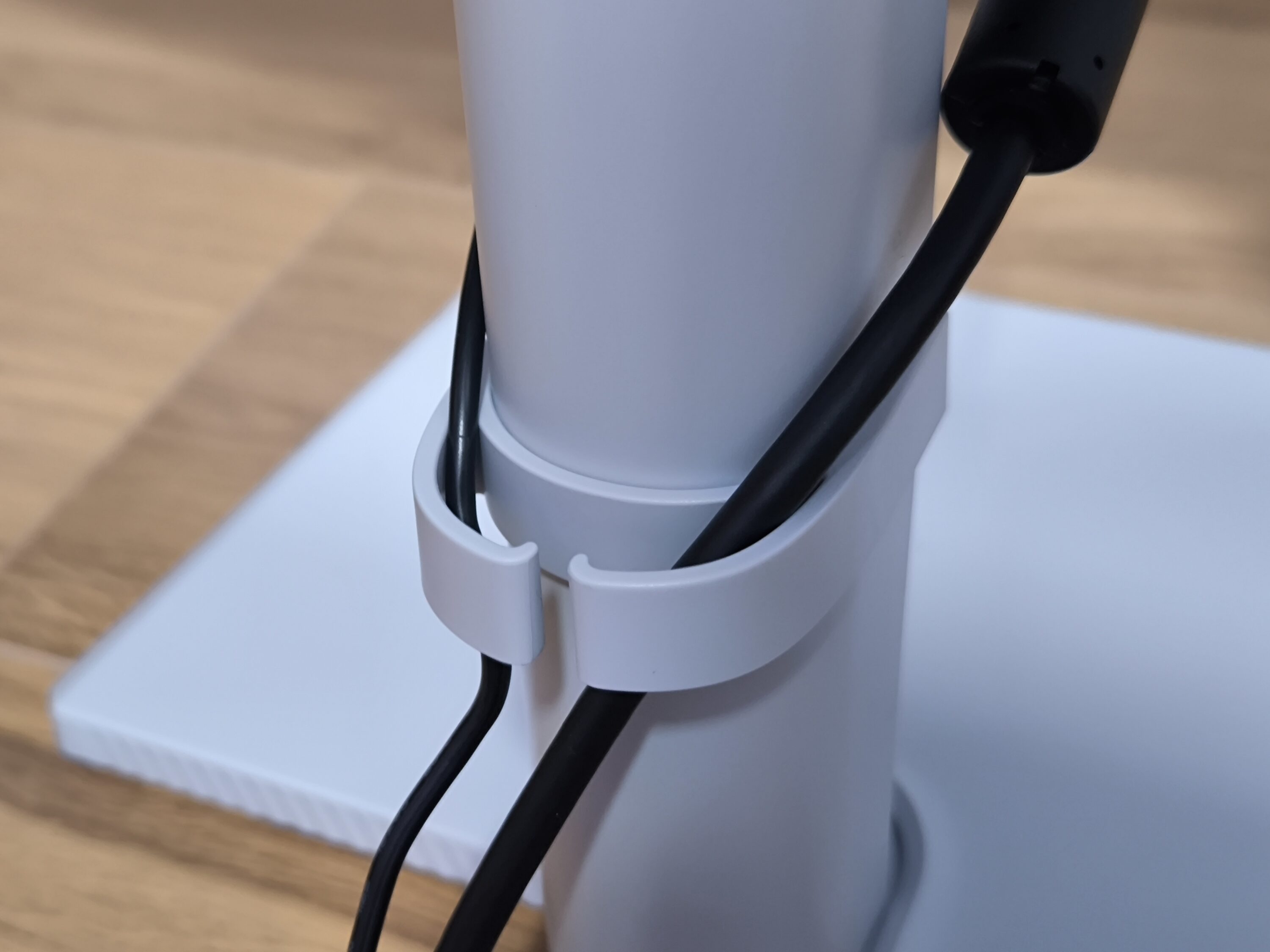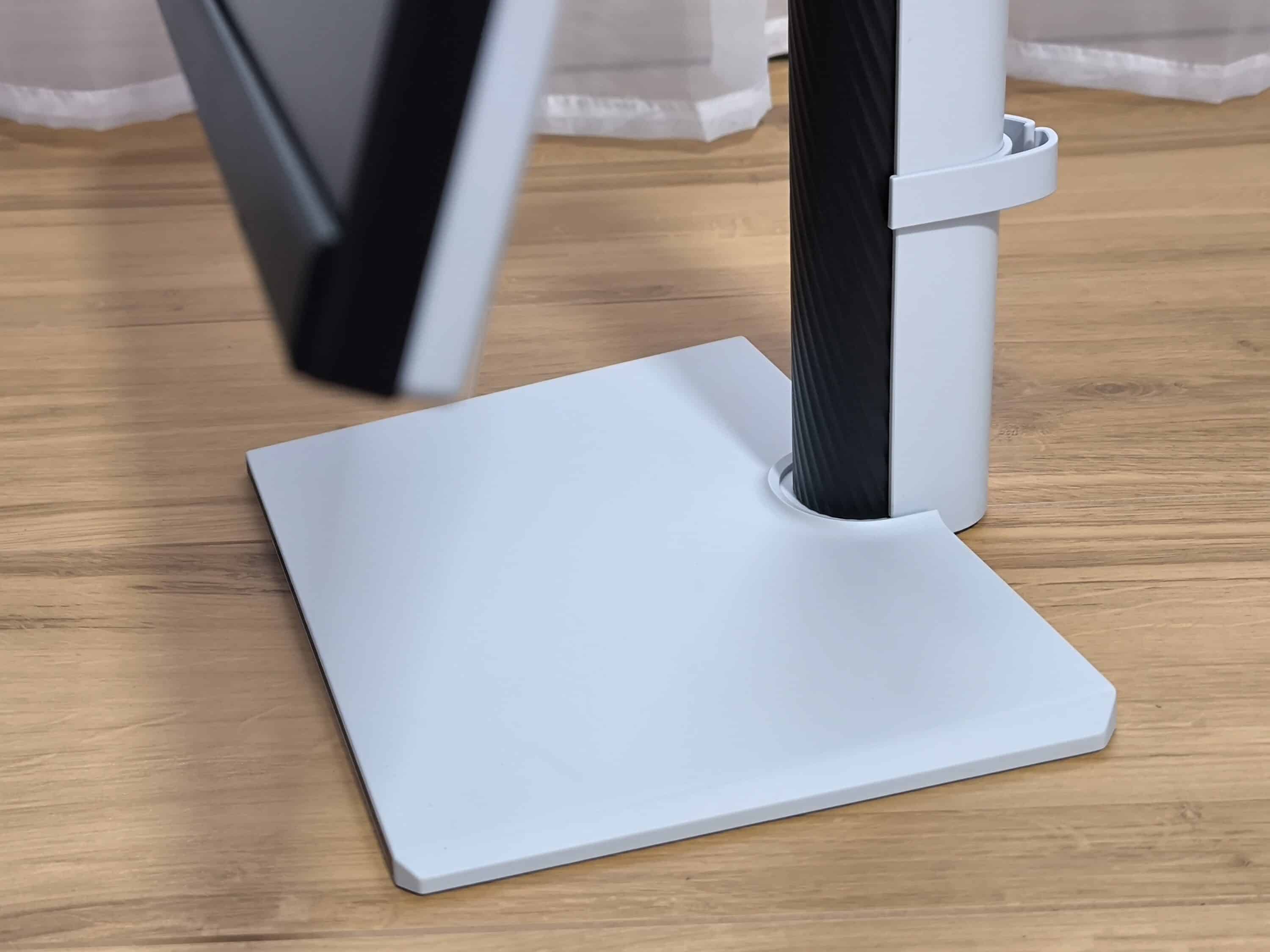 Assembling the KTC H27E6 is extremely straightforward and can be completed in just three steps. First, the protective cover on the top of the base is removed. The base is then inserted into the stand arm and secured using the integrated locking mechanism. While the base and stand arm are already connected in one piece, the mounting plate can simply be clipped into the back of the KTC H27E6. At this point, the gaming monitor would already be mounted so that only the cables need to be connected. A small clamp on the stand is used for this purpose, through which the power cable and DisplayPort cable can be routed.