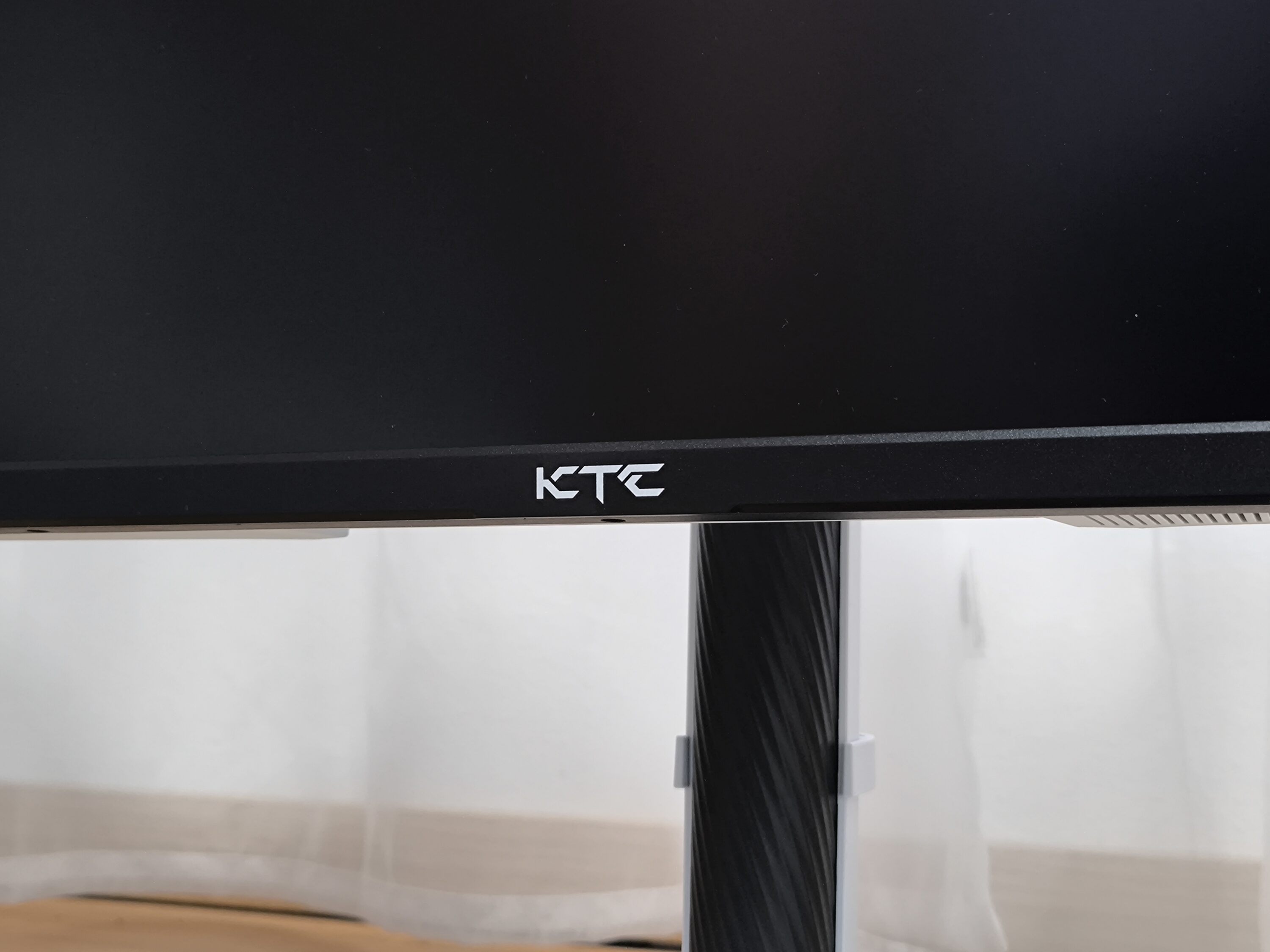 Visually, the KTC H27E6 is actually rather simple and relies on a black and white design. Colorful accents, as are typical in the gaming sector, are initially sought in vain. They only appear when the monitor is switched on. Finally, the 27-inch gaming monitor has an illuminated logo with a semi-circular RGB light on the back of the housing. The front looks quite simple – only the KTC lettering is emblazoned under the display and a small LED at the bottom right edge of the monitor provides information about the current operating status. At the same time, a ribbed finish extends along the entire monitor, from the white base to the black decorations on the stand and the dark mounting plate.