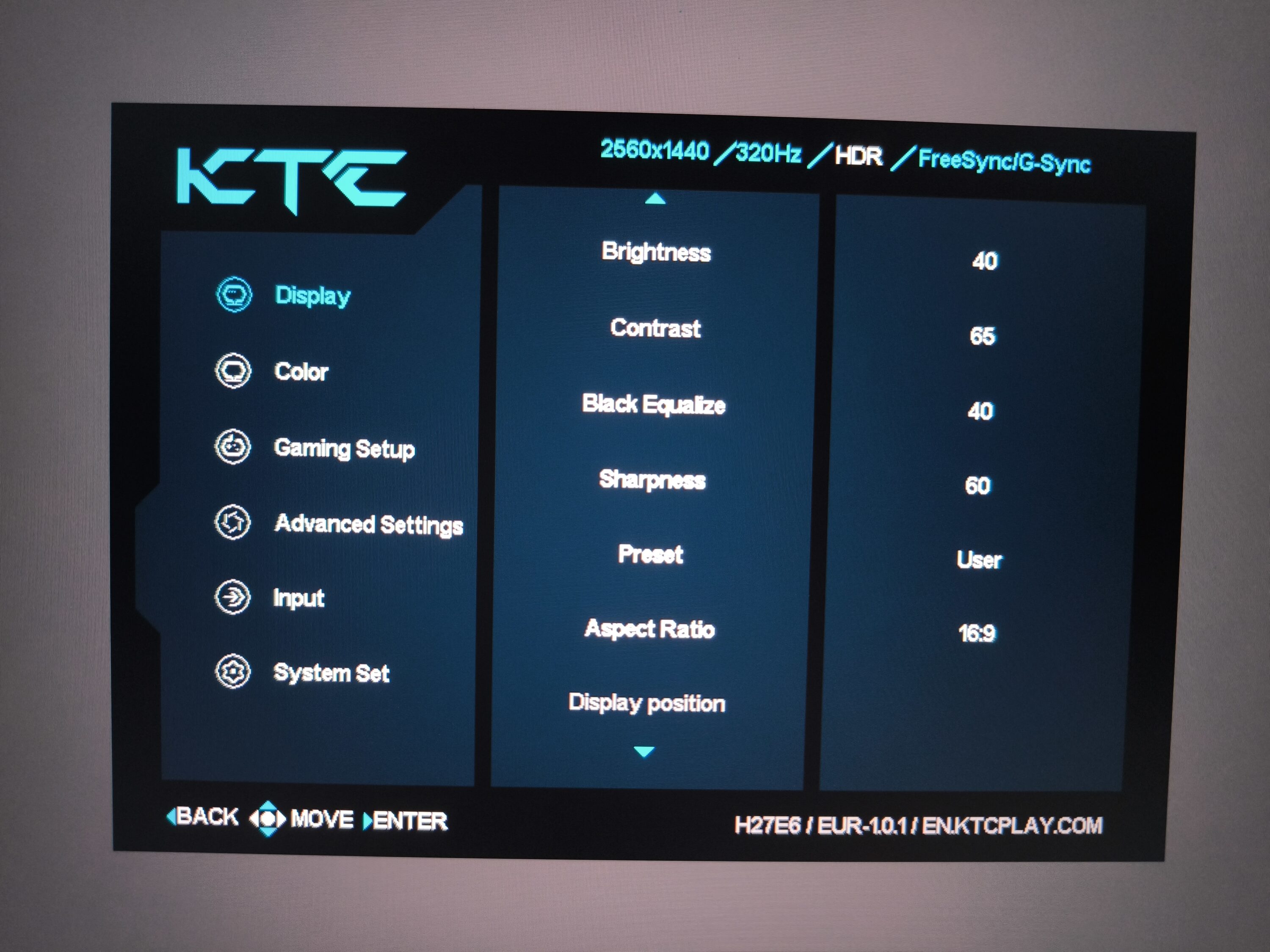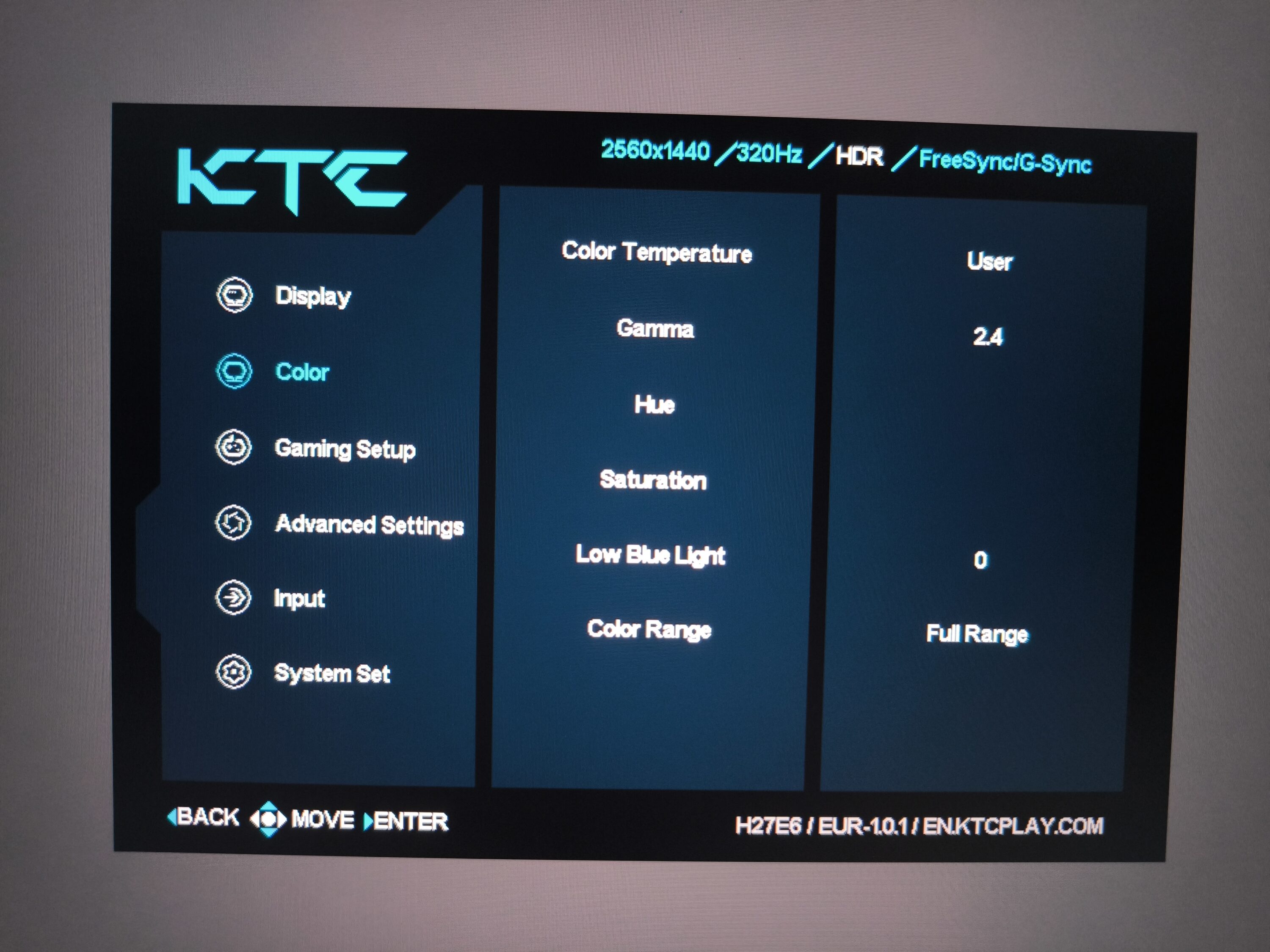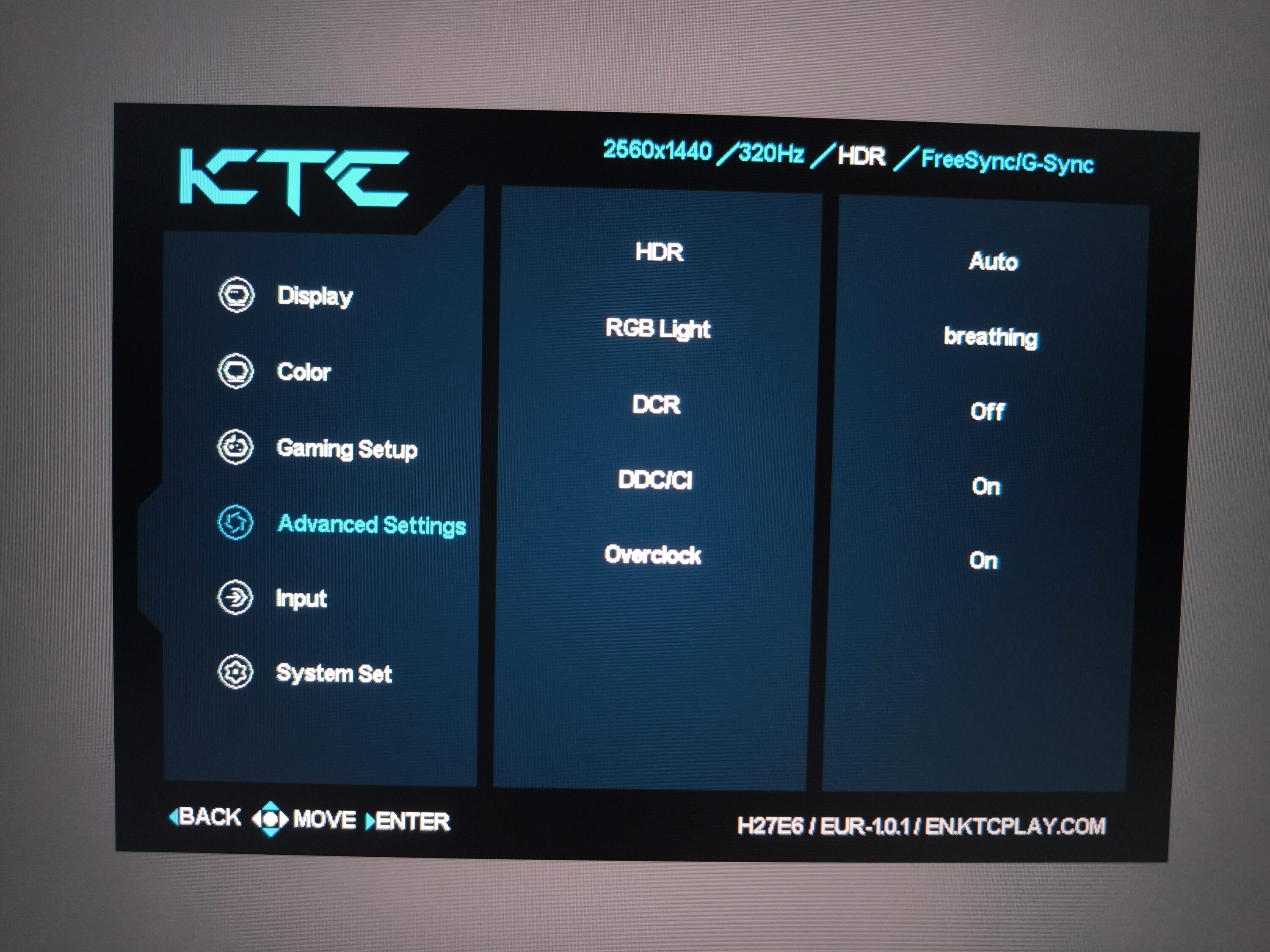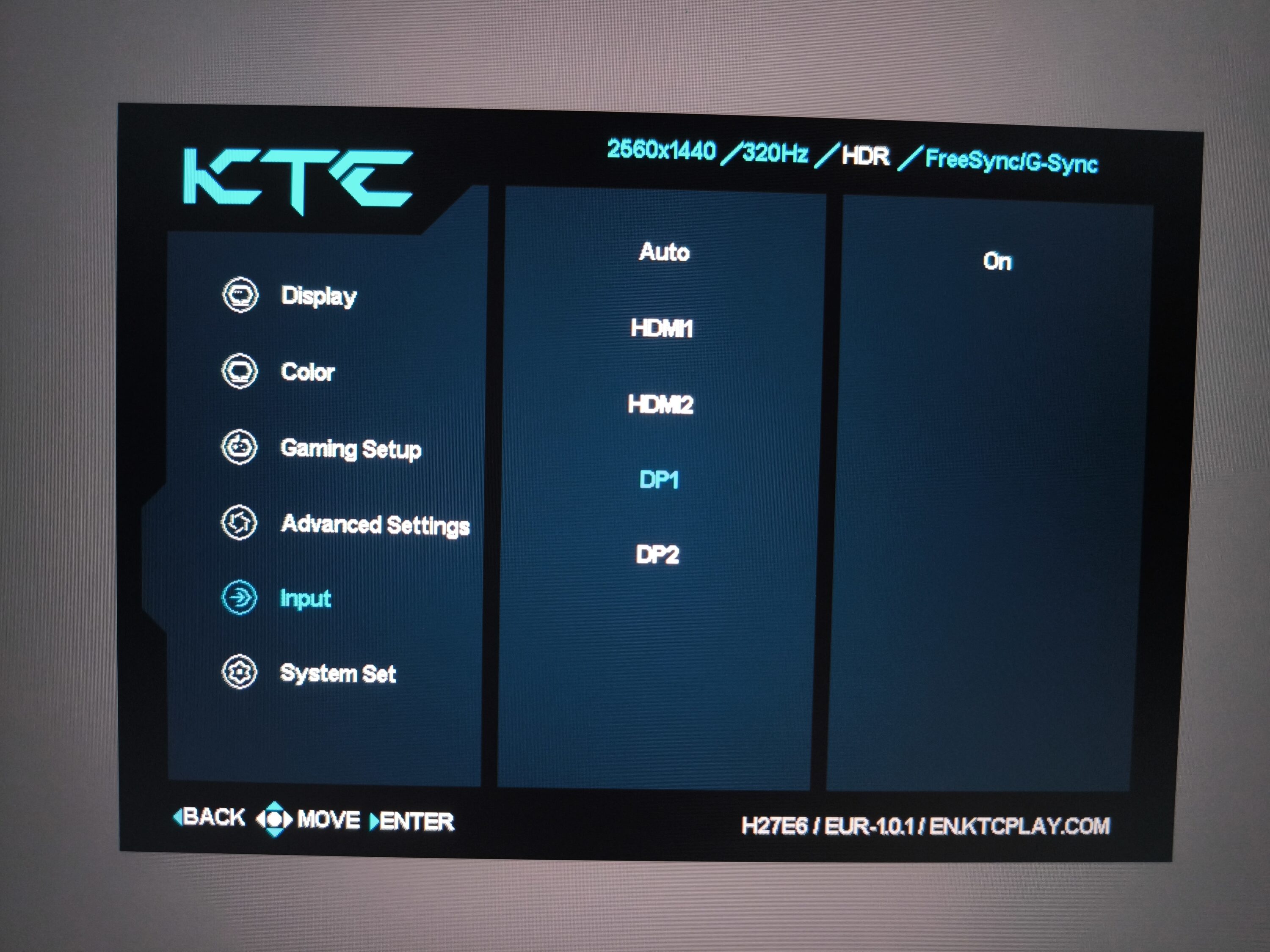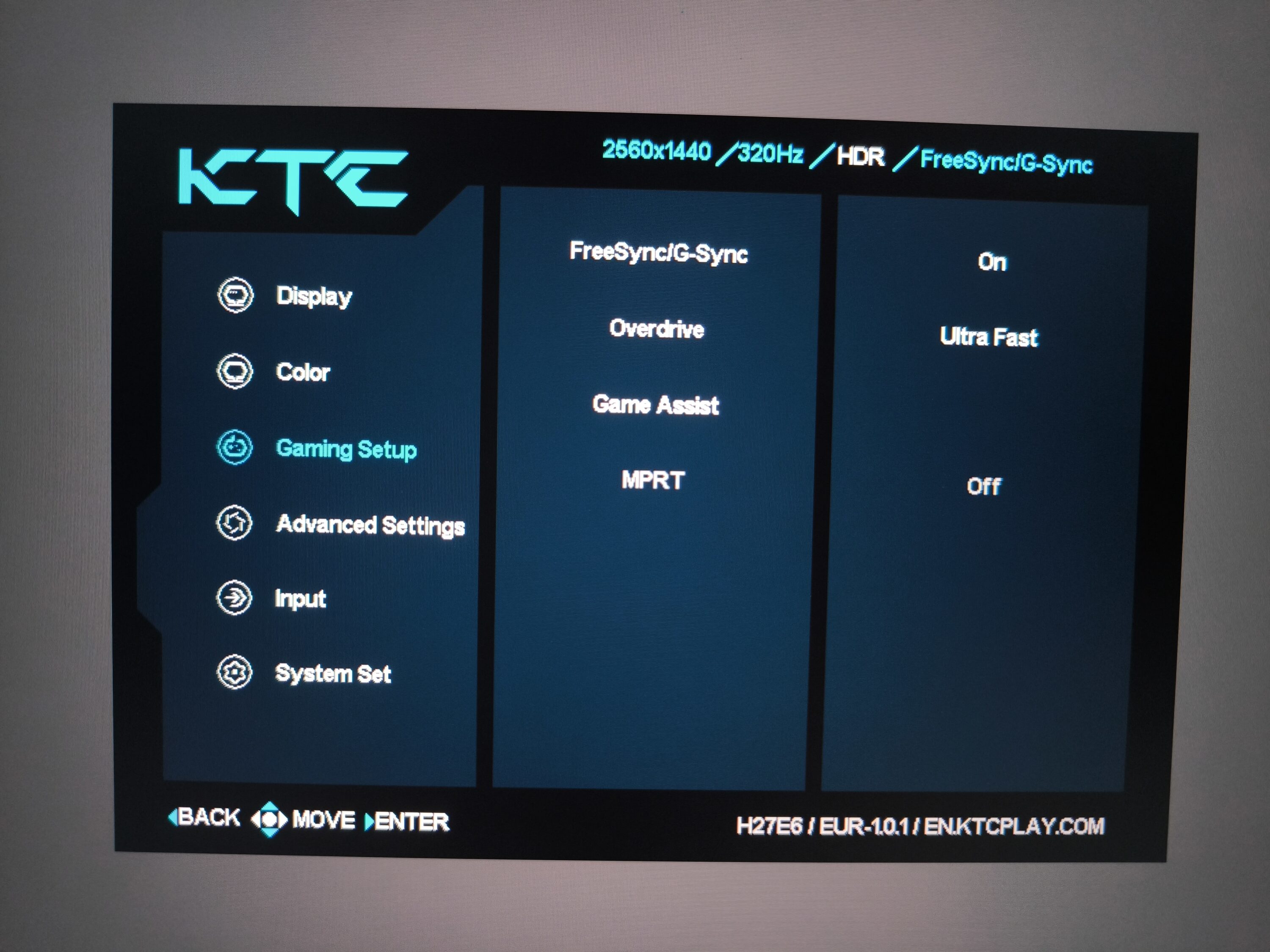The refresh rate of the KTC H27E6, on the other hand, is impressive, which is the gaming monitor’s main selling point. Its 300 Hz or 320 Hz in OC mode are delivered to the screen with either HDMI 2.1 or DP 1.4. The respective intermediate steps of the refresh rate are divided into eight levels and range from 320 Hz with OC activated to 240, 144 and 60 Hz. HDR400 is also on board, which is activated via the OSD as already mentioned. This achieves improved image dynamics and higher color intensity with high-contrast displays. Other features of the KTC H27E6 include a blue light filter and a flicker-free anti-reflective panel. The PIP (Picture-in-Picture) and PBP (Picture-by-Picture) functions are not supported instead.