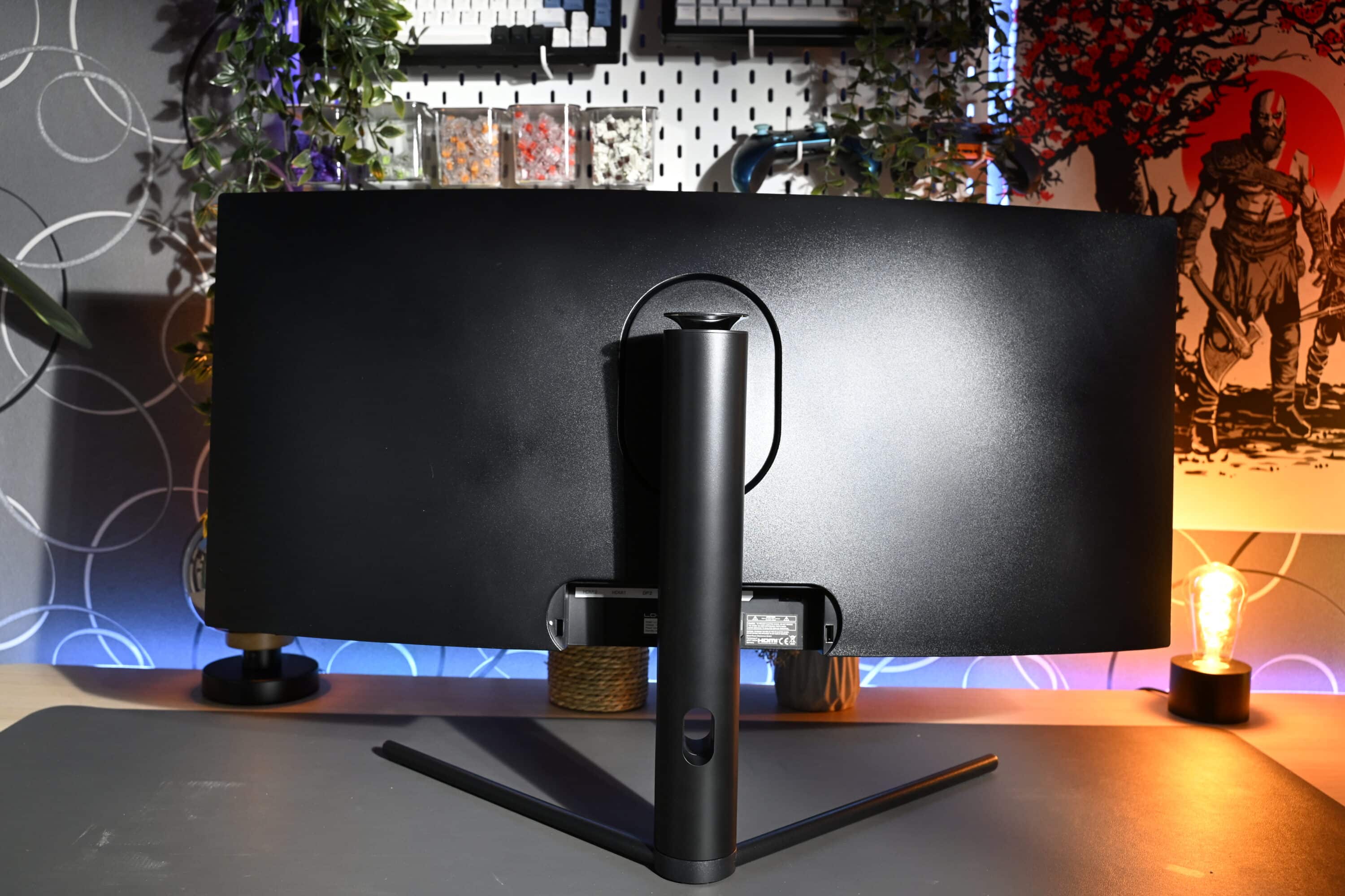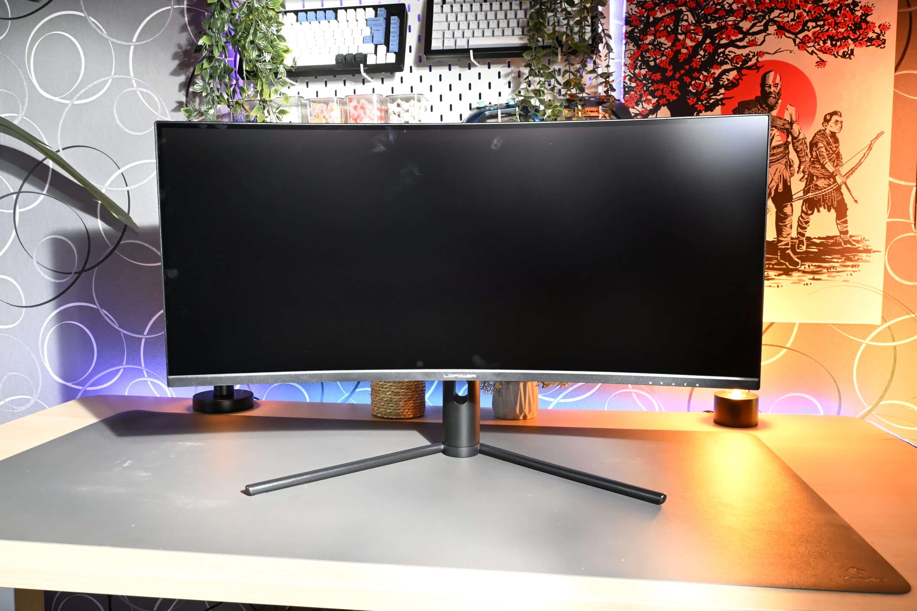 And then it’s in front of you. A rather bulky, ultra-wide 34-inch monitor that is quite light at around 8 kilograms. This is due to the plastic construction, which naturally keeps the weight down, but doesn’t feel as robust as the more expensive competition.