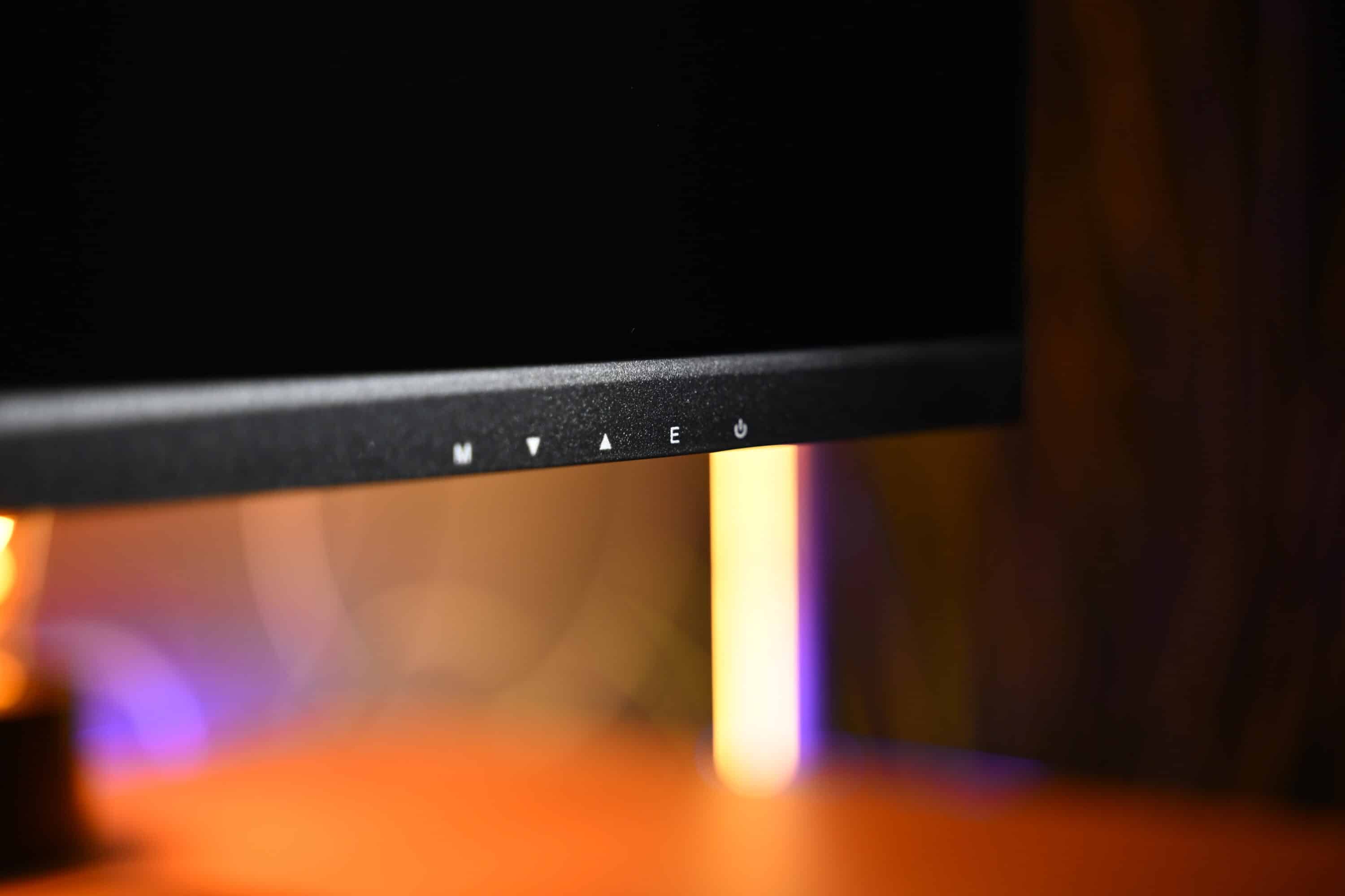 The left button takes you to the on-screen display (OSD) and then to the next submenu; the buttons next to it are used to navigate up or down. The “E button” goes back one step in the menu, while the power button is on the far right. Self-explanatory and simple.