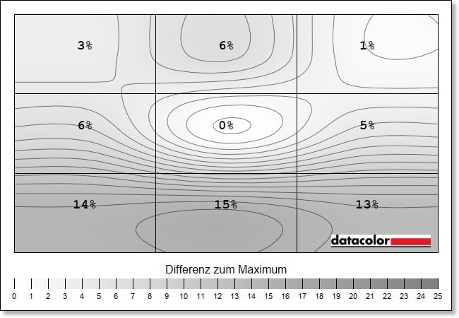 The situation is somewhat different with luminance homogeneity. While the upper third achieves good results across all brightness levels, the deviations in the lower third are already very high at up to 16 percent.