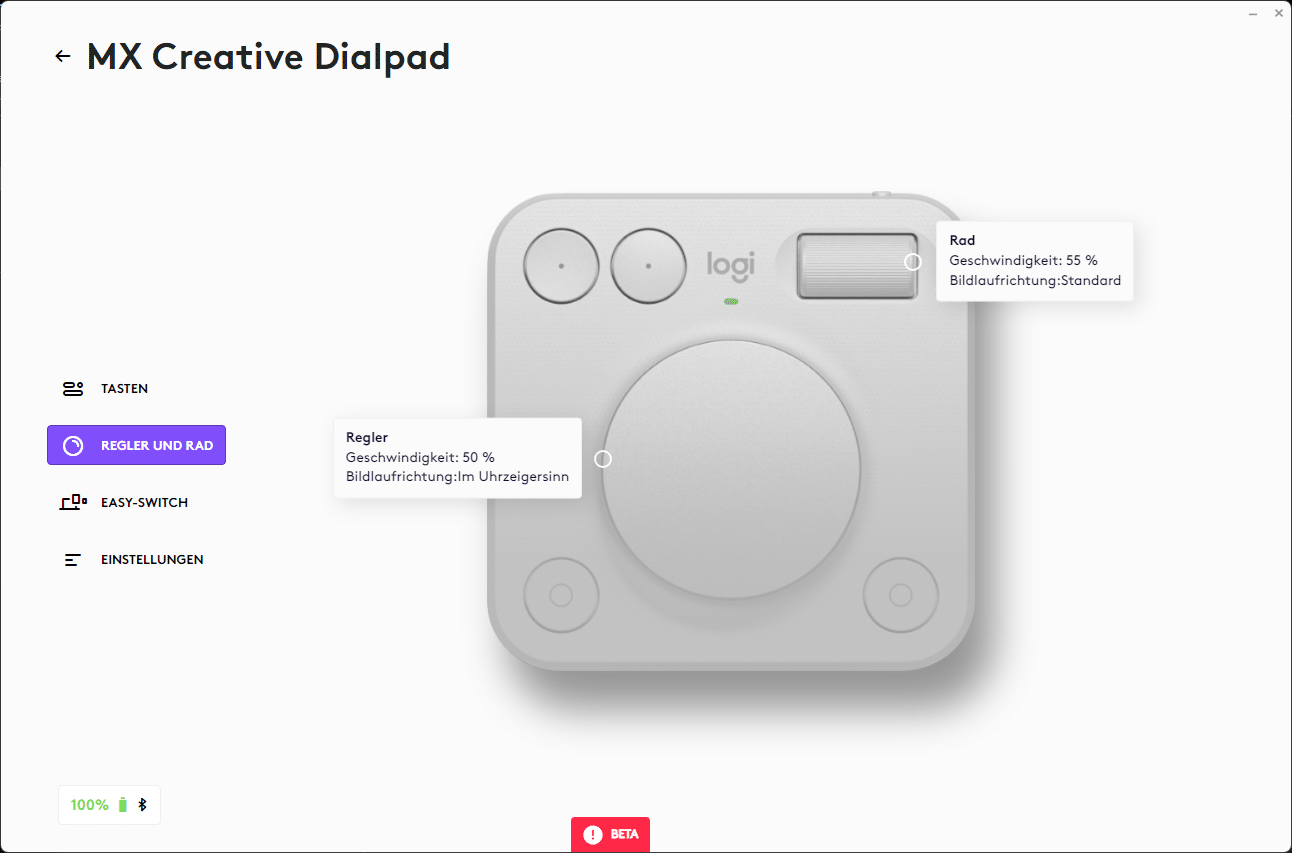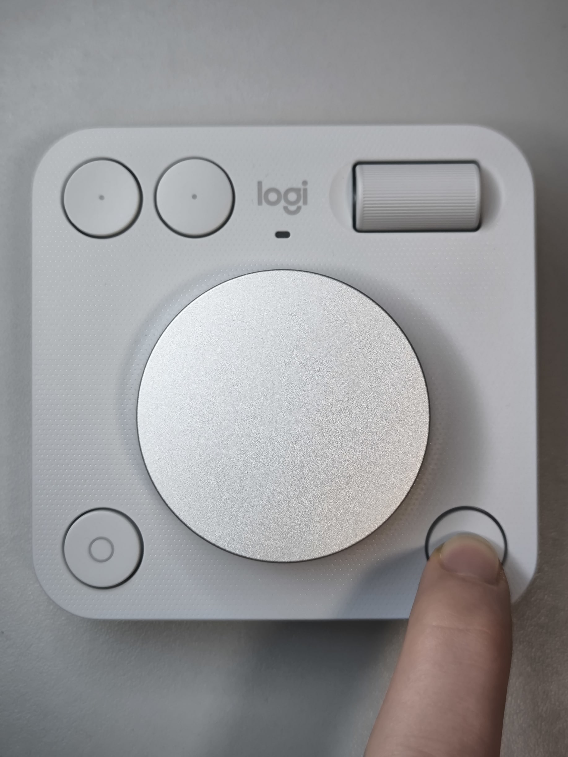 Let’s now turn our attention to the MX Creative Dialpad. This works completely wirelessly, controls up to three devices and, unlike the MX Creative Keypad, has no display. Instead, the large tactile aluminum control wheel is the focal point of the dialpad and takes up a large part of the pad. It allows the system volume to be controlled ex works. It is worth mentioning that it can be turned continuously in both directions and does not have a locking mechanism. There are four additional buttons all around it for free assignment. These are assigned the functions Escape, Undo, Redo or to call up the Action Ring as standard. The second small scroll wheel at the top right ensures convenient scrolling, which can be an advantage with large horizontal websites, for example.