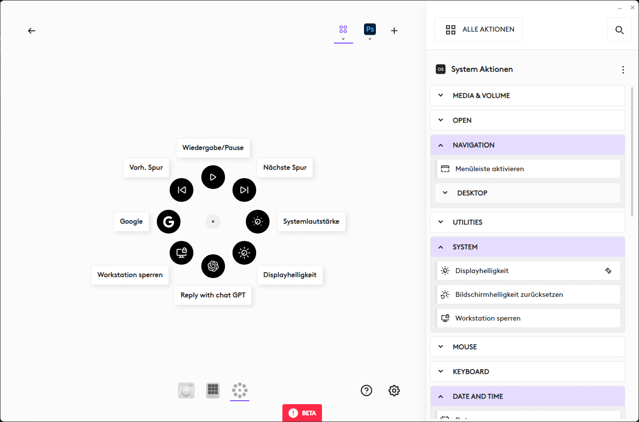 We really liked the Actions Ring, which provides eight functions directly on the mouse pointer. Regardless of the Adobe integration, this makes media control easier. For example, the shortcut “Reply with chat GPT” opens the ChatGPT website from OpenAI. However, it is not possible to frame text and summarize the input directly or even reply directly from ChatGPT via Logi Options+. Nevertheless, the MX Creative Dialpad is a great extension and can hold its own with various use cases even without a display.