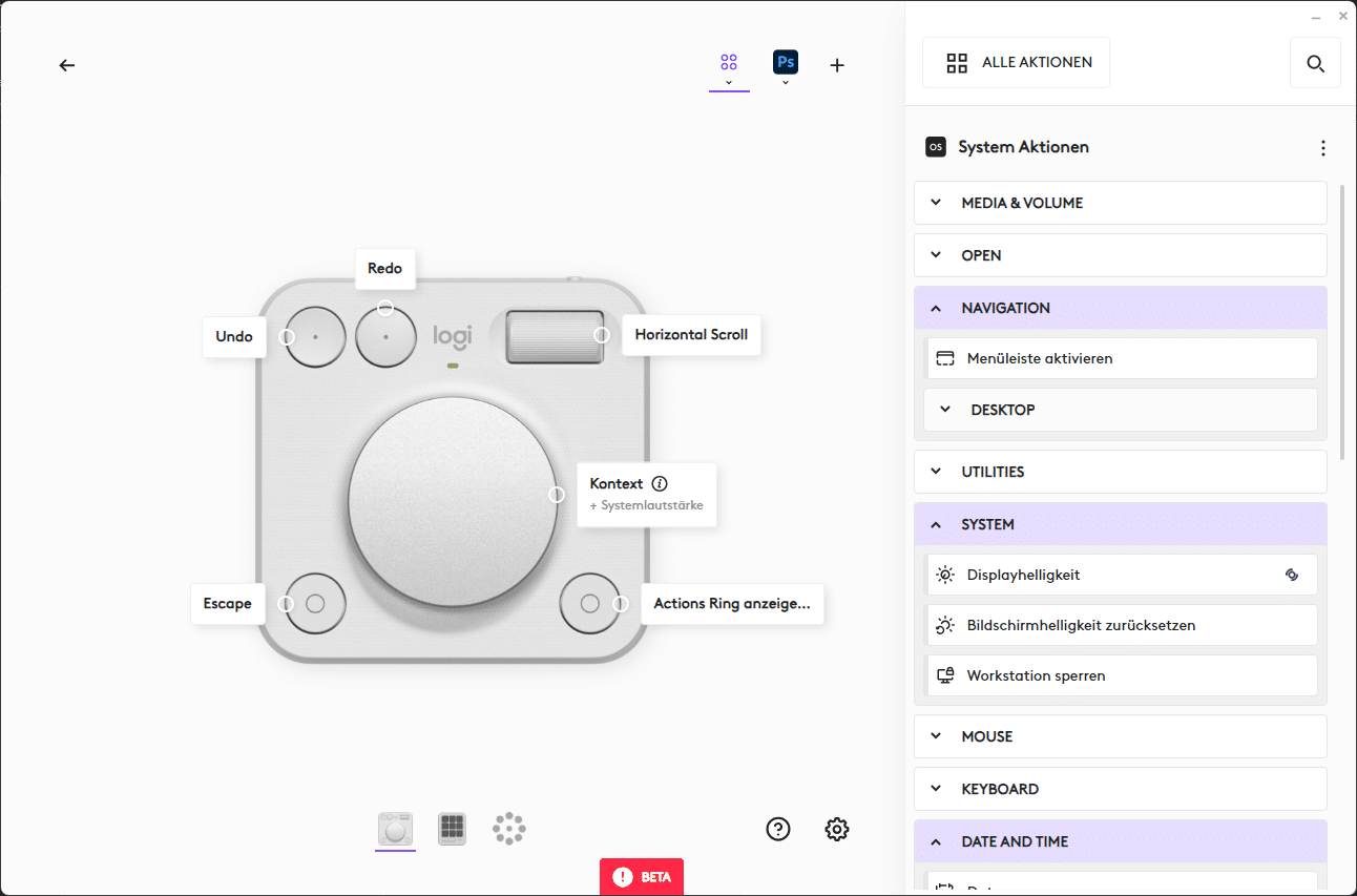 With other programs such as Asana, Affinity Photo 2 or DaVinci Resolve, the setup is much more complex in practice. In some cases, the options of the MX Creative Console are limited at system level, which makes manual adjustments necessary. For example, special functionalities of a software cannot be operated directly, but the corresponding key combination must be assigned to a key as a hotkey. This naturally limits the ease of use of non-native software to a certain extent. On the other hand, the automatic loading of application-specific profiles after configuration works very well. If you switch from Photoshop to Chrome, for example, the specially created profile is loaded directly and is ready for use.