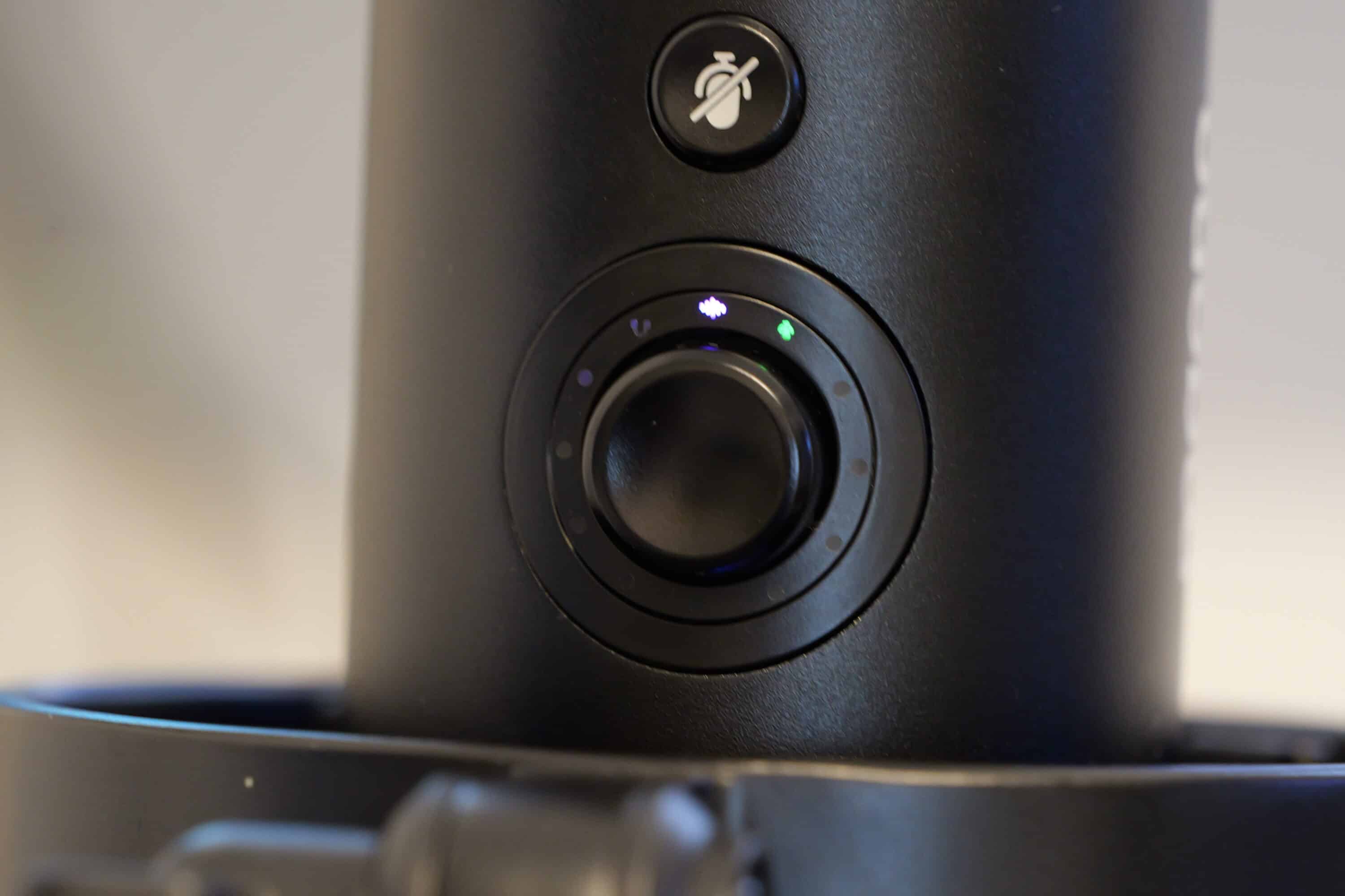 You can choose between the different modes with a click. By default, you regulate the volume (gain), which is indicated by white LEDs. The second mode adjusts the headphone volume (blue LEDs) if you have connected headphones directly to the microphone. The third mode, on the other hand, regulates the monitor mixing. Here you can adjust how the microphone monitoring noise and PC sound should relate to each other in terms of volume.