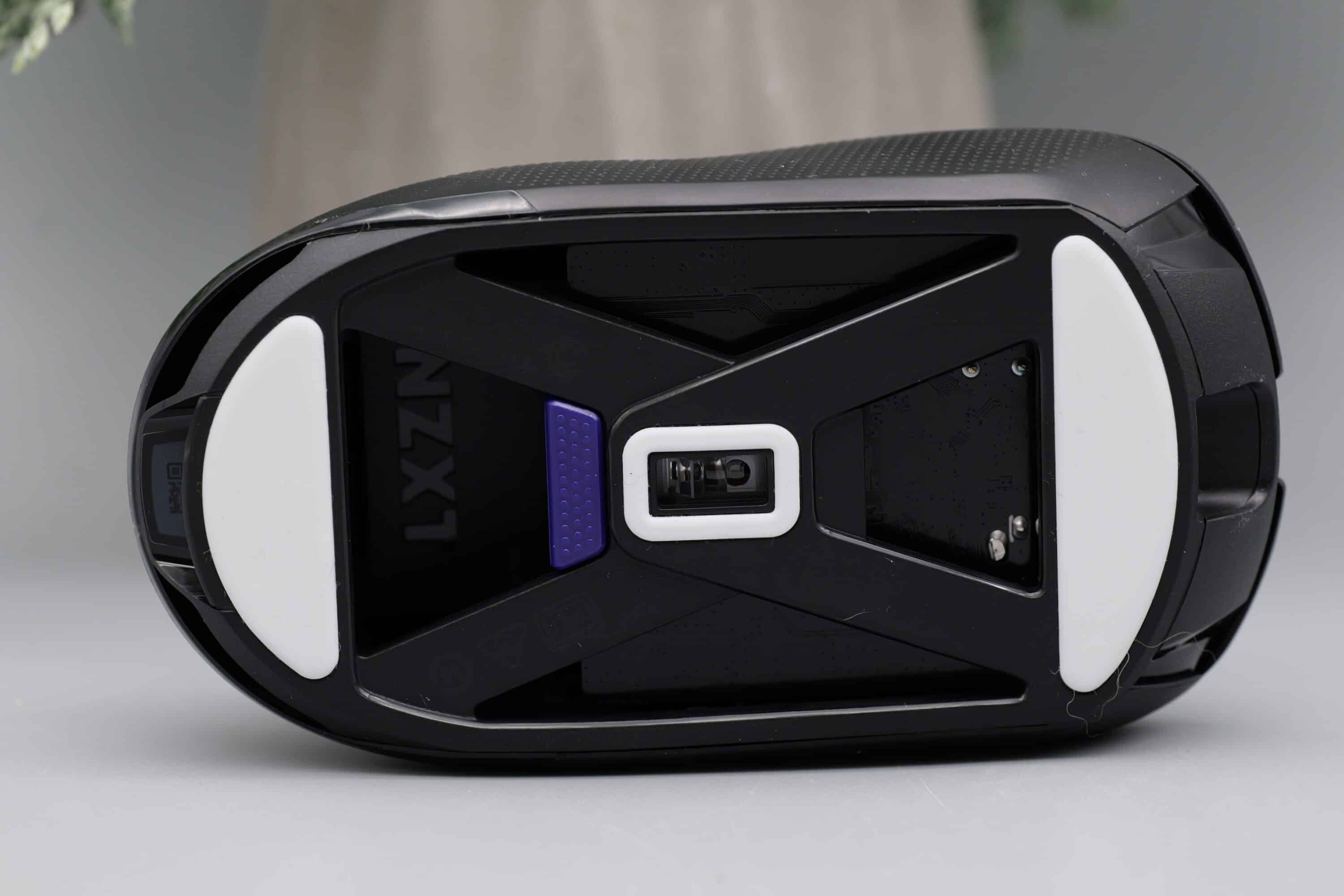 The NZXT Lift Elite Wireless has taken over the airy, open underside from the Lift 2, which has been expanded to include a striking purple button in addition to the PTFE gliding feet and the sensor. In addition to switching on and off, this button is responsible for changing profiles and DPI settings. After all, unlike the Lift 2, the thin plastic skeleton hardly gives at all under pressure, making the entire mouse appear more robust and of higher quality.