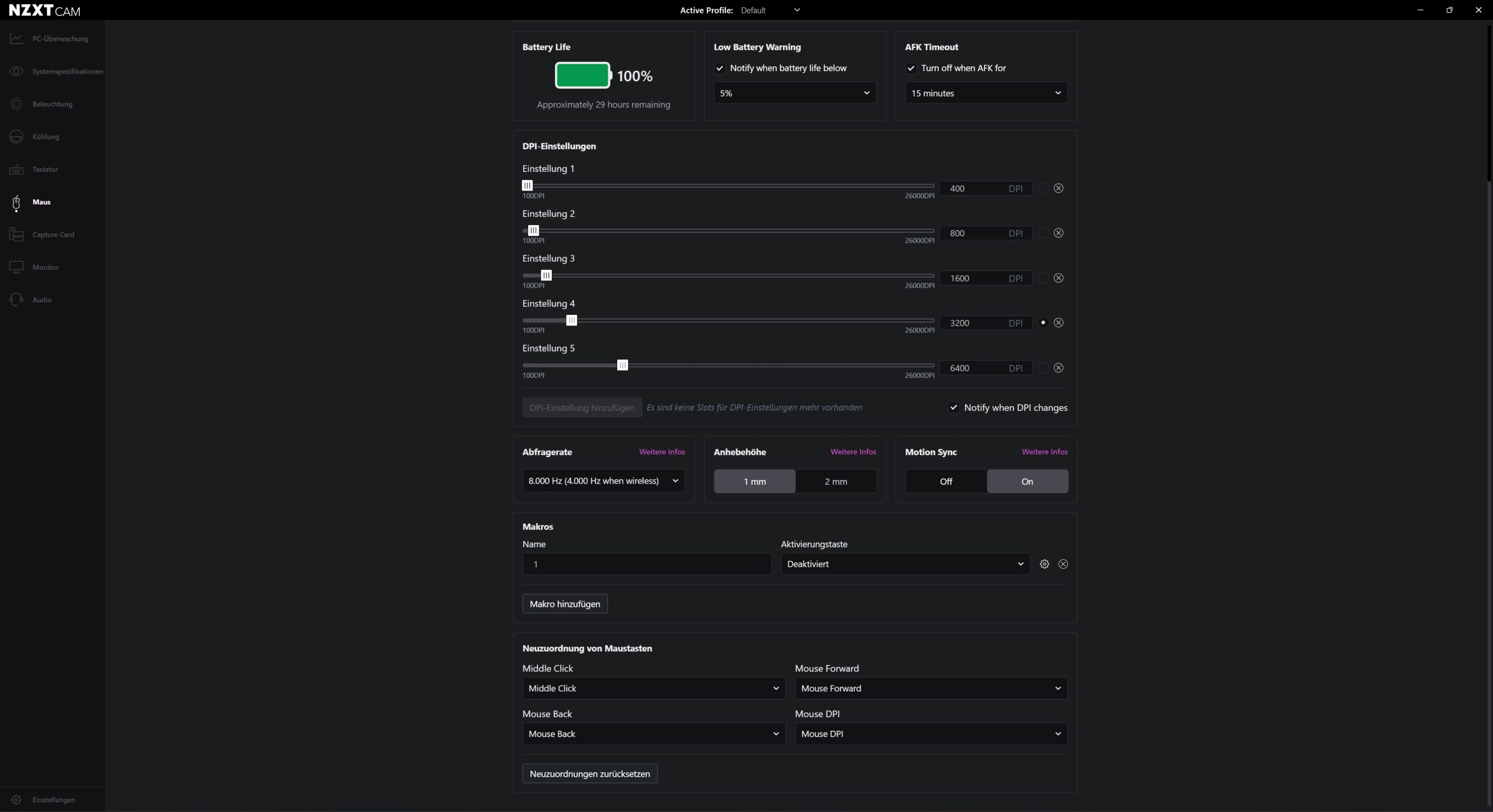Below this, you can adjust the DPI value of the five profiles, set the polling rate and adjust the lift-off distance and motion sync. The latter synchronizes the polling rate of the mouse sensor with that of the USB dongle and should ensure smoother, latency-free movements. However, I was unable to notice any real difference.