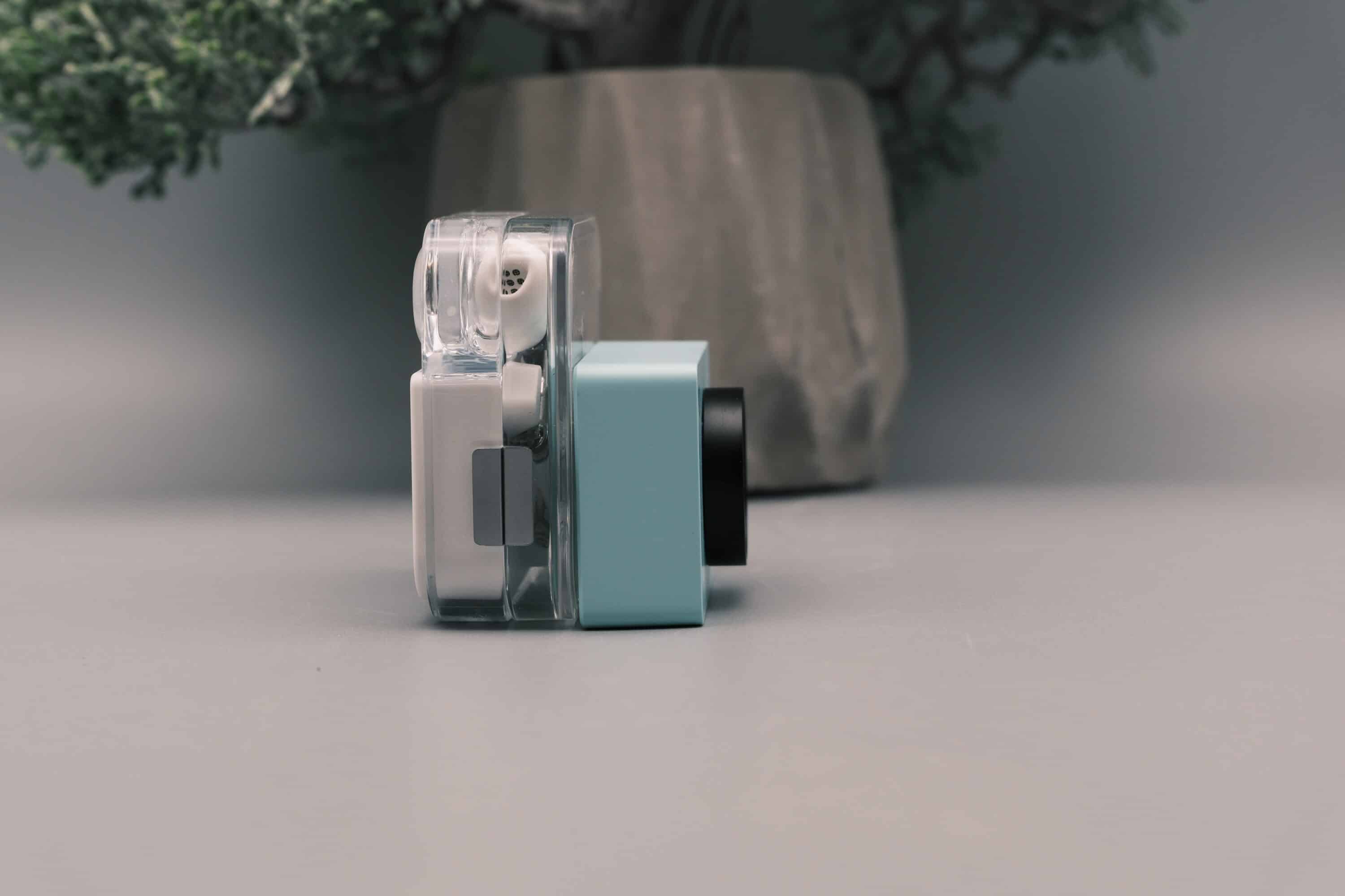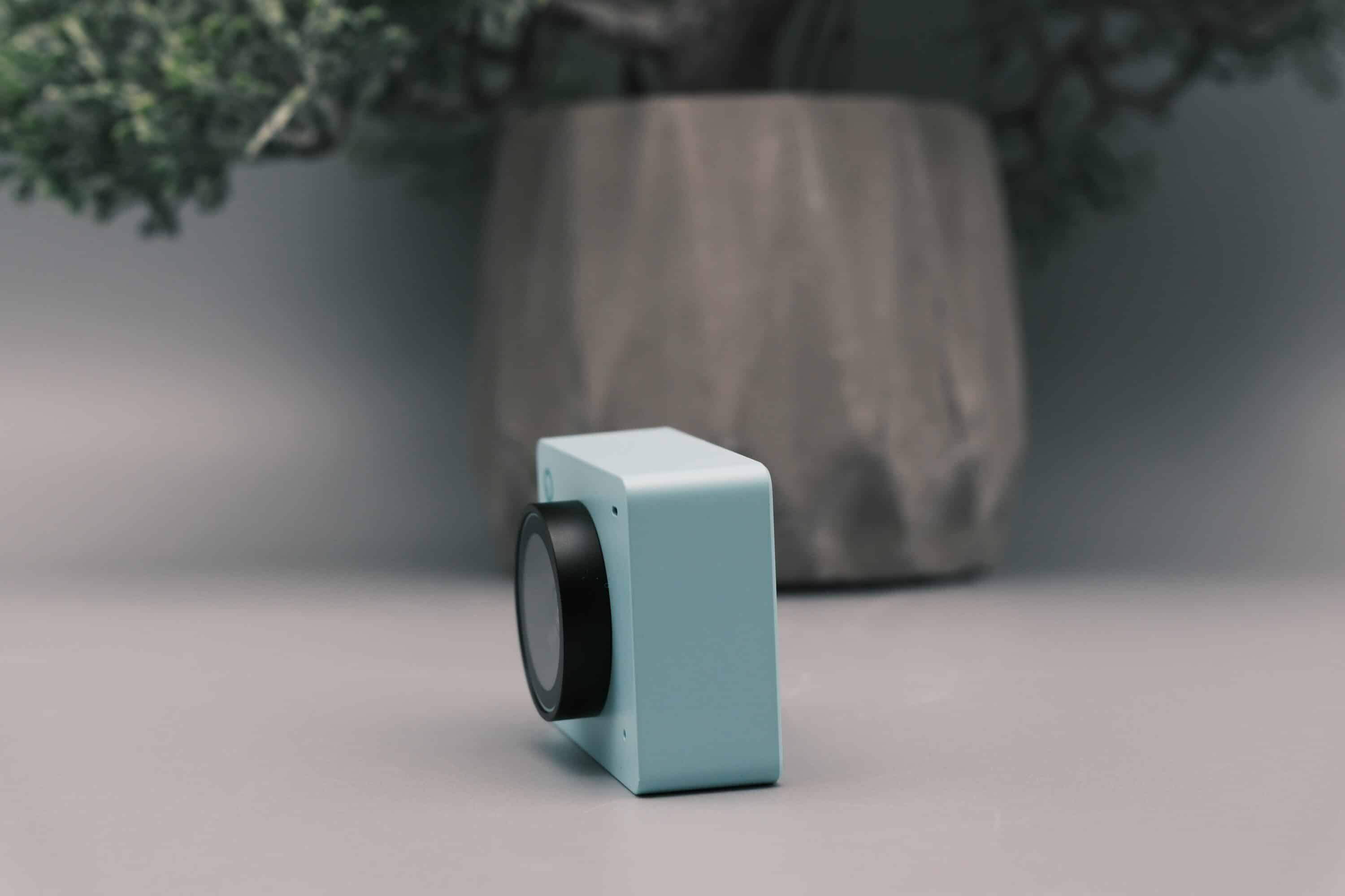 The camera measures just 45 mm x 36 mm x 22.2 mm and weighs just 40.5 grams. It is so tiny that it can easily be held with two fingers and is much smaller than the case of in-ear headphones – or the Tiny 2.