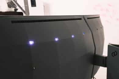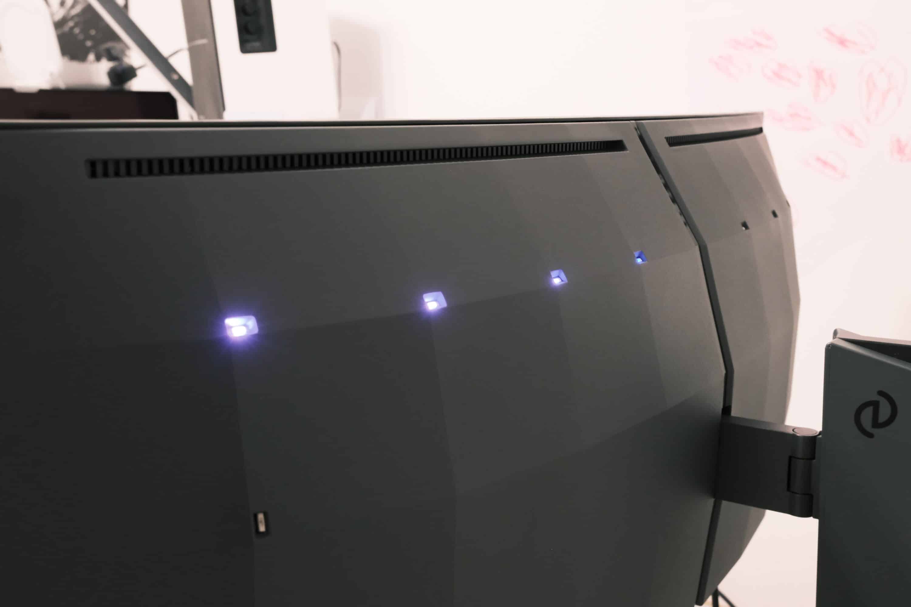 Things get exciting at the back, where the manufacturer’s typical Ambiglow lighting is used. A total of 14 LEDs are distributed across the entire back, which can be illuminated in various effects, for example. Thanks to the integrated AI-supported processor, the content shown on the display is also analyzed and the lighting adapts to the image content shown. A cool feature that improves immersion depending on the location of the monitor.