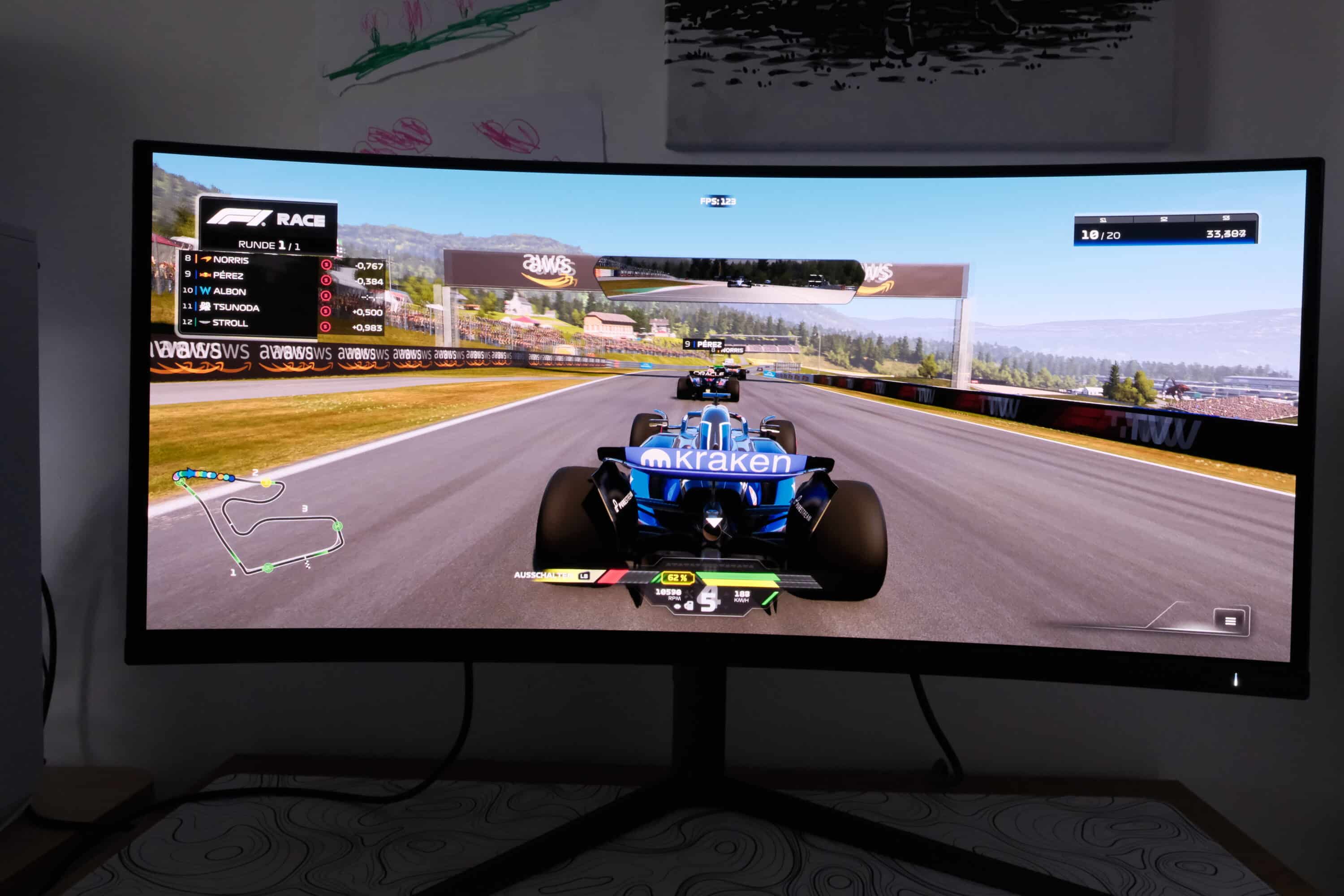 The 34-inch UWQHD QD OLED monitor delivers vibrant colors, excellent contrasts and a razor-sharp, vivid picture that doesn’t miss a beat. With the possible exception of the text display, which tends to fray from a short distance, although this is also much less pronounced than on other models.