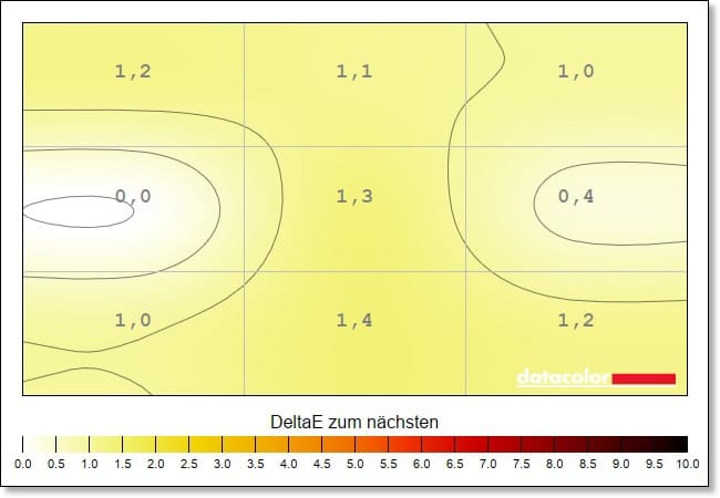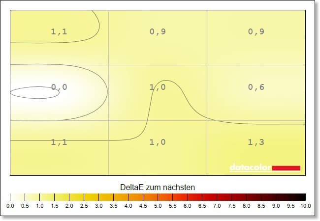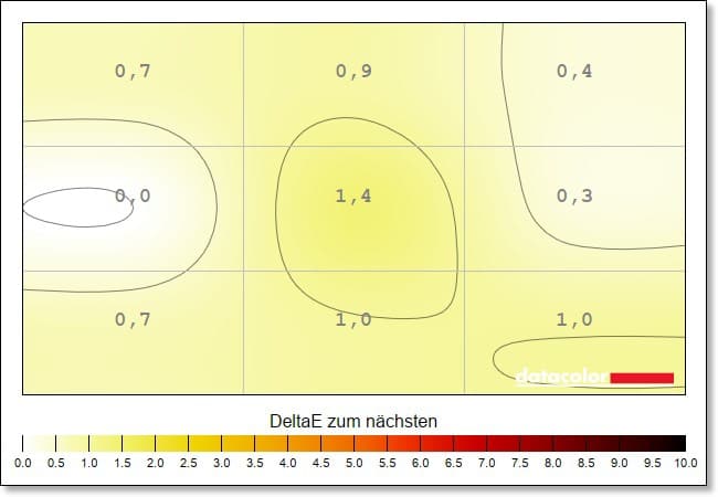The homogeneity of the display is also very good. Both in terms of color reproduction and brightness. The maximum deviation in color homogeneity is DeltaE 1.4 – which is a very low value. Other OLED displays offer significantly higher deviations here with values of more than 2.5, while cheaper VA and IPS panels even achieve values of 5.0 and more.