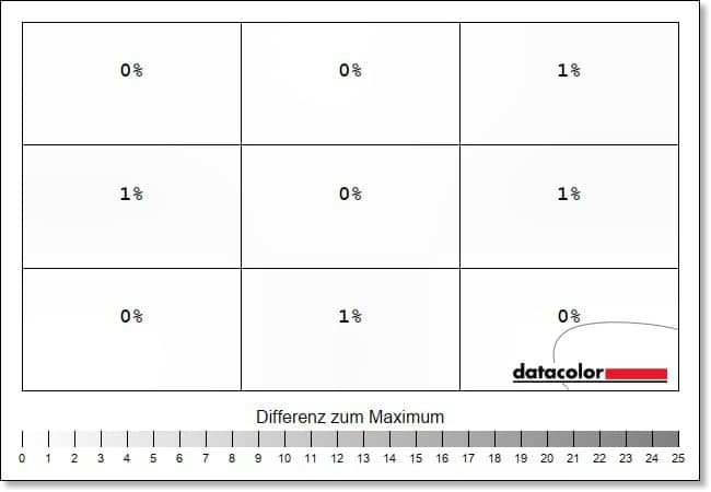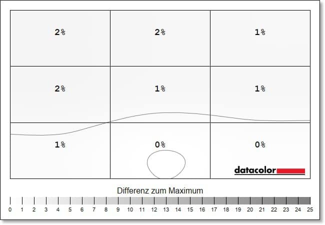 The homogeneity of the illumination on the PHILIPS Evnia 34M2C6500, on the other hand, is almost perfect. Here we measured a maximum deviation of 2 percent compared to the ideal value. Even among OLED displays, values of 5-10 percent are not uncommon.