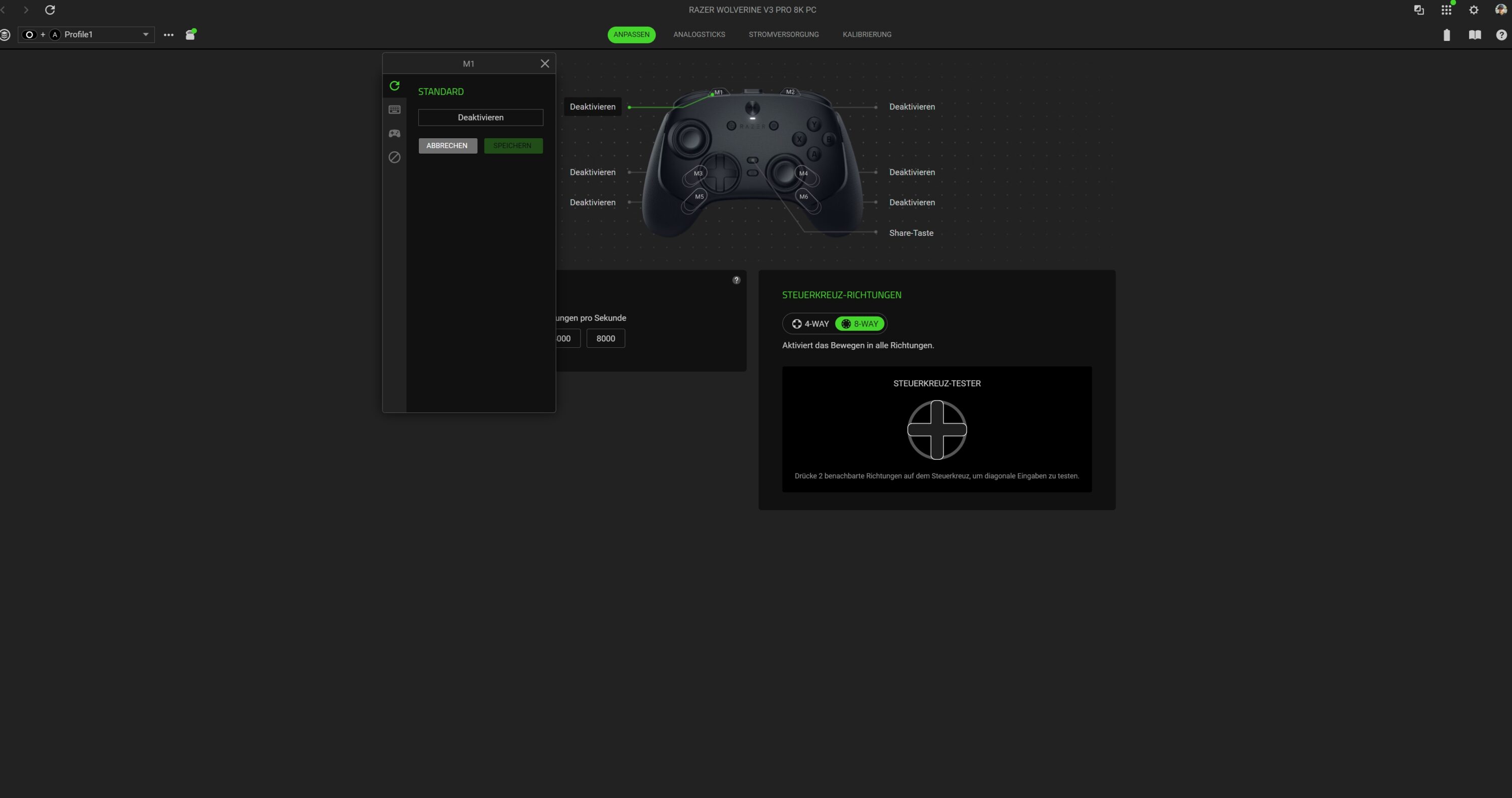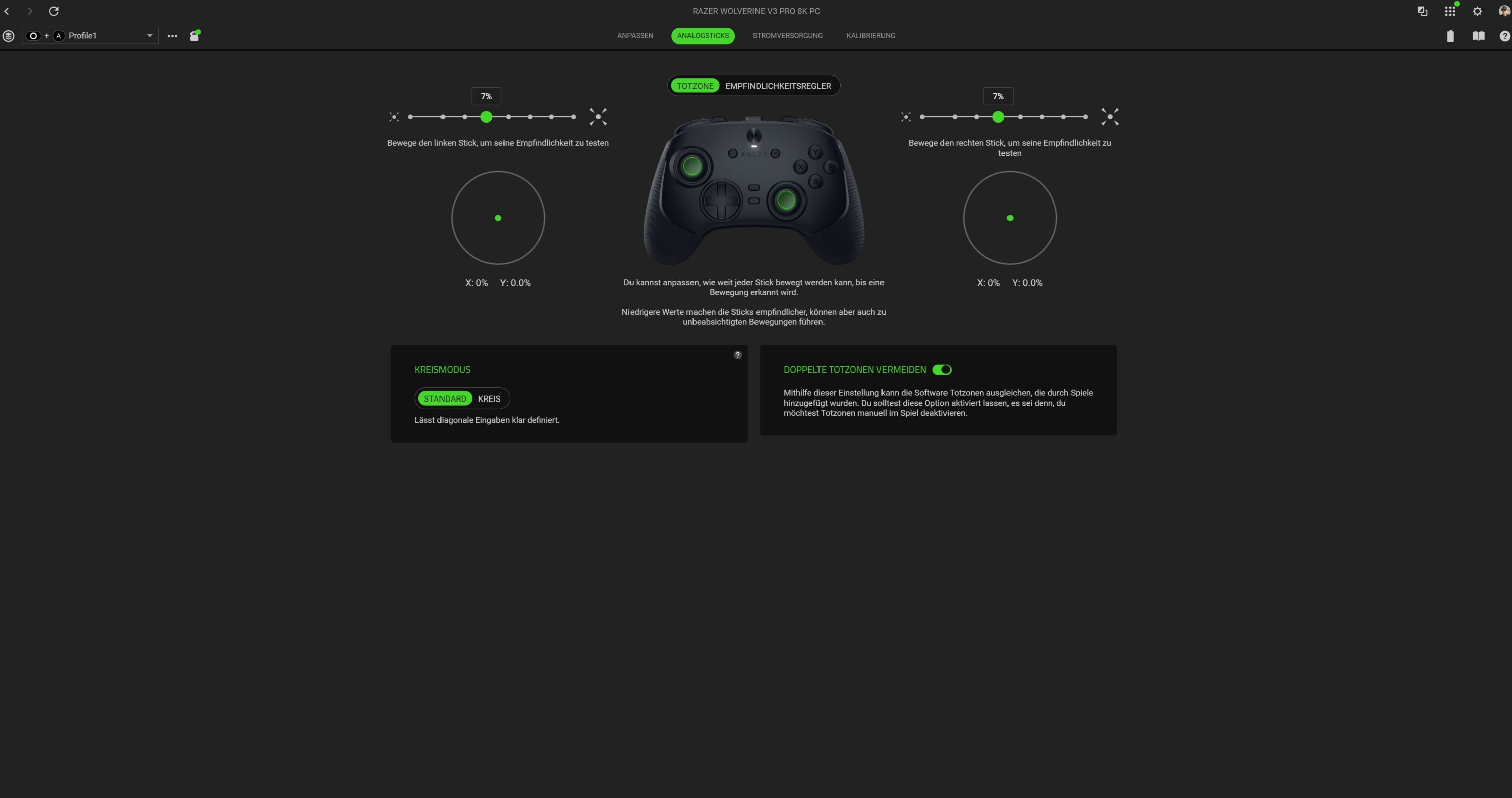 Synapse thus offers comprehensive control options – a powerful tool, especially for ambitious PC gamers. If you like, you can even adjust the dead zones of the analog sticks and change the responsiveness. Almost everything can be adjusted here. Top.