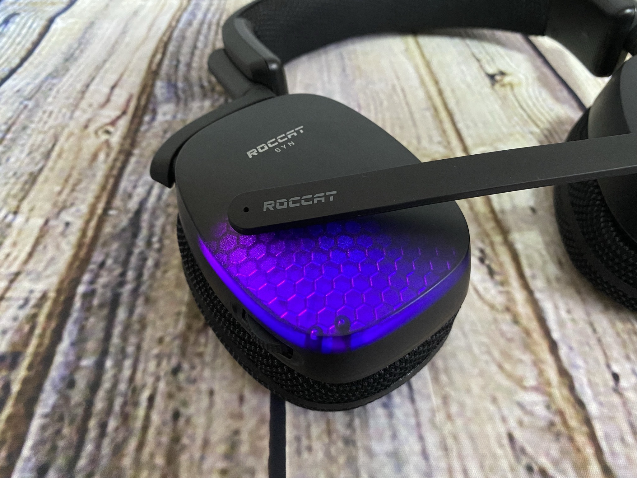 Let’s take a look at the most important part of the Syn Pro Air next – the ear cups. As mentioned, these are matte black and have the added feature of glowing in AIMO colors. For this, you can optionally download the new software called NEON. A silver ROCCAT lettering completes the design of the earcups. Inside the cushion, hidden behind a thin fabric, 50 mm Nanoclear speakers with Turtle Beach Superhuman Hearing technology have been installed. The goal is to be able to pay much more attention to the natural events in around 100 games. Footsteps, engine sounds or gunshots keep you alive 20% longer, according to a study by Turtle Beach. We will find out whether this is the case in practice later. Furthermore, the speakers offer 3D audio with traditional surround sound.