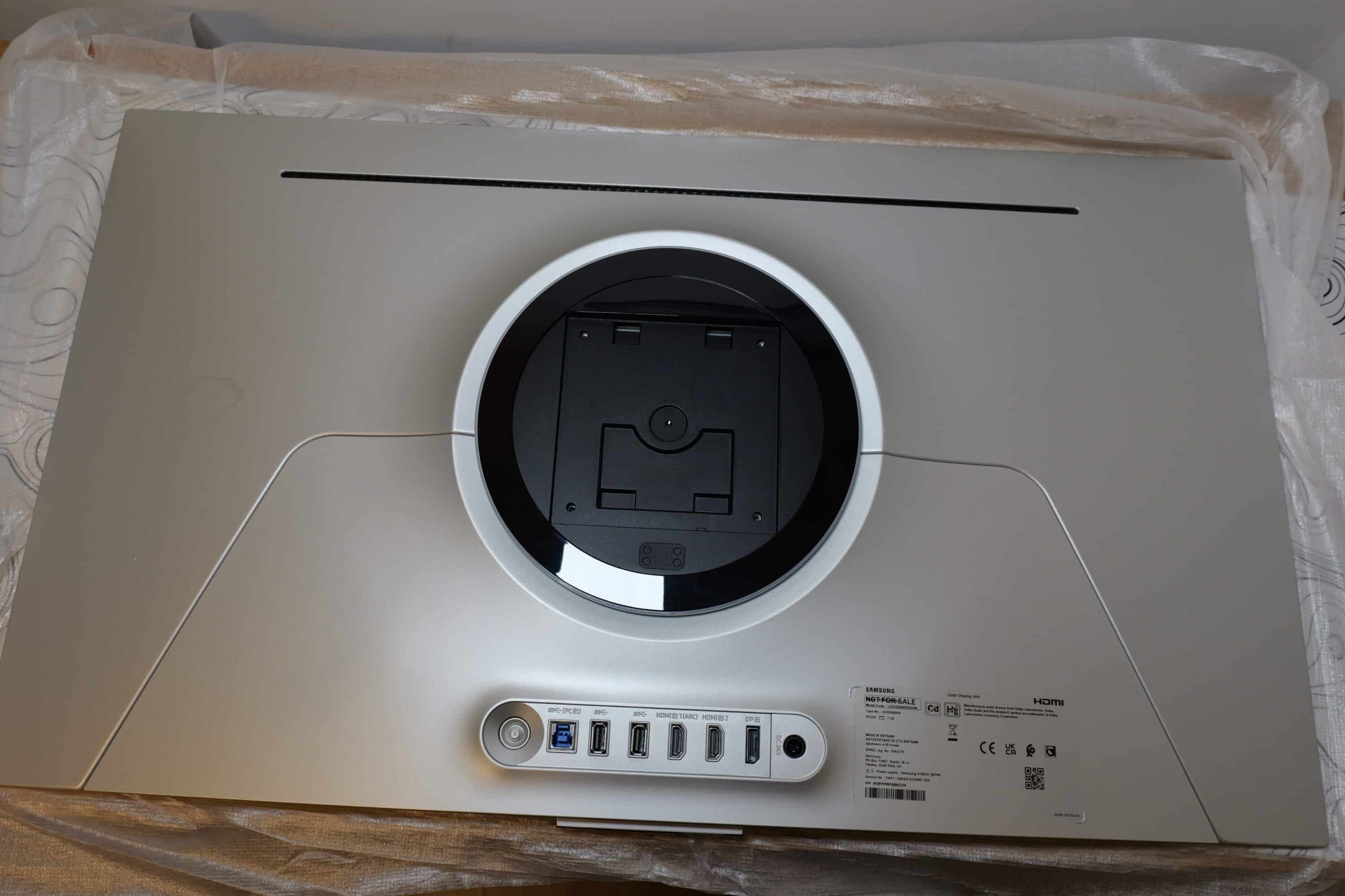 The connections of the Samsung Odyssey OLED G8 G80SD monitor are located in the middle of the back of the monitor and are easily accessible. You can choose from the following ports: