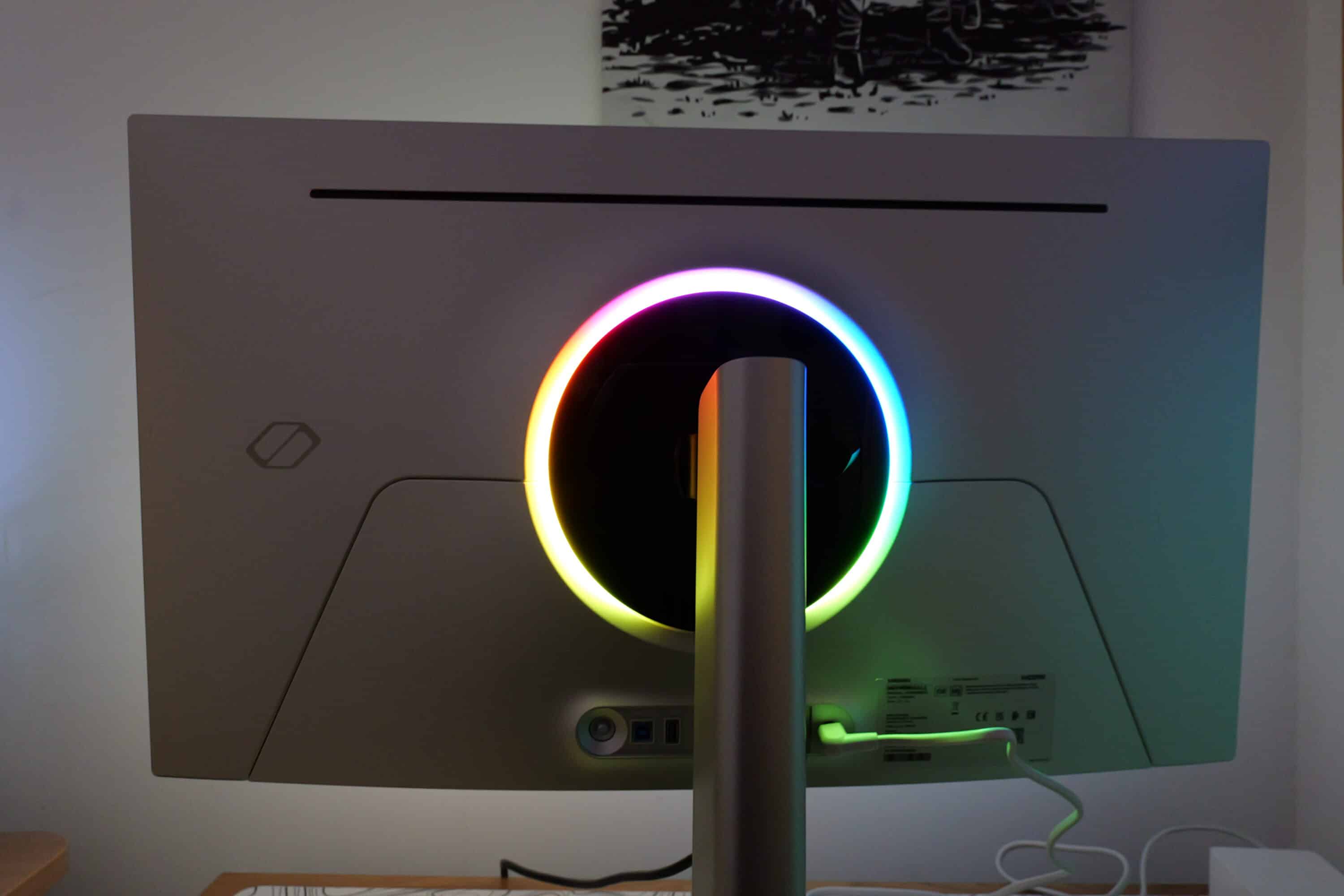 Of course, the monitor also comes with attractive and customizable RGB lighting, which – as is familiar from Samsung – extends around the bracket on the back as an illuminated ring. The lighting can be customized within the menu.