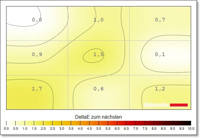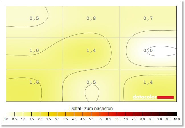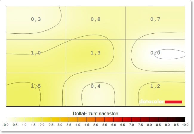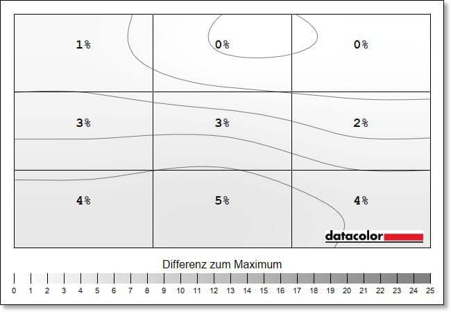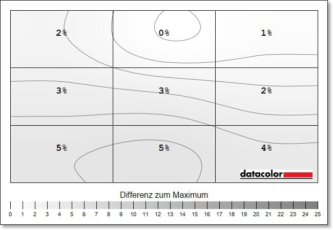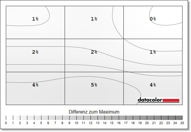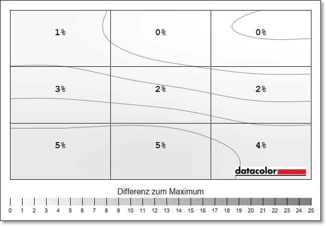 The luminance homogeneity, i.e. the evenness of the brightness distribution, is also at a very good level. The deviations here are a maximum of 5 percent.