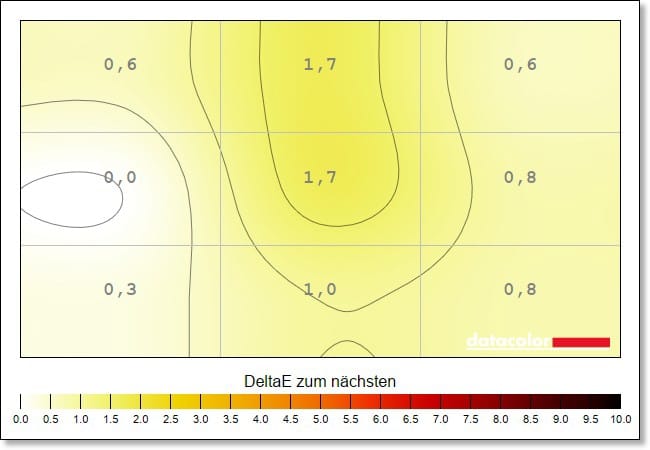 The color homogeneity, which describes the balance of the color representation, is also very good. This is at a very good level across all brightness levels. The maximum deviation is DeltaE 1.7 at a brightness of 50 percent.