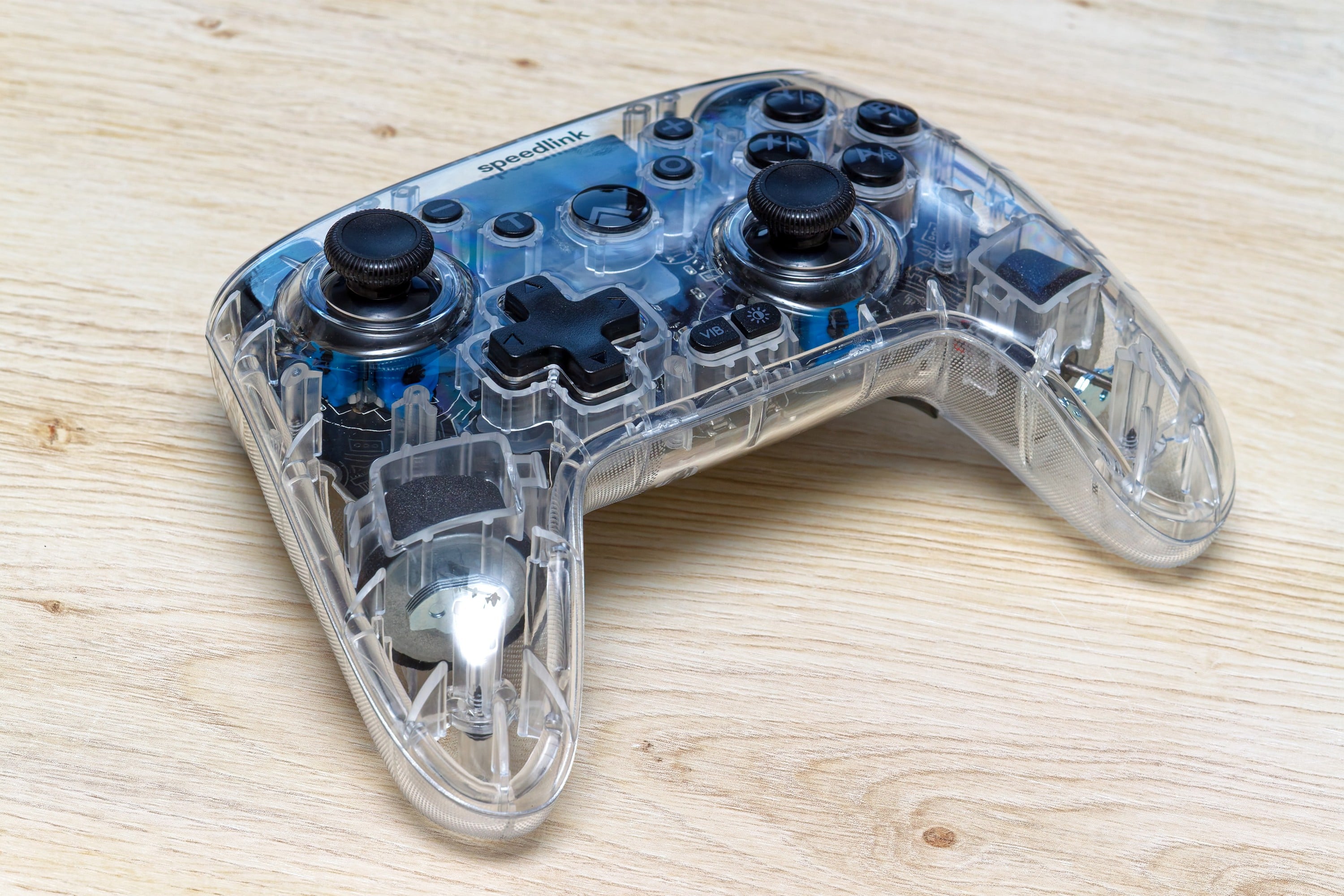 The special visual feature of the Speedlink Rait NX is definitely the use of transparent plastic. This gives you a perfect view of the internal components, from soldering points to connectors, the buttons and the vibration motors on both sides. Apart from that, the design is very similar to a typical XBOX controller, albeit with a few additional buttons, such as those for light and vibration control.