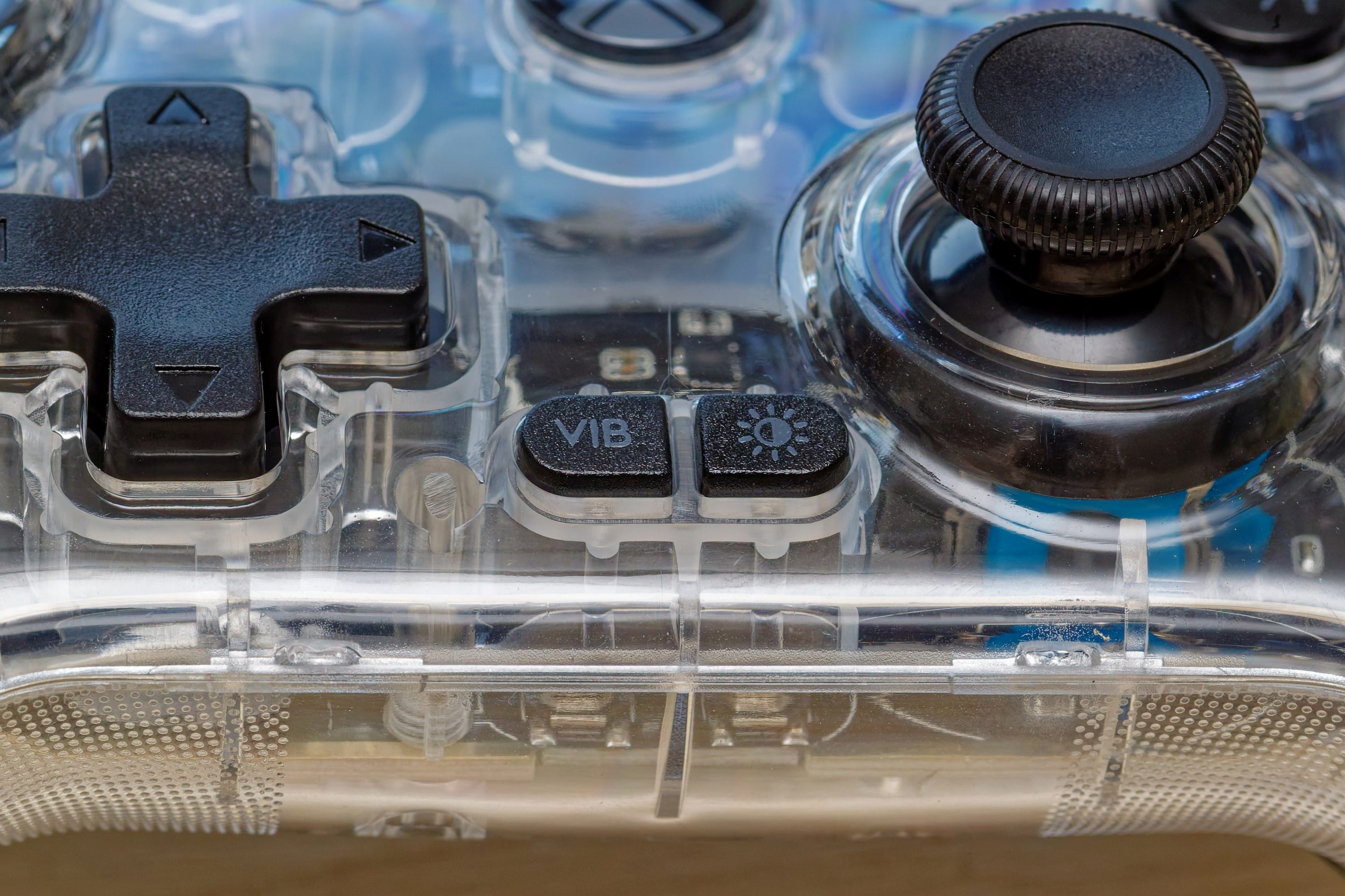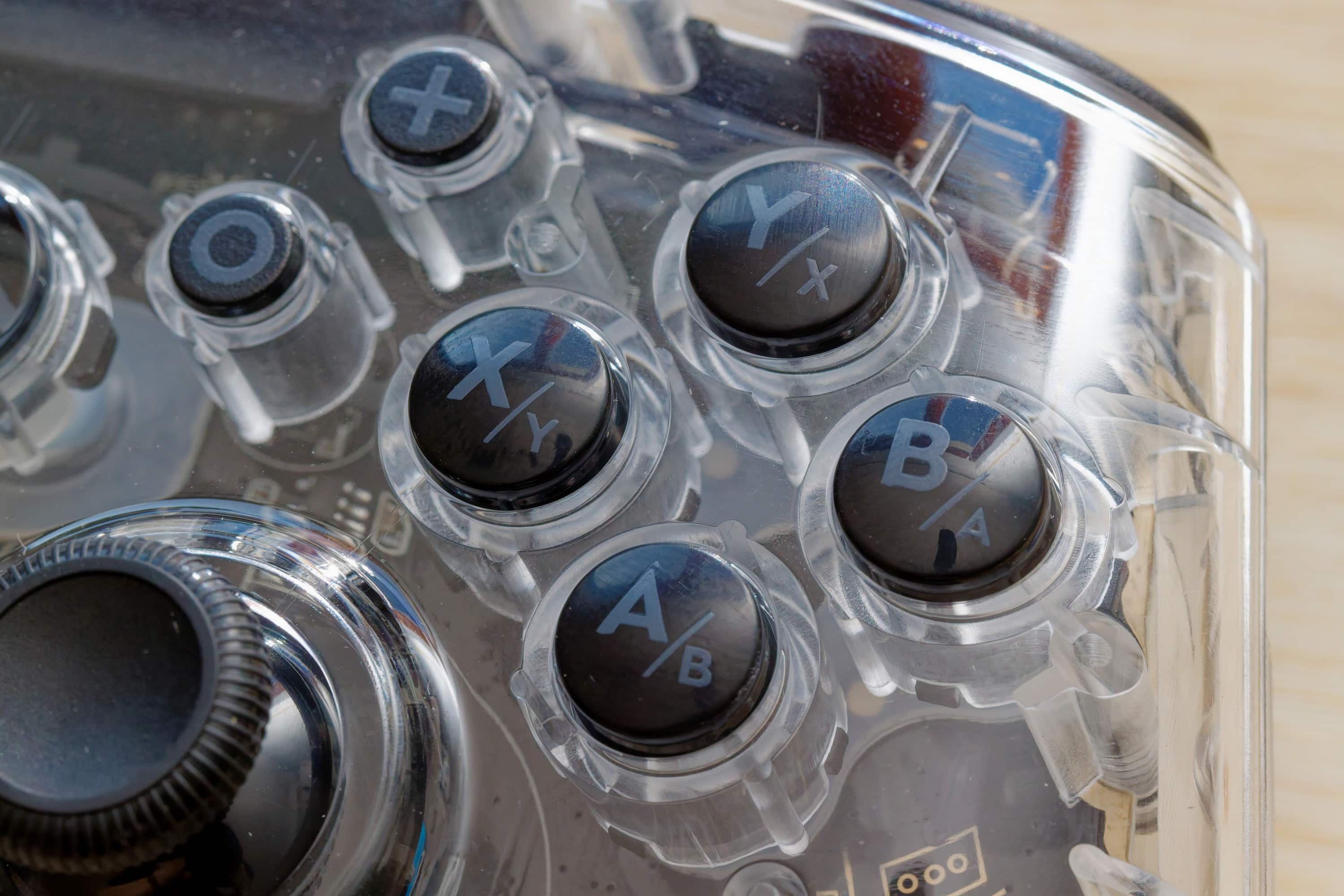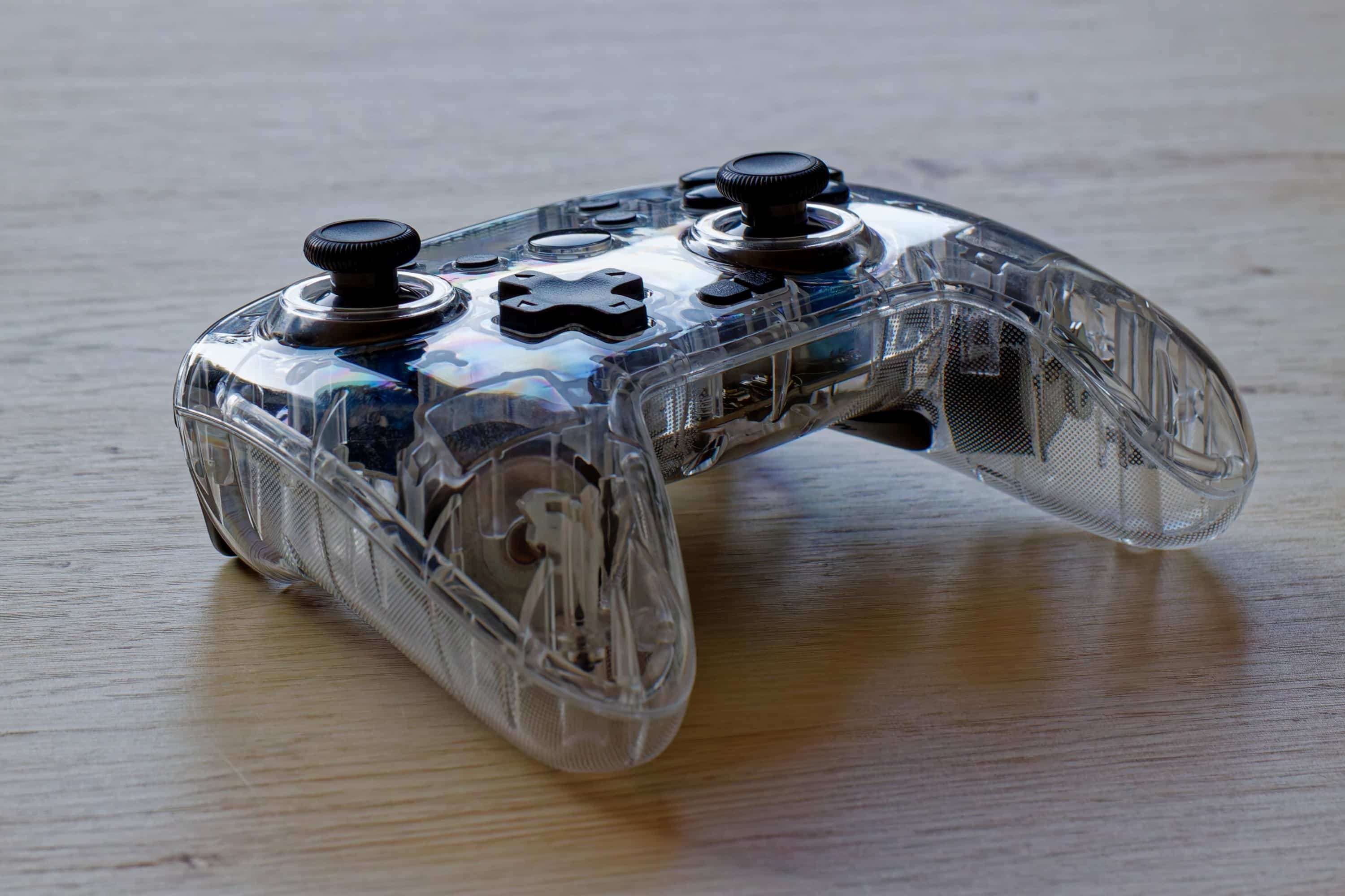 Hmmm… yes, you can feel that it’s a cheaper controller. The high-gloss plastic doesn’t feel quite as high-quality as matt-textured controller housings. But that’s what makes it possible to see through the case in the first place, which would be blurred with a textured surface. It is therefore a compromise that is necessary for the look. The buttons themselves feel quite high-quality, but are not really quiet – especially when you let go of them. There is also no rubber coating for the grip, but the handles get a better grip and a more valuable feel because they are a bit textured.