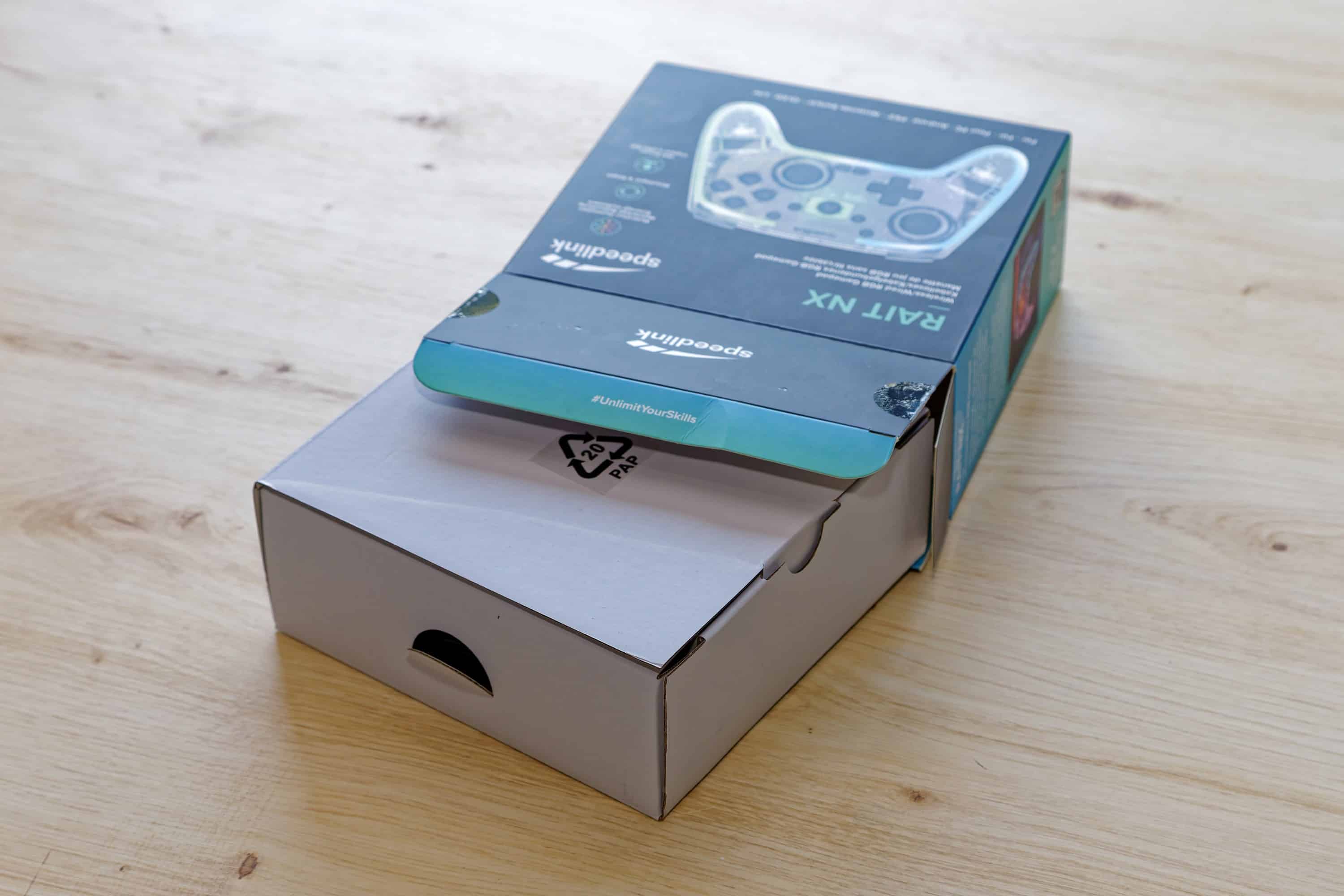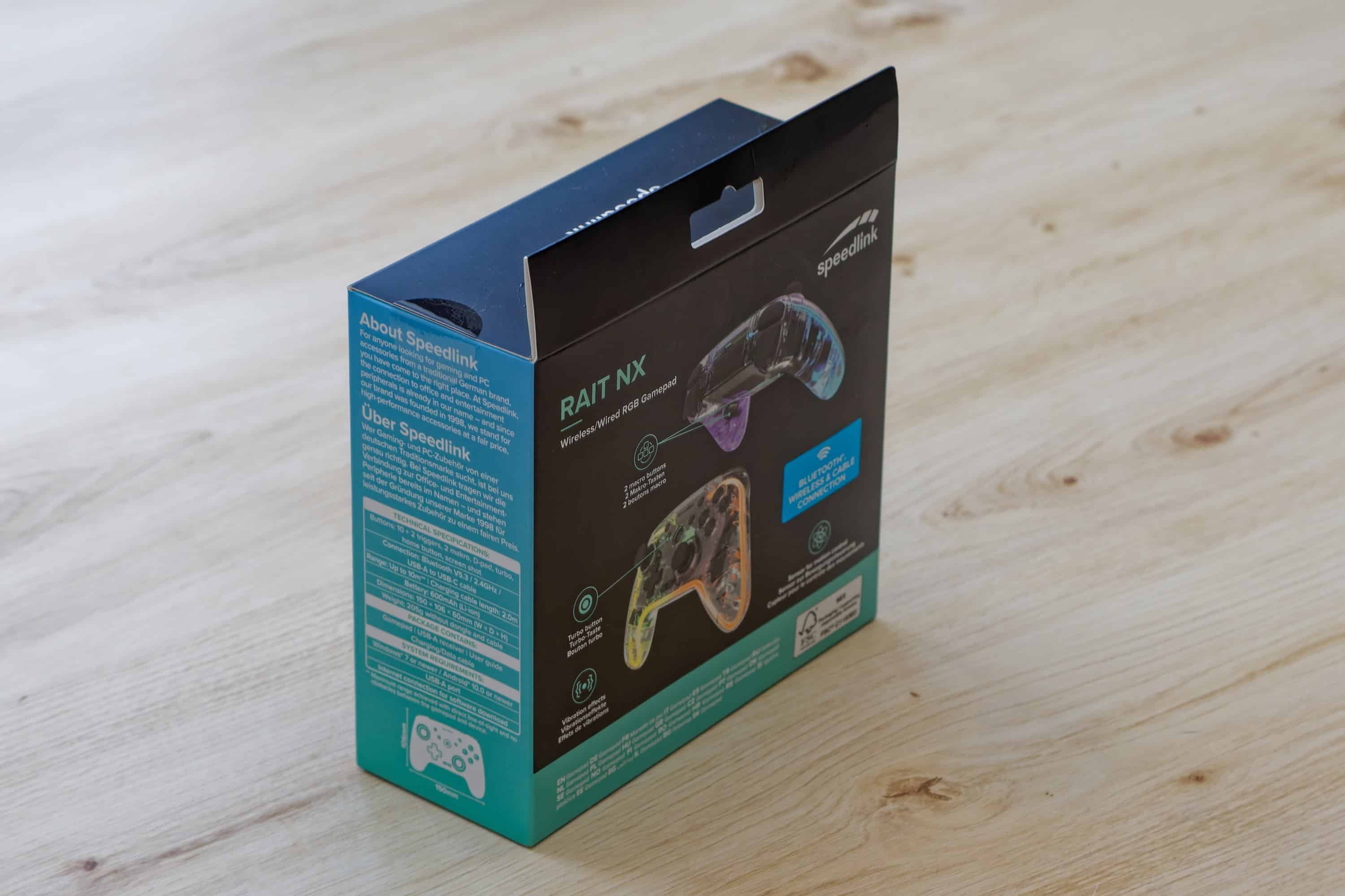 The packaging of the Speedlink Rait NX is kept quite simple, as is to be expected and indeed desirable in the low price range. The box is dark and quite inconspicuously designed, but not strikingly conspicuous, with the controller even standing out slightly on a shiny reflective surface. Otherwise, the information is in English and German and the most important specifications are partly in a table and partly on the front as individual items. To be honest, I probably wouldn’t take a closer look at the controller based on the packaging if I saw it in a store.