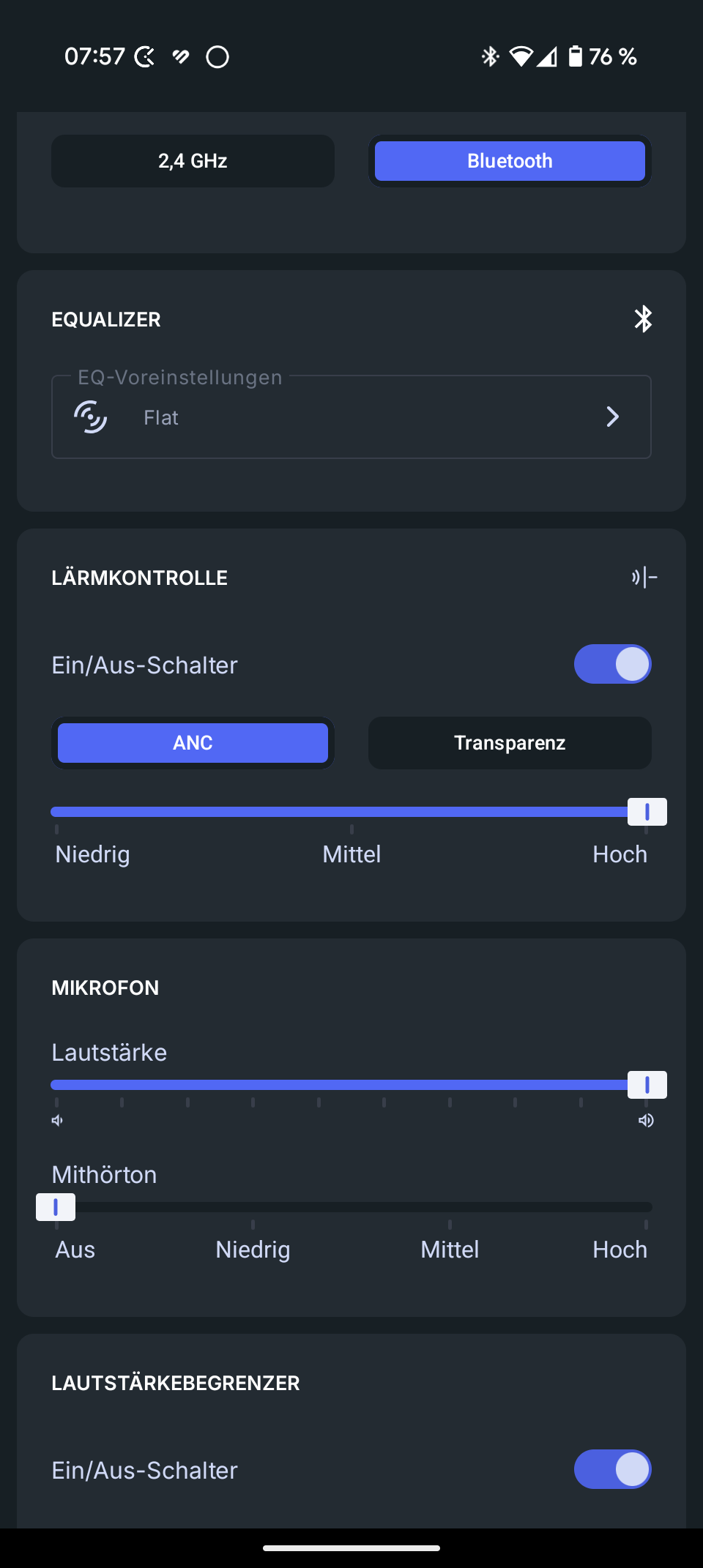 In the app, you can change the audio mode, adjust the volume (individually for both modes), activate or deactivate the active noise suppression (“noise control”) and adjust the intensity, increase or decrease the microphone volume, add a sidetone and deactivate the wearer detection if desired.