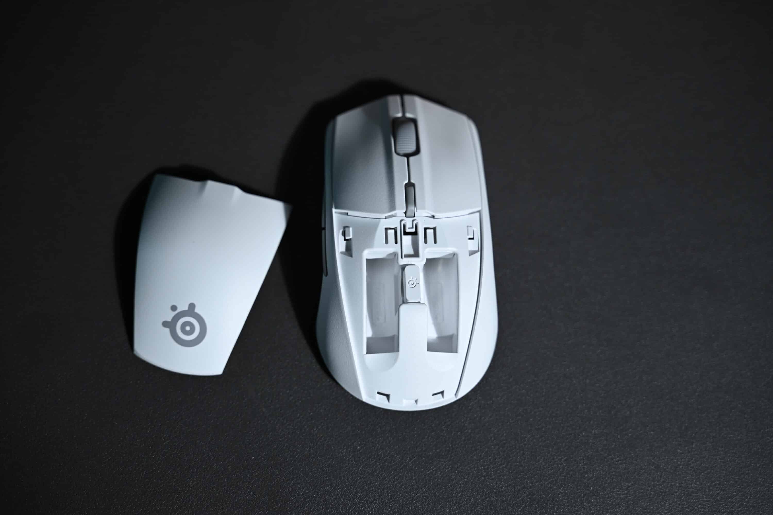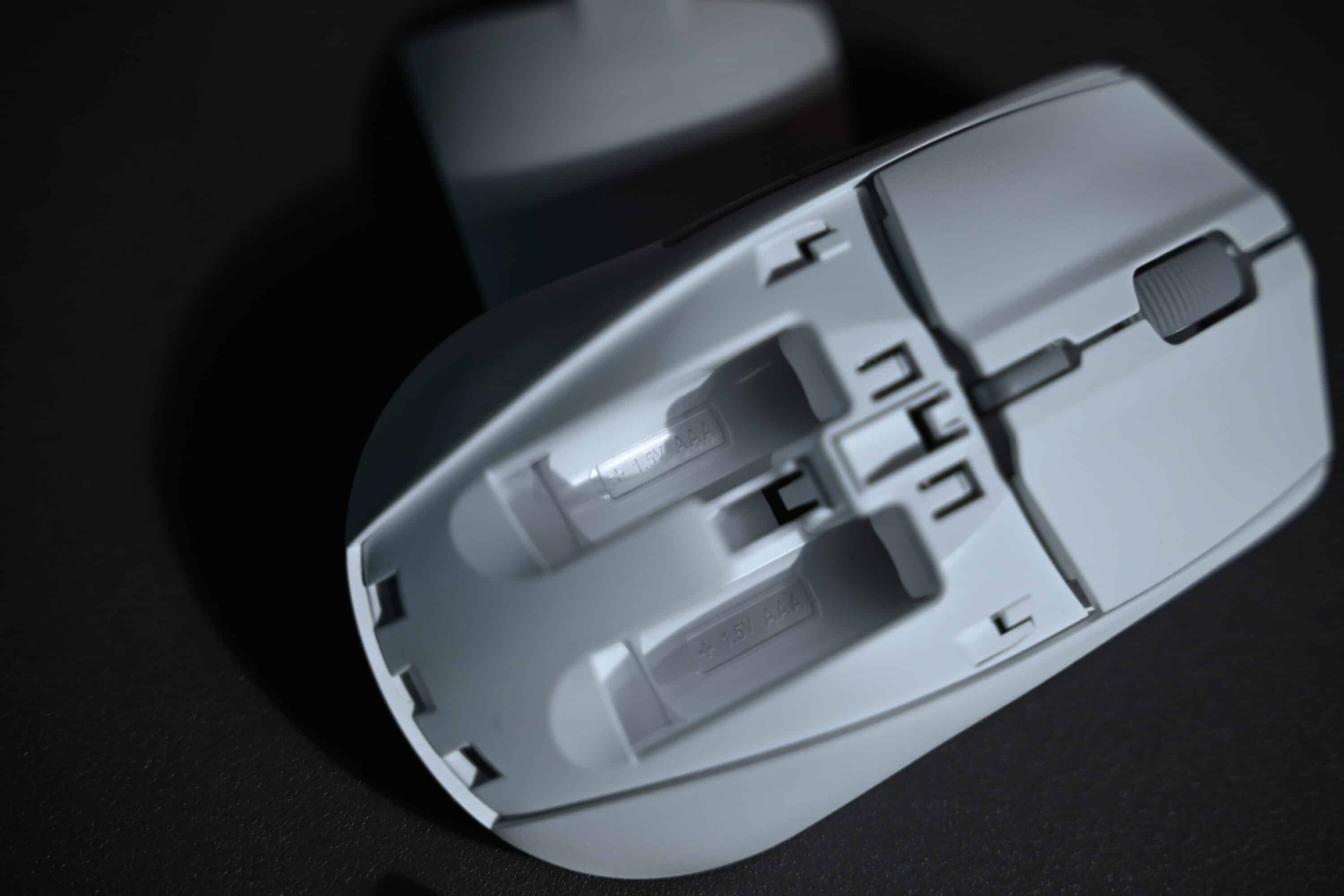 As with the first model, the back of the SteelSeries Rival 3 Wireless Gen 2 mouse can be removed. The two AAA batteries, which are included in the scope of delivery, are stored underneath. This also shows why the mouse comes without a rechargeable battery, because using it with standard batteries is extremely practical – especially if you use rechargeable AAA batteries, which is also possible without any problems.