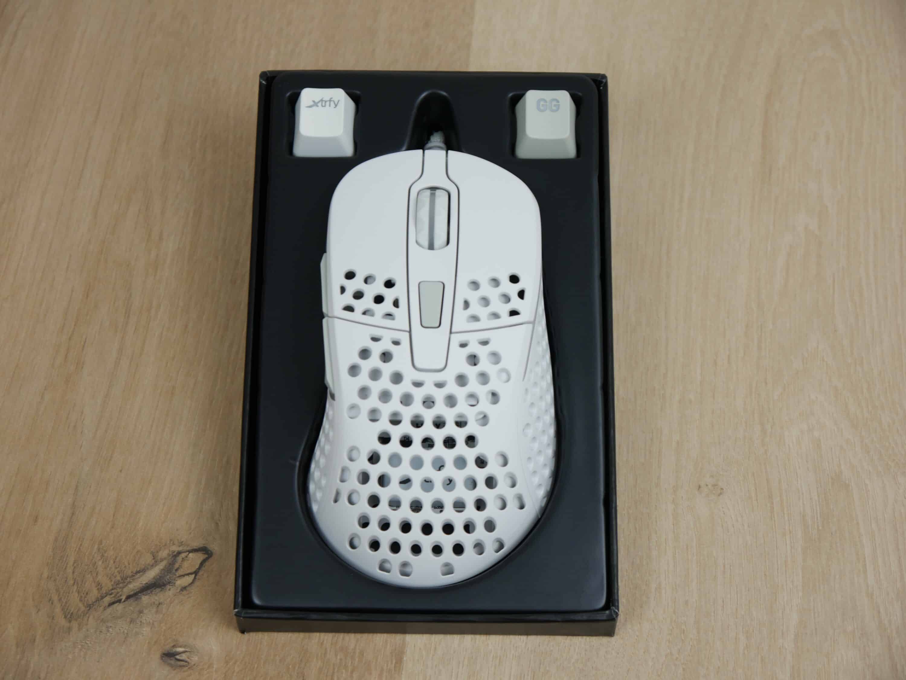 First, let’s have a look at what’s in the box. Beside the mouse there is not much to expect, because almost all of them are plug-and-play and therefore no extra software is necessary. But Xtrfy has come up with something here and so besides the mouse there are also two extra keys with the Xtrfy and GG lettering that can be used on almost any keyboard. In addition to a quick guide there are also new gliders for the mouse in the packaging, which is by far not a standard. A really nice feature!