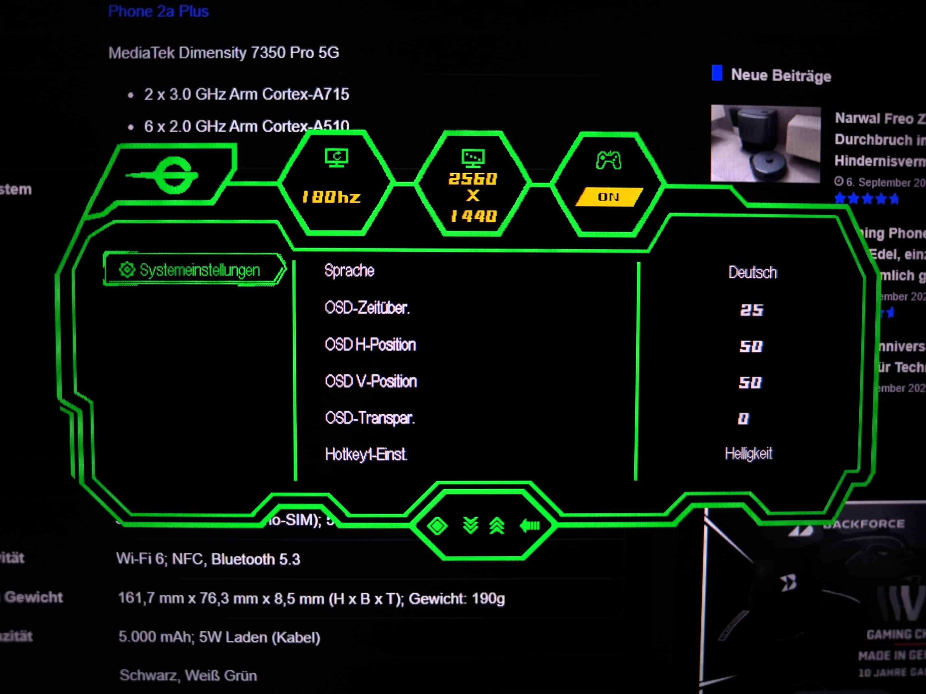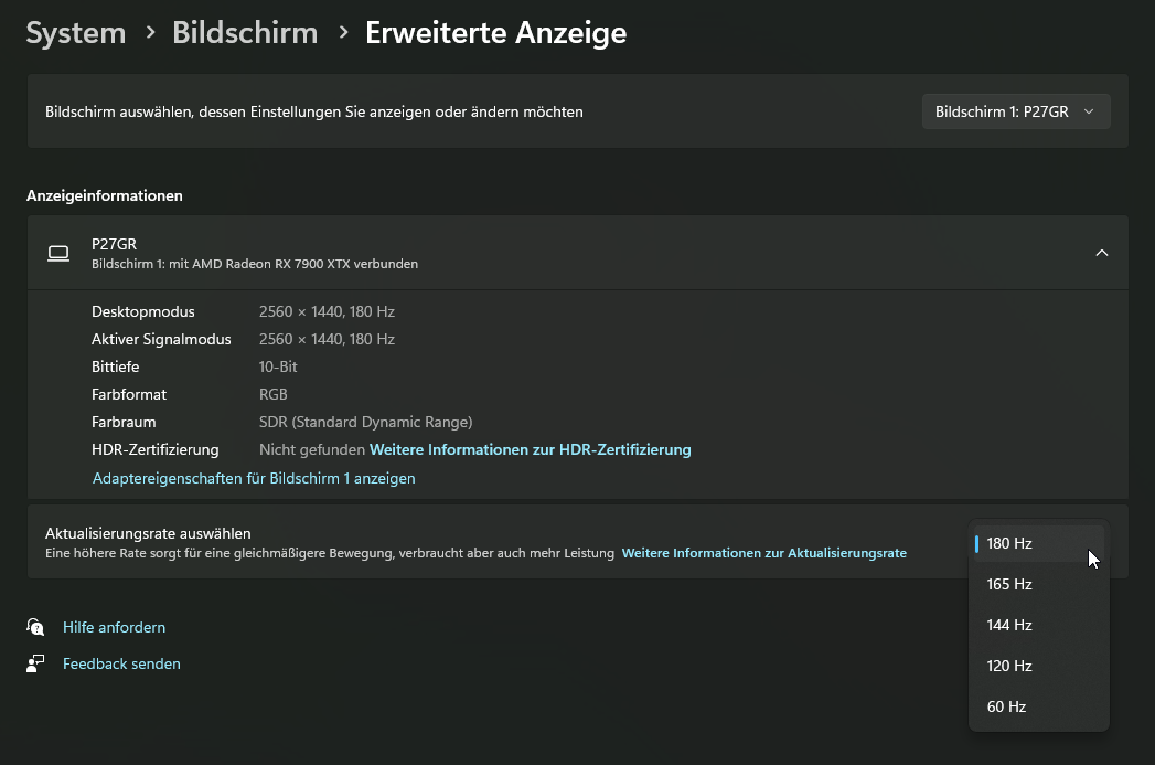 The TITAN ARMY P27GR has a resolution of 2560×1440 pixels in the classic 16:9 format. This is still a good value for gaming, even if more and more monitors are now moving towards widescreen and thus to the 21:9 format. However, those who prefer this usually have to dig a little deeper into their pockets. The pixel density is 108 ppi, based on the WQHD resolution and taking into account the display size of 27″. Apart from this, the refresh rate of the P27GR is up to 180 Hz via the DisplayPort connection. Throttling to intermediate levels such as 120 Hz, 144 Hz or 165 Hz is also possible. To be able to use the HDR functionality, it must first be activated manually in the OSD. Otherwise, the monitor is initially recognized by Windows as “Not supported”.