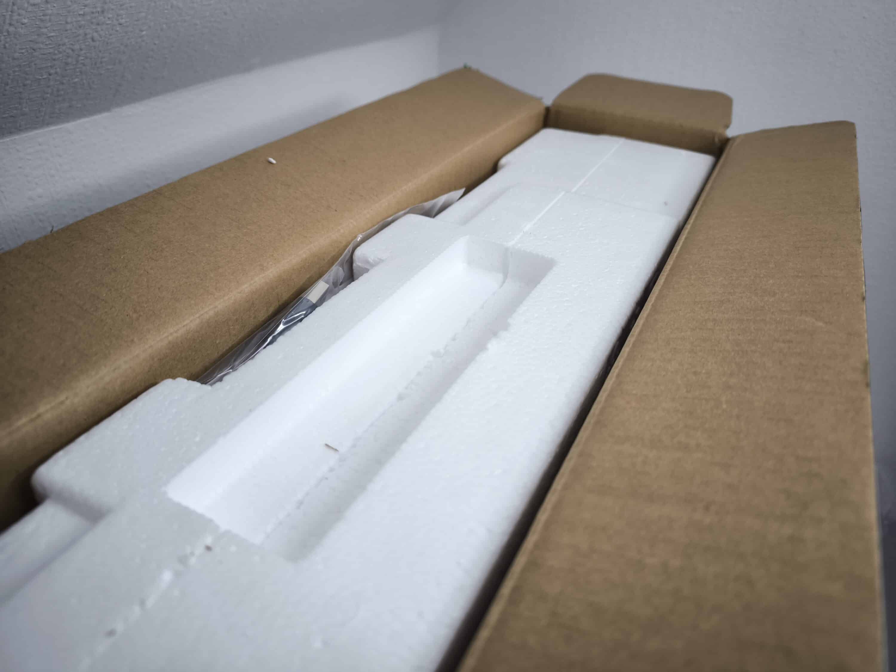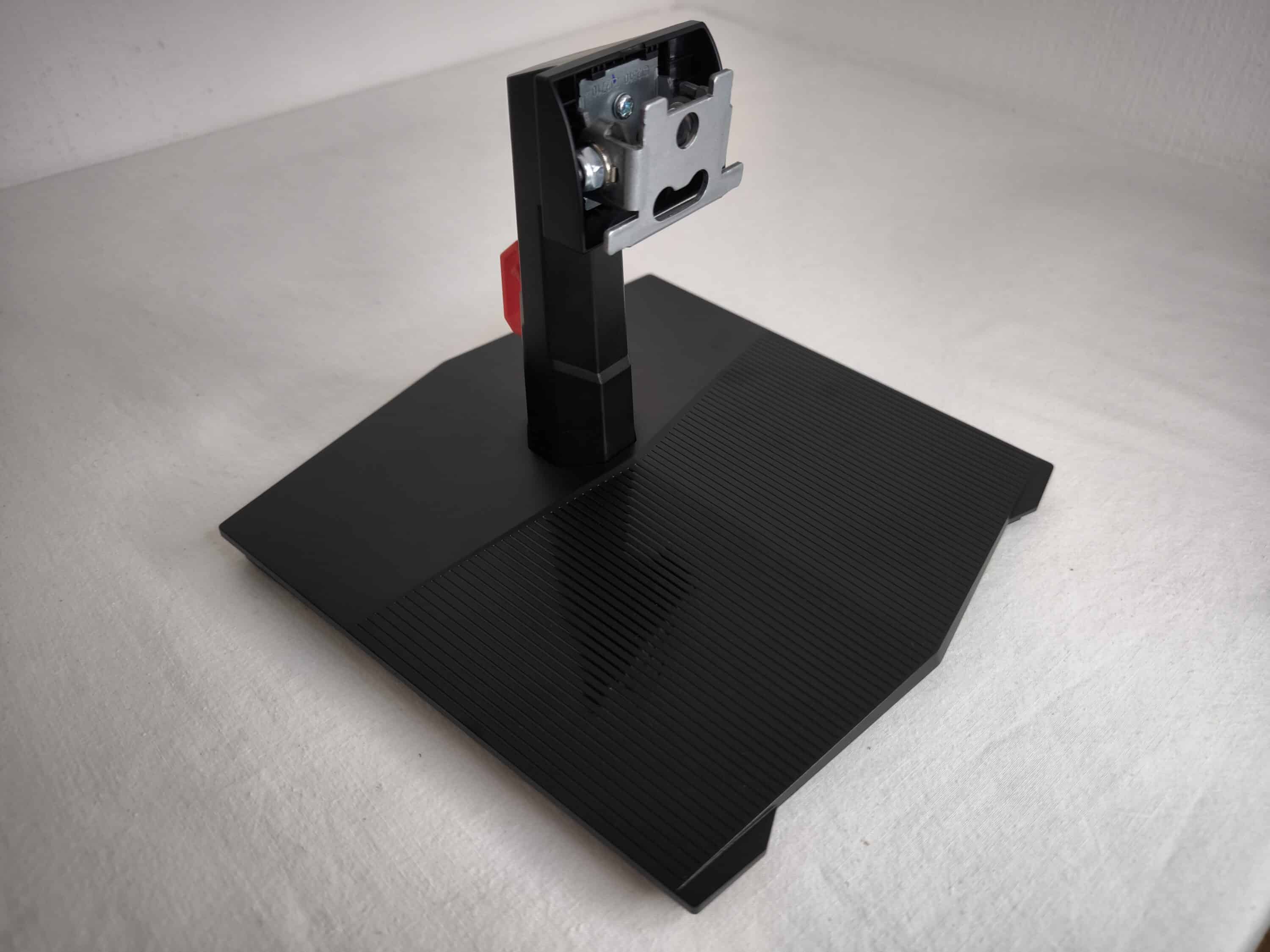 In addition to the gaming monitor itself, the scope of delivery also includes the corresponding stand, which consists of two parts. The connection loop is already pre-attached to the stand and is highlighted with a red accent. A Displayport cable, the power supply unit and the user manual, which is also available in digital format, round off the package.
