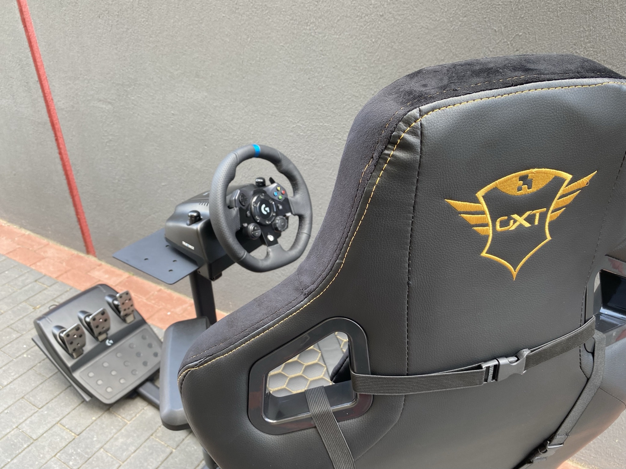 The overall quality made a good impression, now we just have to get the performance GXT 1150 Pacer Racing Seat Adapters right. In the first step, we have to decide on any suitable chair – for this, we took the Trust GXT 712 Resto Pro gaming chair that we have already tested to help us. On top of that comes a steering wheel, in this case the Logitech G923 TRUEFORCE. Once everything is mounted and adjusted, the fun can begin.