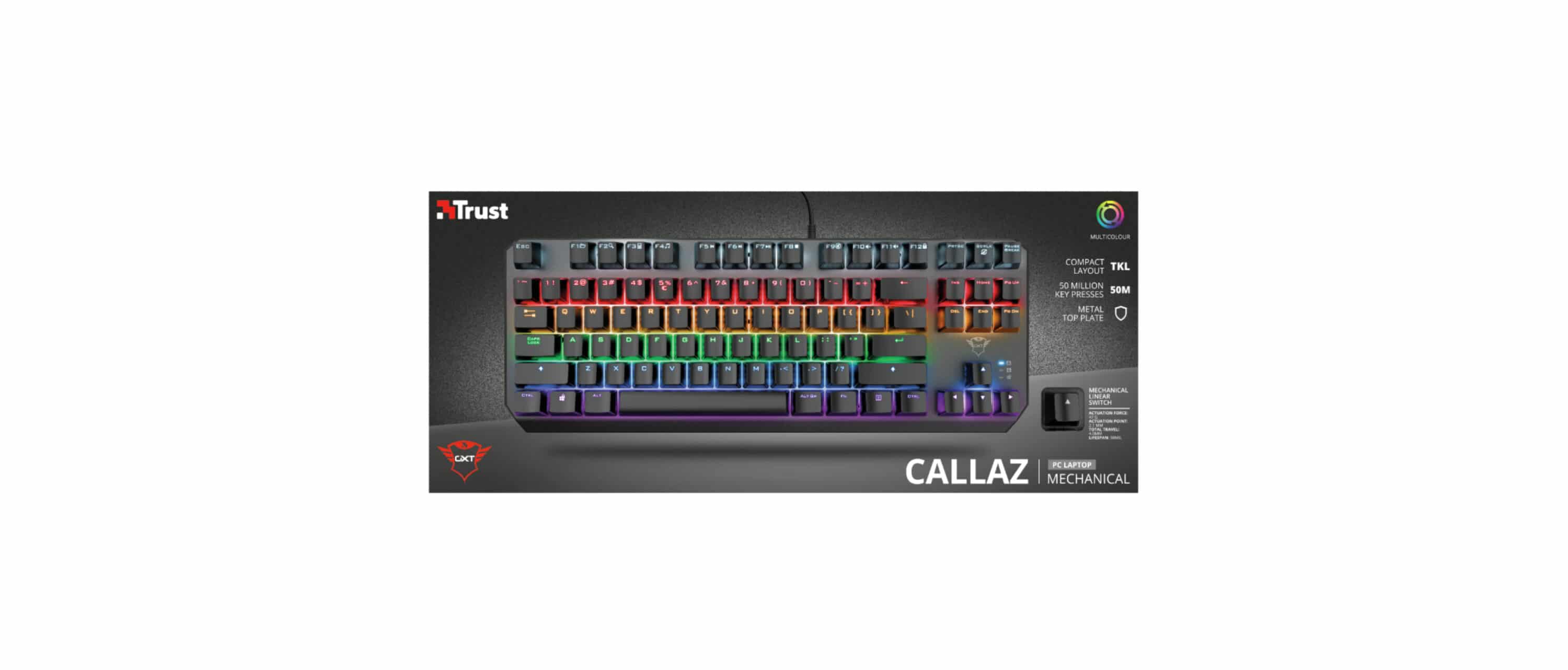 With the GXT 834 Callaz, we take a look at a newcomer on the gaming market. The compact gaming keyboard from Trust has a solid basic configuration, which we will discuss in more detail later in this review. Mechanical switches and RGB lighting in rainbow colors equip the Tenkeyless gaming keyboard for use in the home gaming corner. With an MSRP of €49.99, the GXT 834 makes an interesting addition to the budget range. You can find out how the Trust GXT 834 Callaz fares in our test in the following review.